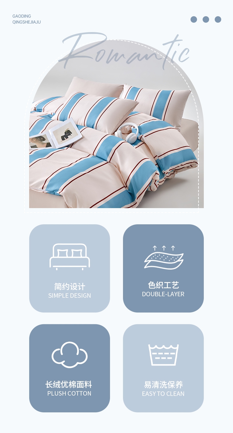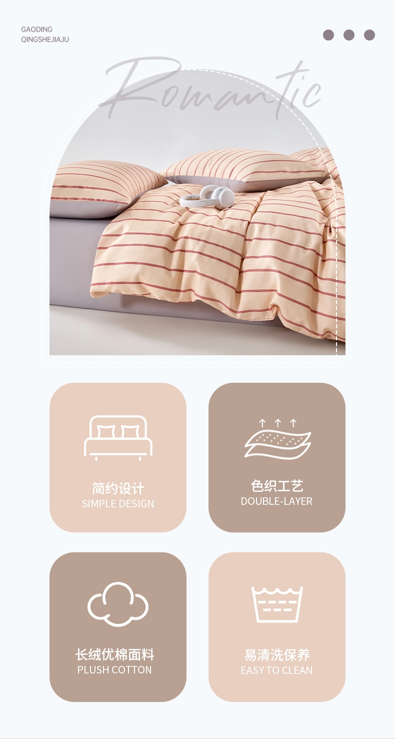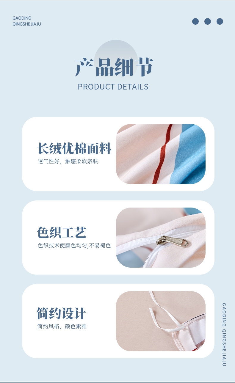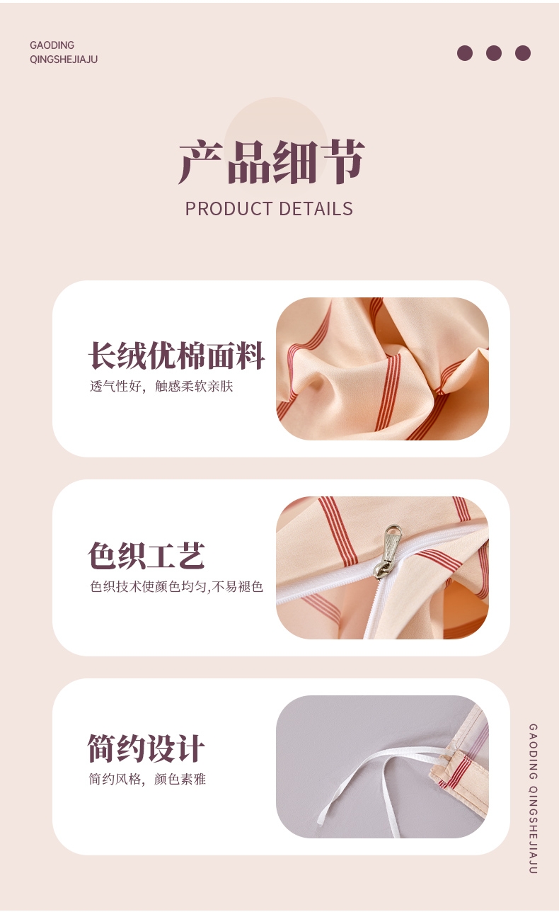 长绒棉面料,密度高,手感好,更细腻,品质的代表。 ;精致的做工,用心的细节处理,让产品额外出彩.;花型新风尚设计,传承与创新,让生活更精彩。