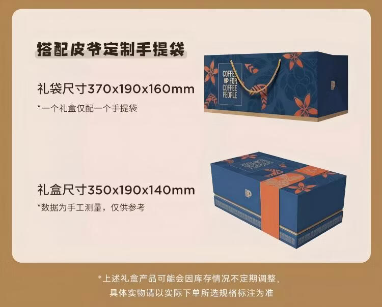 配置:皮爷挂耳咖啡(口味随机)50g/盒 *2 门店同款胖胖杯12oz(白色)*1 定制礼盒+手拎袋*1(蓝/白随机)