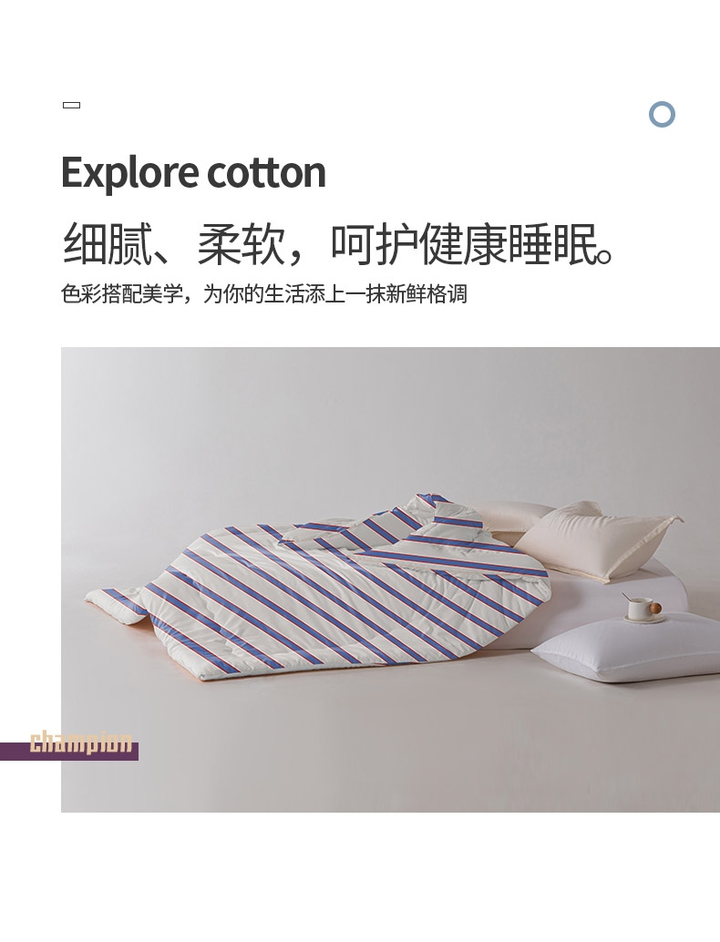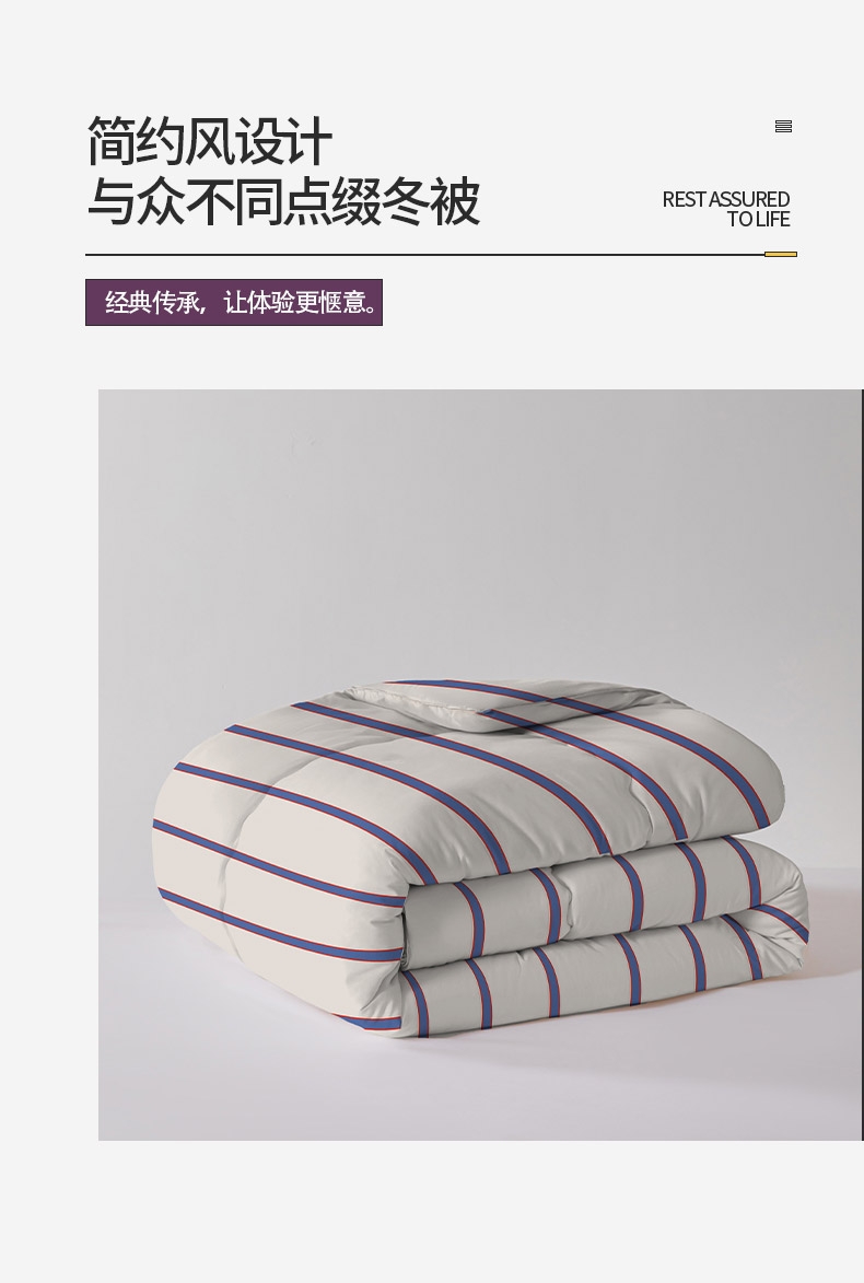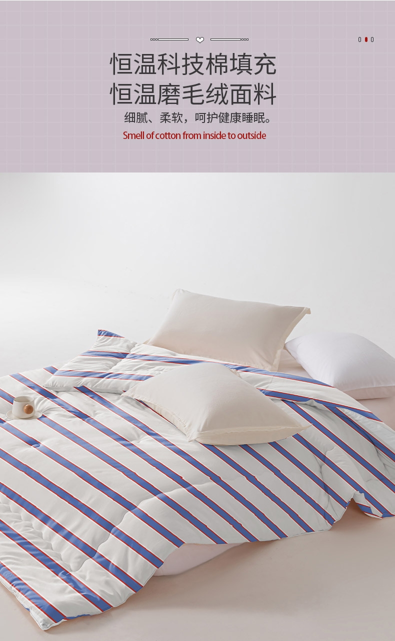 恒温磨毛绒面料,细腻、柔软,呵护健康睡眠。;整张蚕茧蛋白棉填充,有机,丝滑,冬日更贴心的呵护。;条纹风设计,经典传承,让体验更惬意。