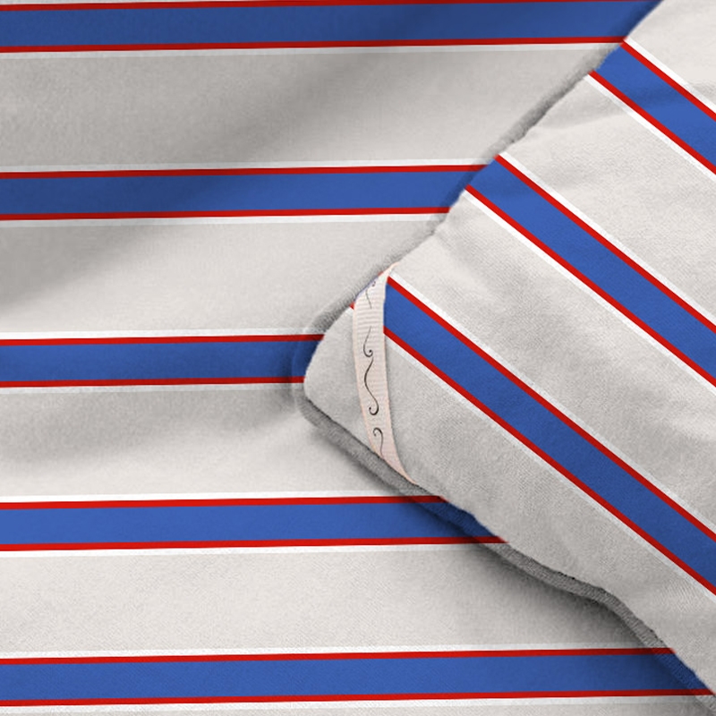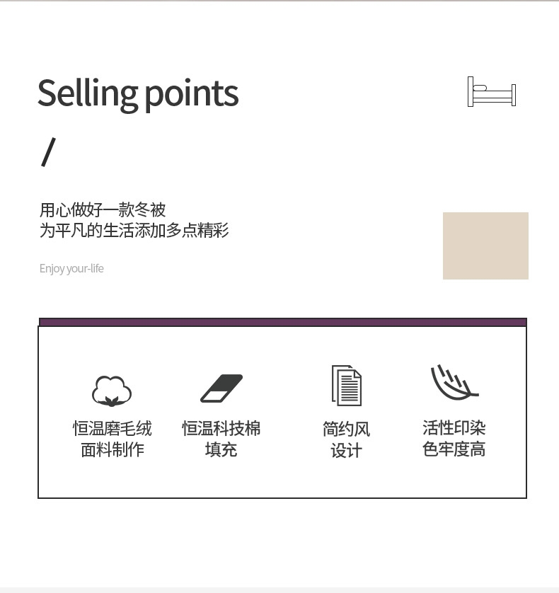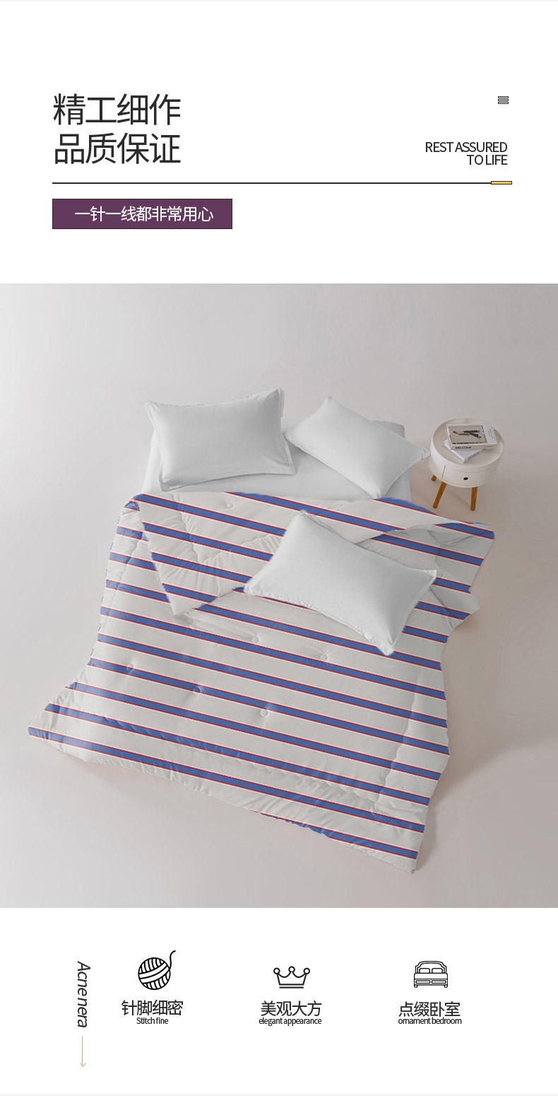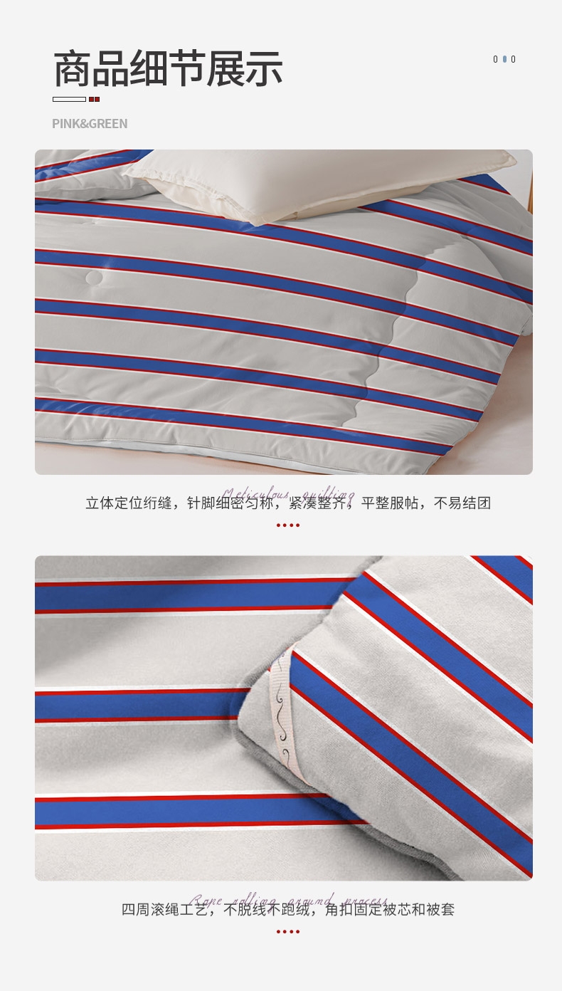 恒温磨毛绒面料,细腻、柔软,呵护健康睡眠。;整张蚕茧蛋白棉填充,有机,丝滑,冬日更贴心的呵护。;条纹风设计,经典传承,让体验更惬意。