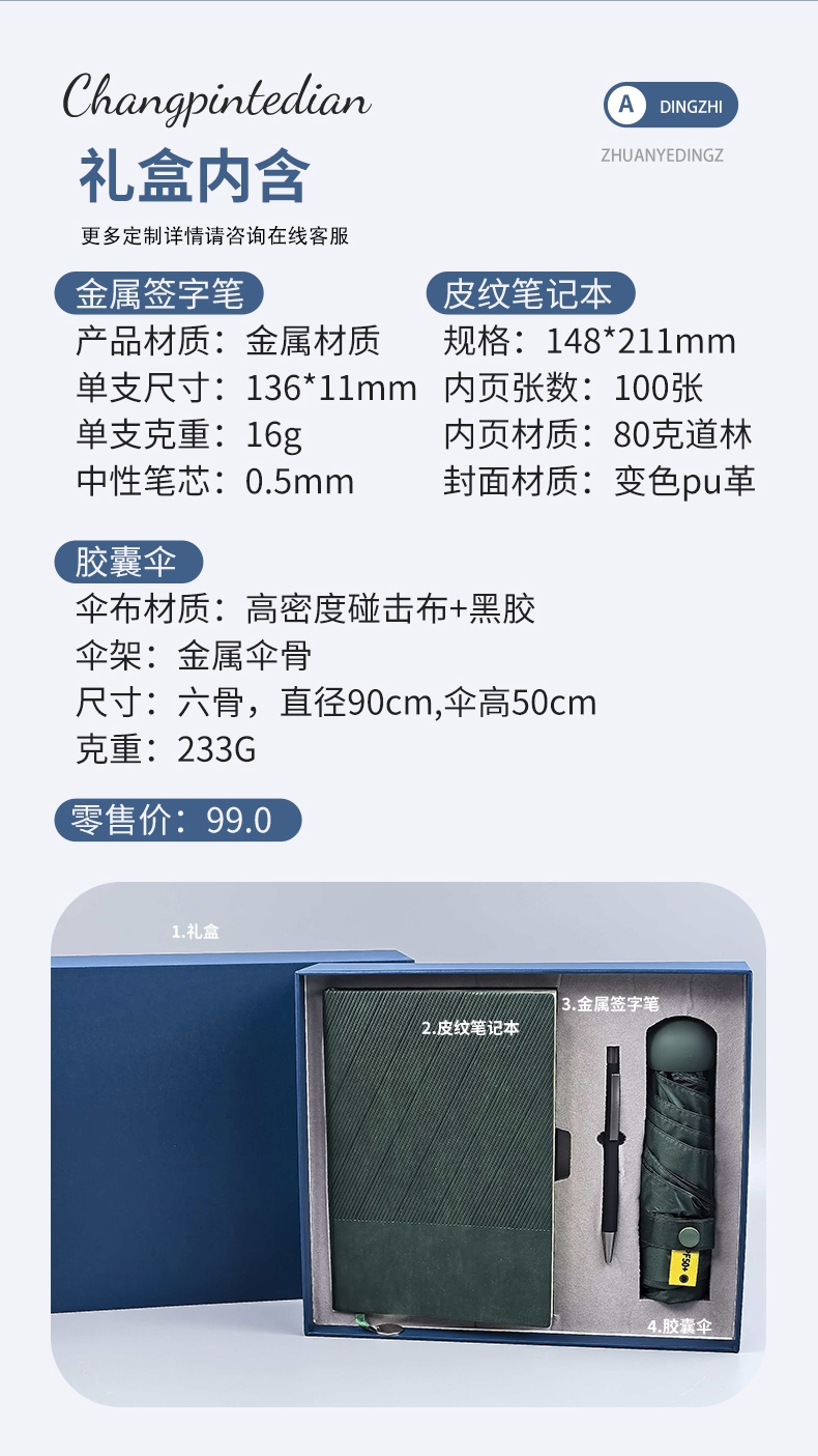 配置清单:记事本*1 签字笔*1 晴雨伞*1