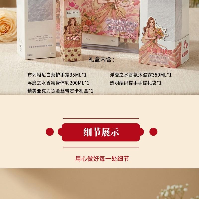 组合:布列塔尼白茶护手霜35ML*1、浮靡之水香氛沐浴露350ML*1、浮靡之水香氛身体乳200ML*1
