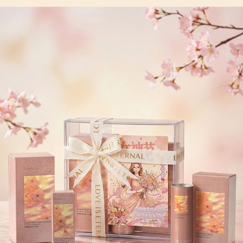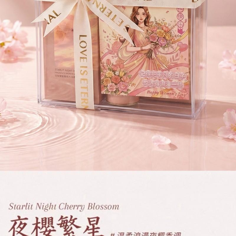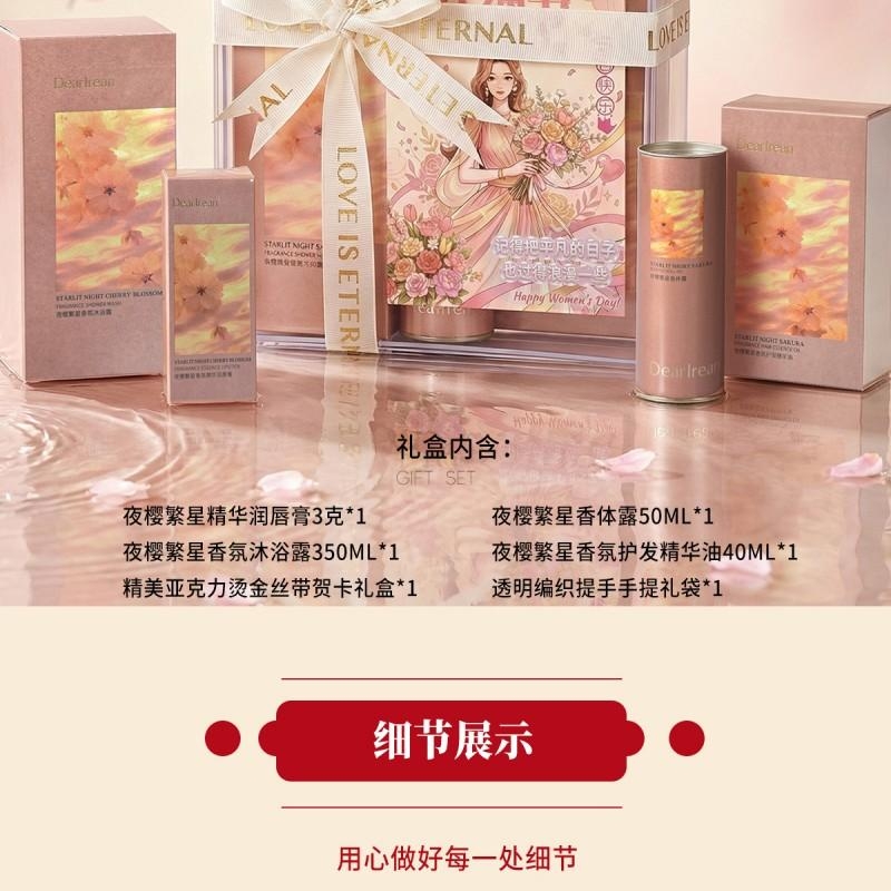 组合:夜樱繁星香体露50ML*1、夜樱繁星精华润唇膏3g*1、夜樱繁星香氛沐浴露350ML*1、夜樱繁星香氛护发精华油40ML*1