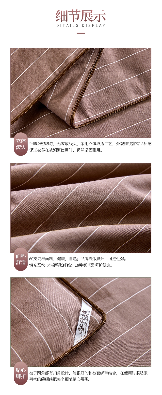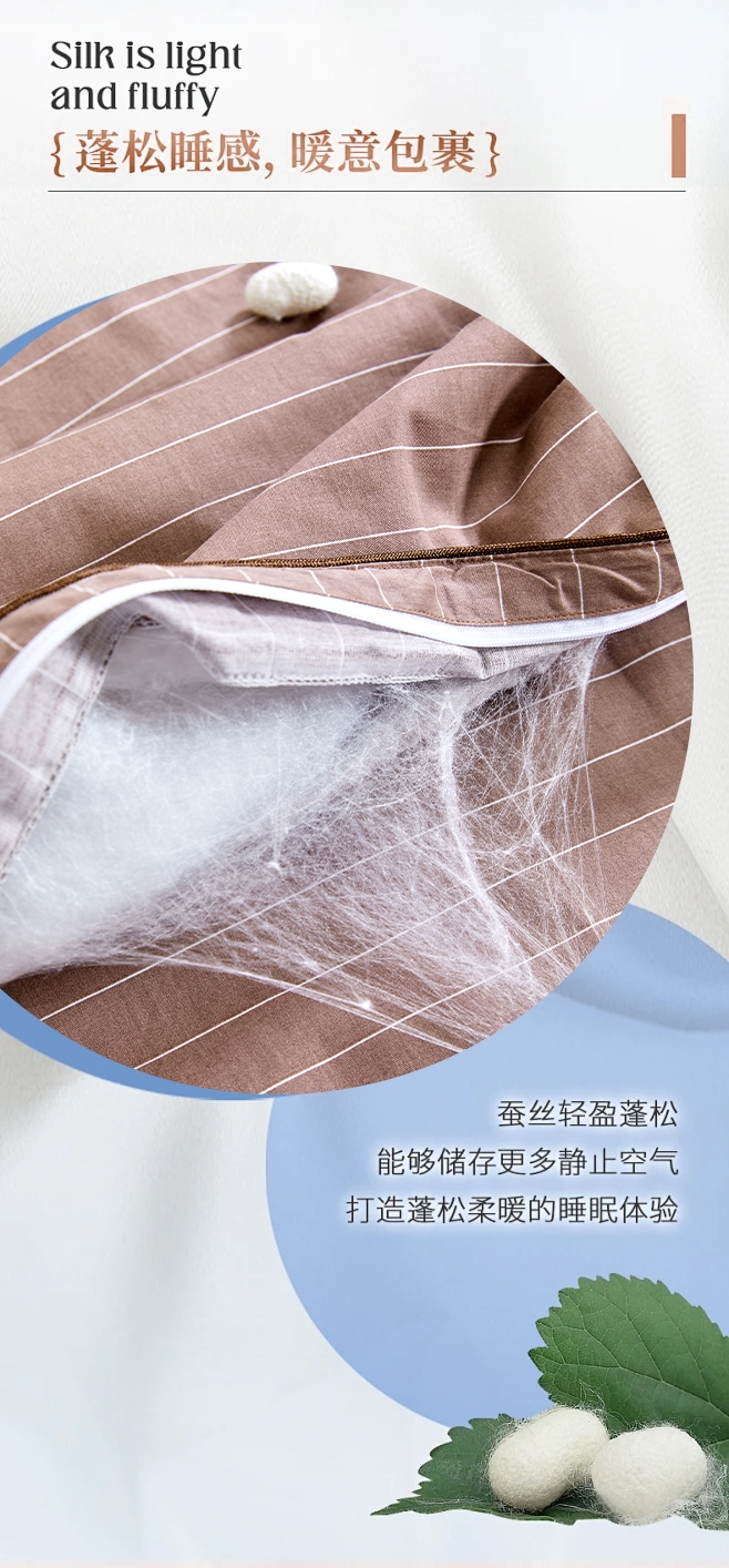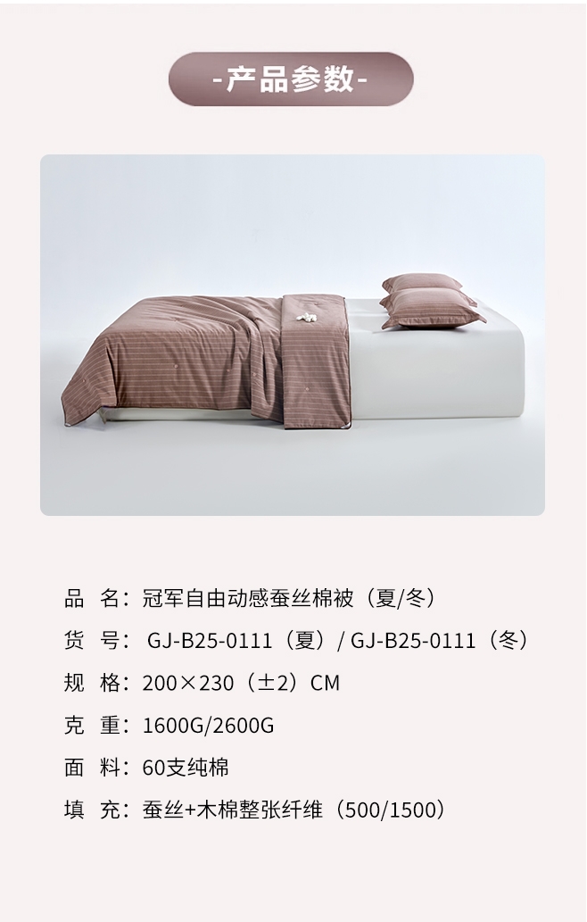60支纯棉面料,高密度磨毛工艺,手感细腻,冬日必选;填充含蚕丝,18种氨基酸,有效的呵护我们睡眠和健康;精细工艺,用心细节,高品质代表。