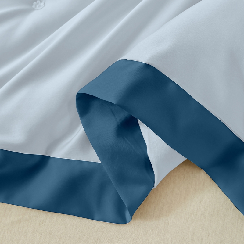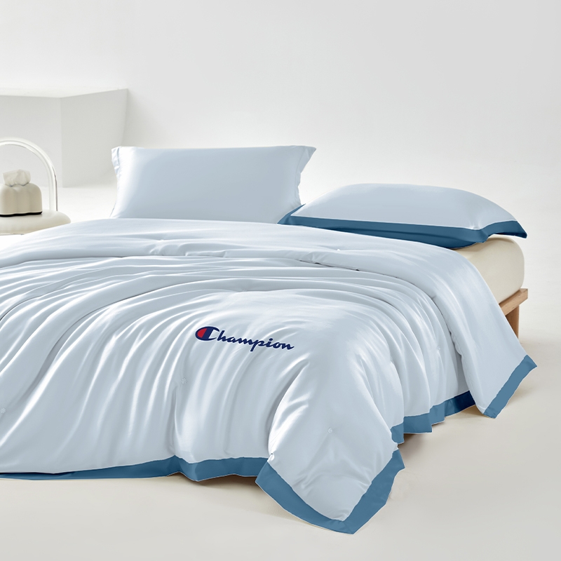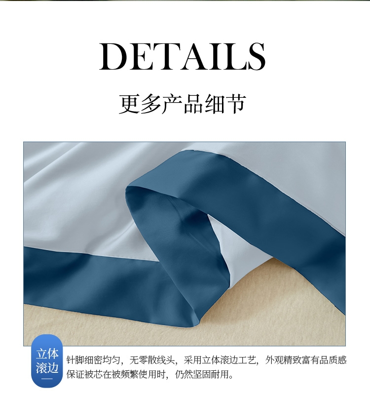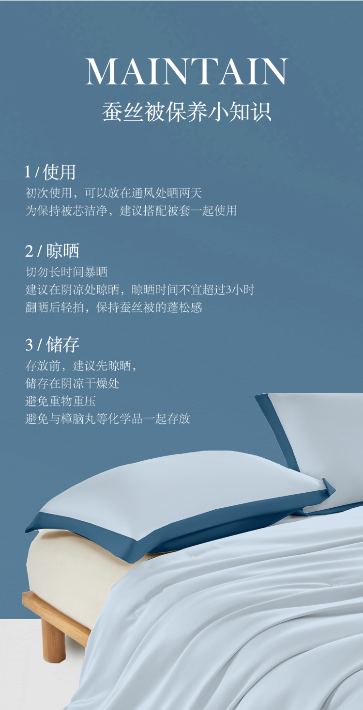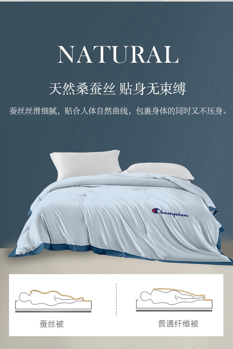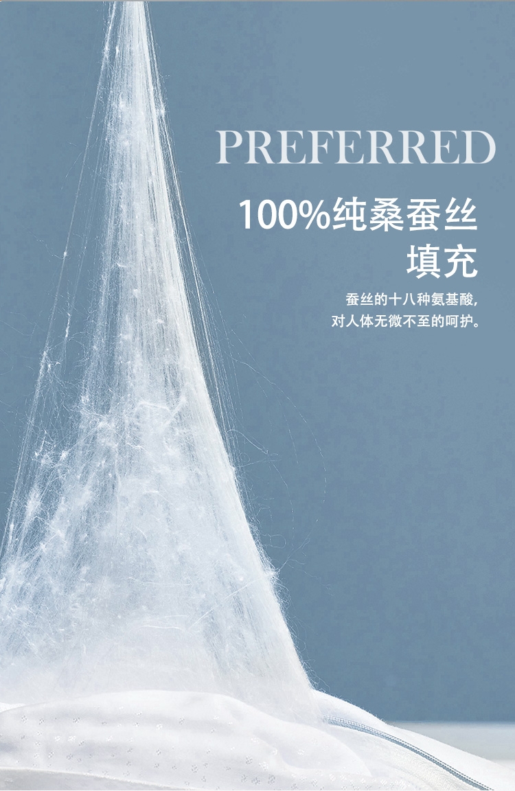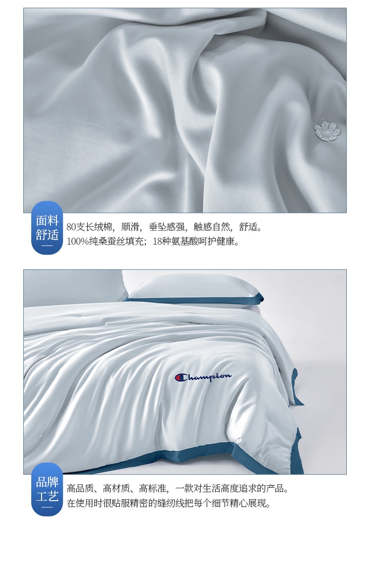 80支长绒棉面料,手感顺滑,垂坠感强。;填充100%纯蚕丝,18种氨基酸,有效的呵护; 宽边设计,撞色处理,被子更大气。
