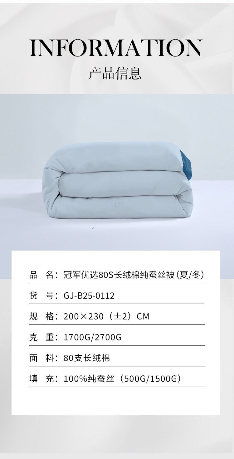 冠军(Champion) 优选80S长绒棉纯蚕丝被GJ-B25-0112(冬)