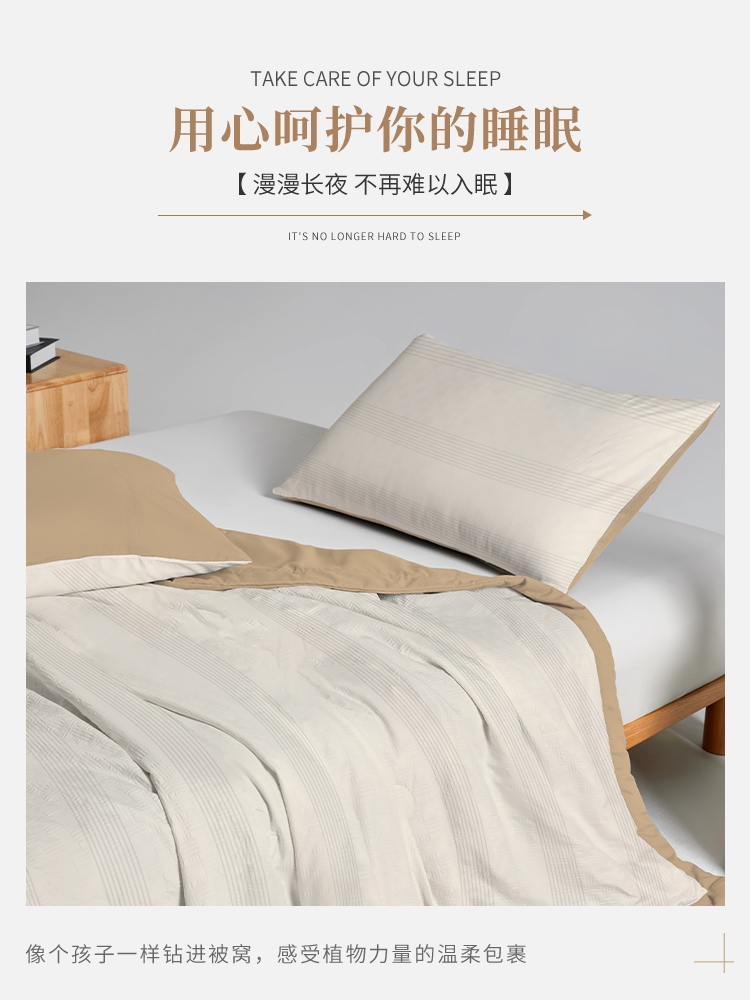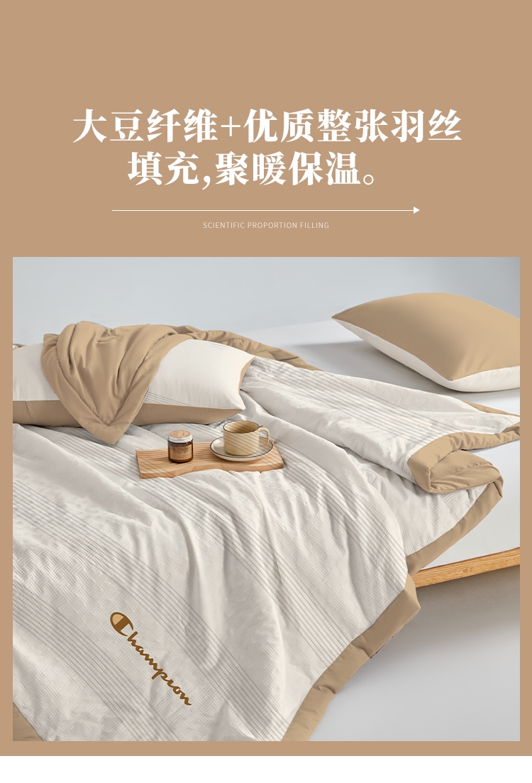 大豆纤维-“软黄金”填充,科学配比,聚暖保温。 ;优质整张羽丝棉填充。;无染水洗面料,亲肤细腻,肌肤感知自然柔软力。