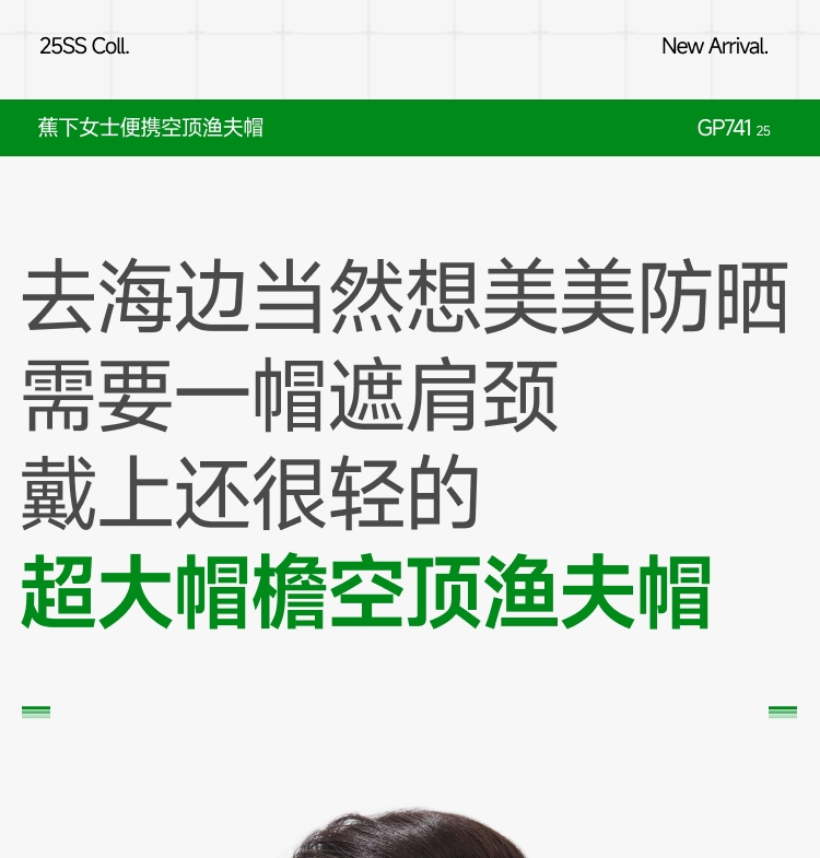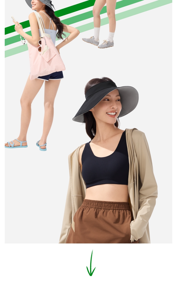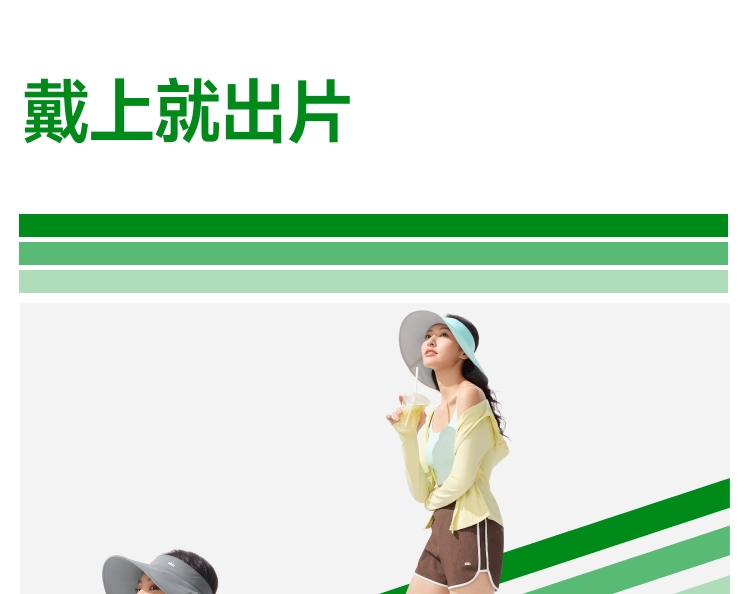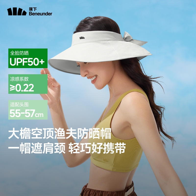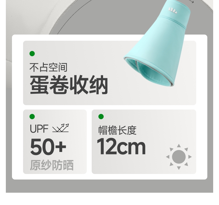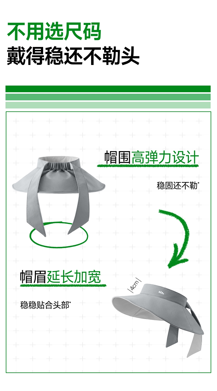 帽围高弹力设计;12cm加大帽檐防晒至锁骨 戴着也没感觉轻≈58g;UPF50 +原纱防晒 水洗不减防晒力