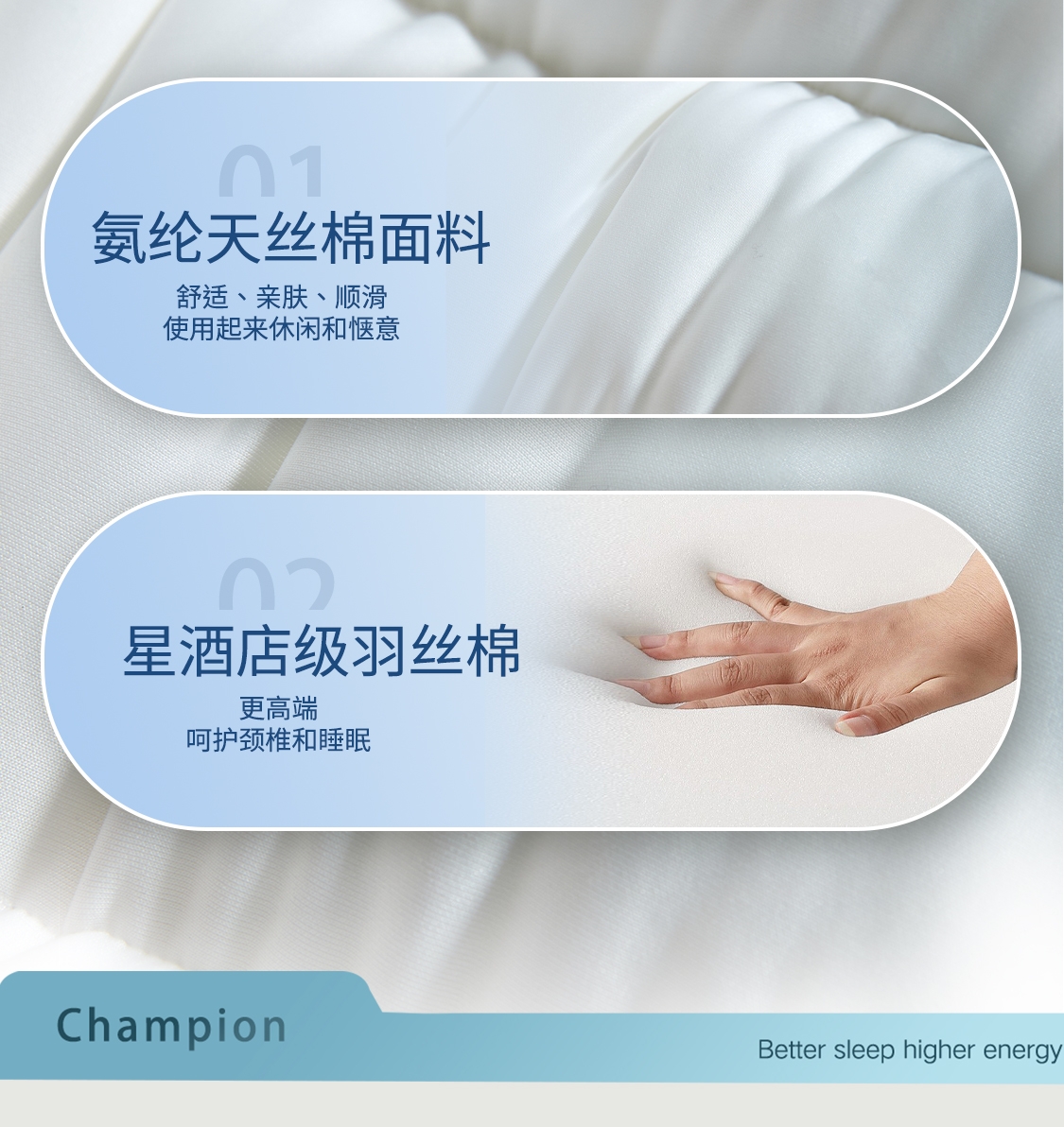 五星酒店级羽丝棉填充,跟蓬松柔软。;氨纶天丝棉面料,健康,自然,使用更舒适。;精细工艺,用心细节,高品质代表。