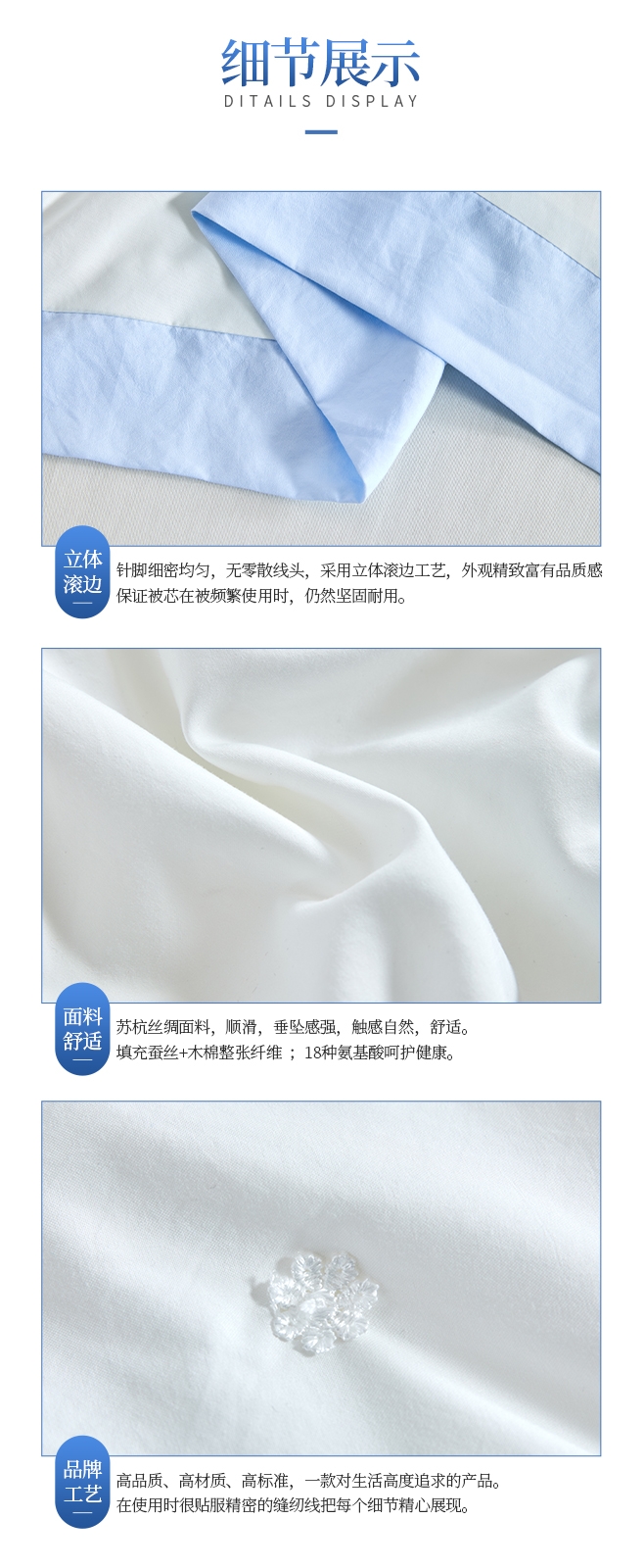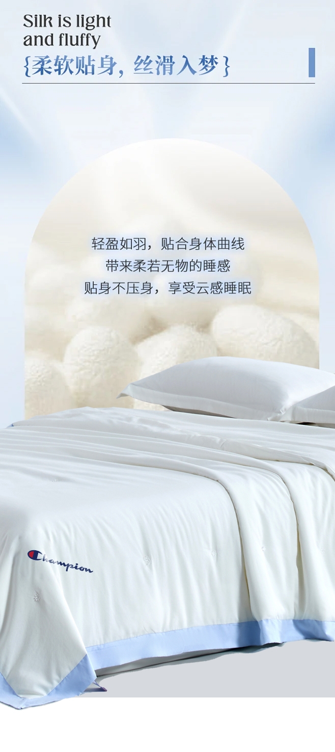 苏杭丝绸面料,手感顺滑,垂坠感强。 ;填充含蚕丝,18种氨基酸,有效的呵护我们睡眠和健康;精细工艺,用心细节,高品质代表。