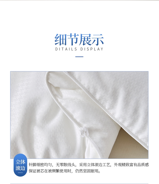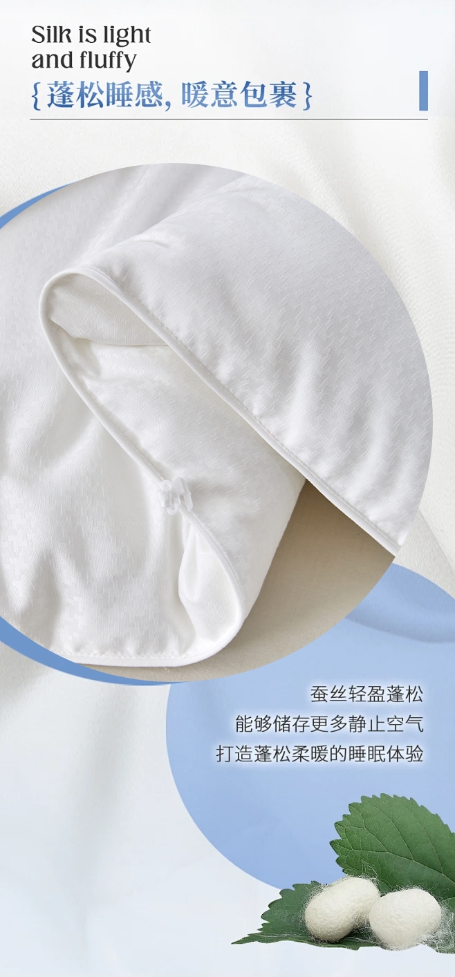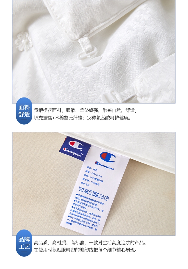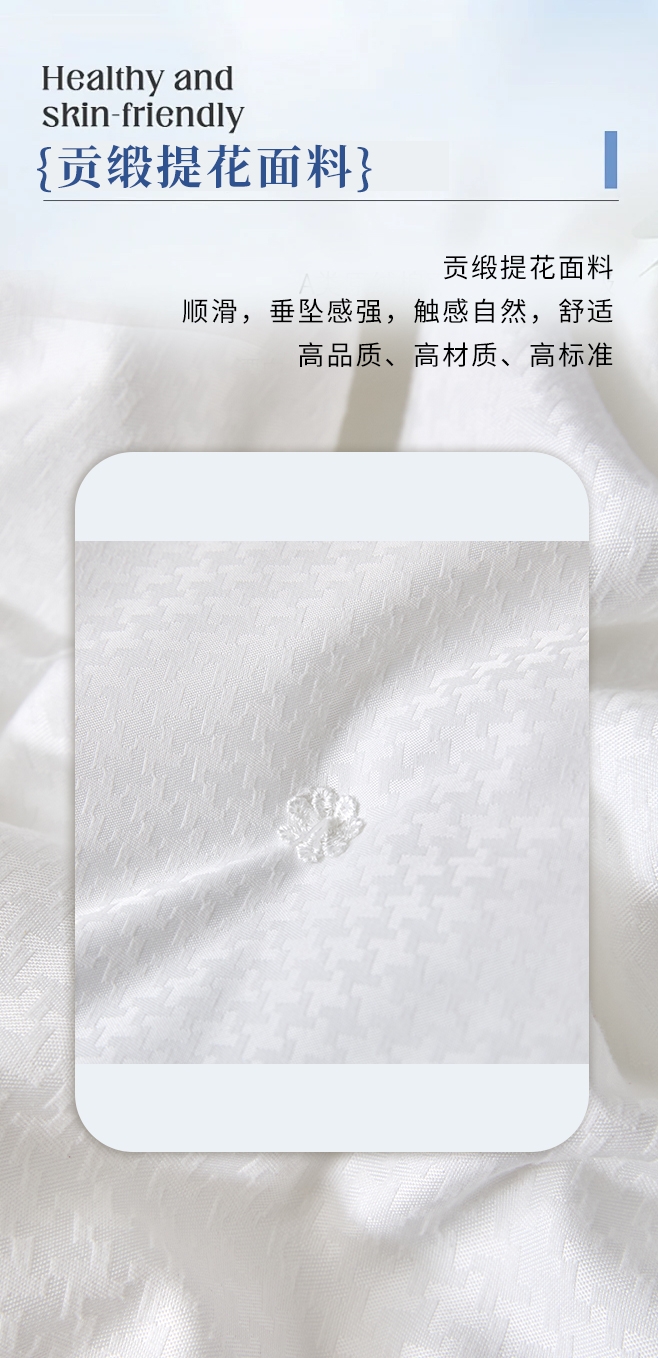 贡缎提花面料,手感顺滑,垂坠感强。;填充含蚕丝,18种氨基酸,有效的呵护我们睡眠和健康;精细工艺,用心细节,高品质代表。