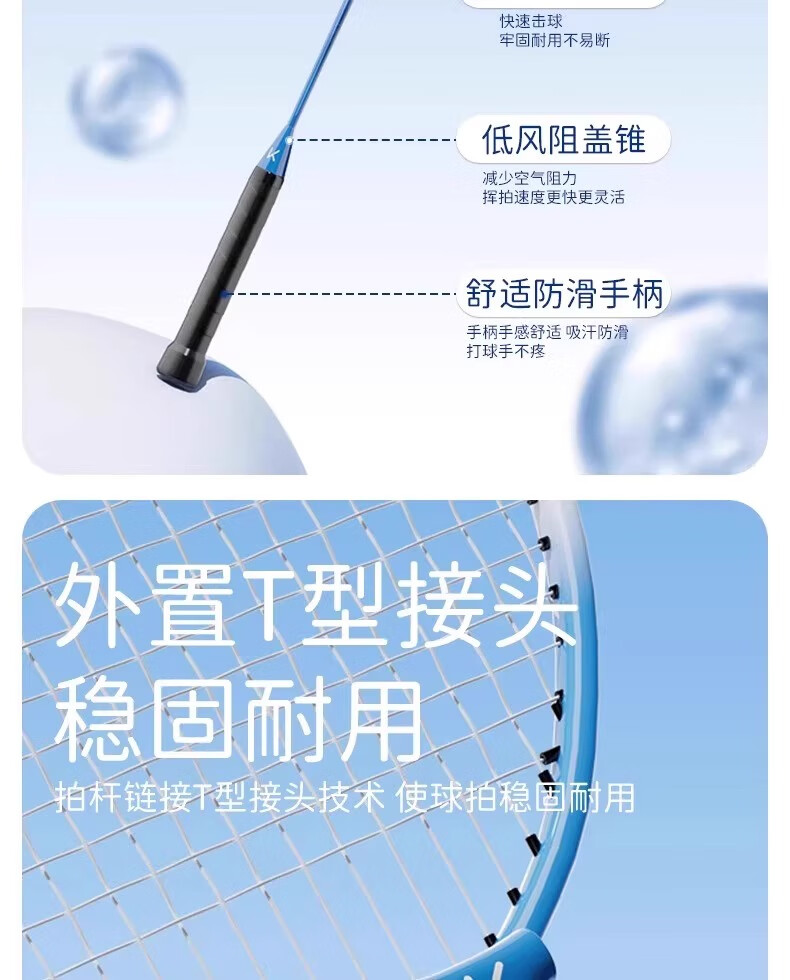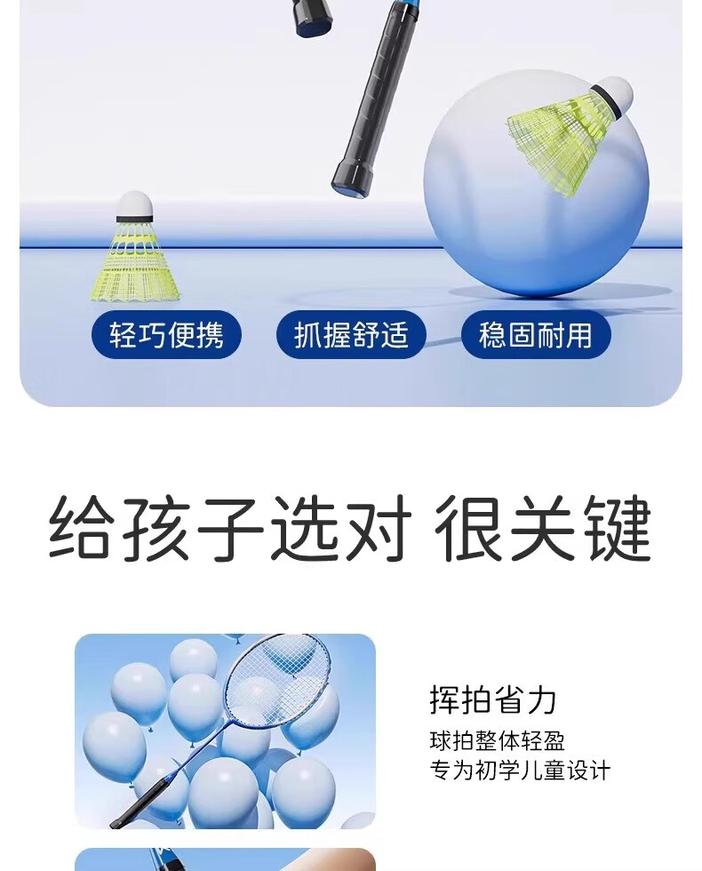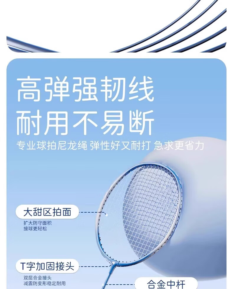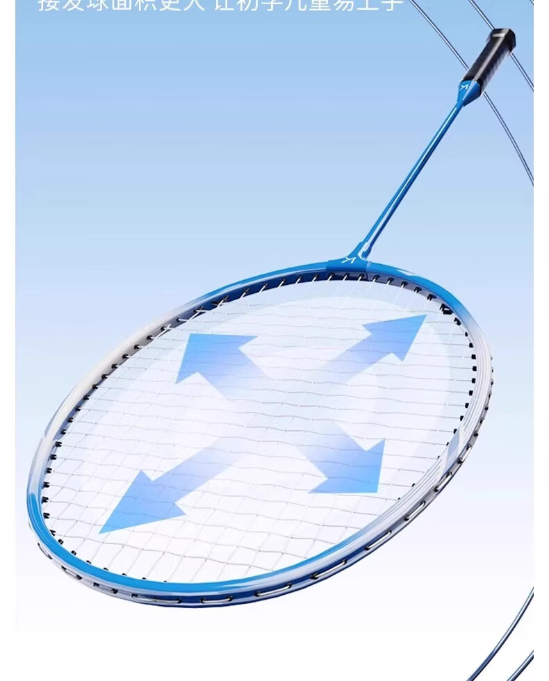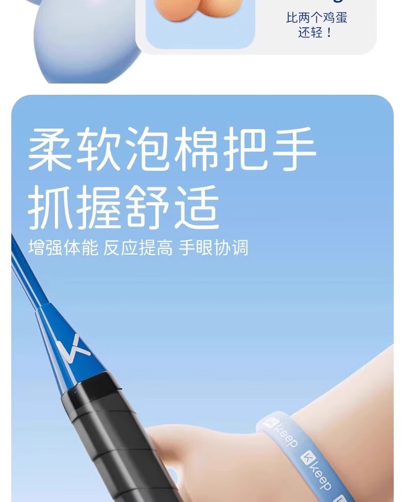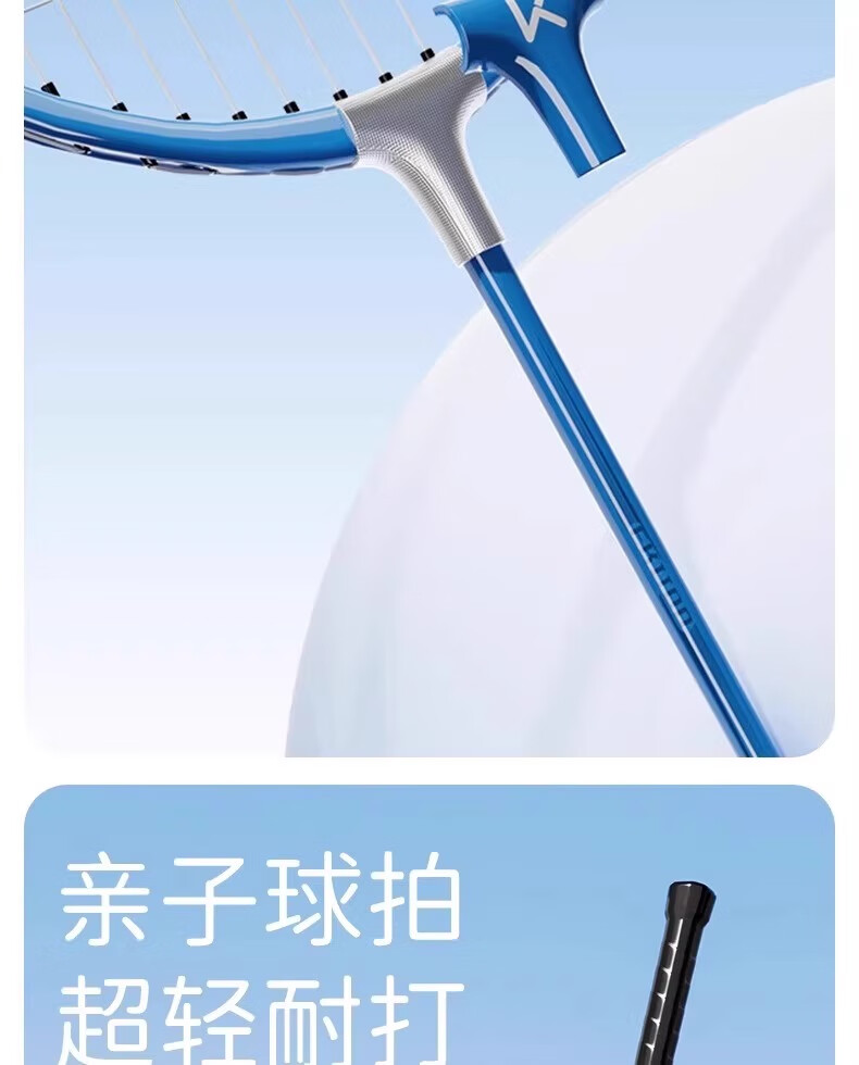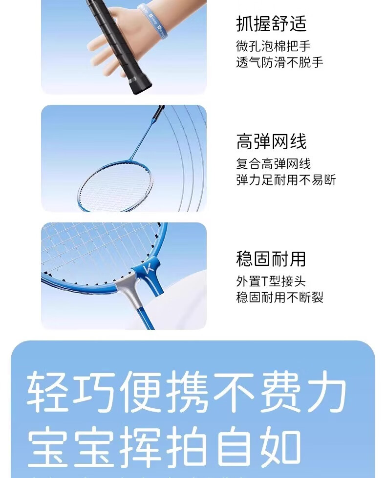 加大拍面,接球更轻松;柔软泡棉把手,抓握舒适;高弹强韧线,耐用不易断