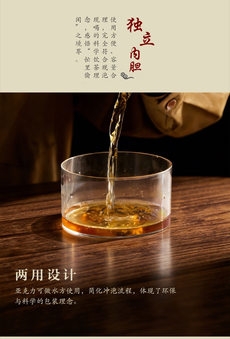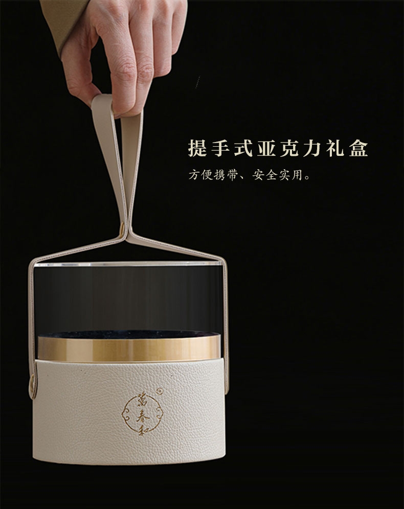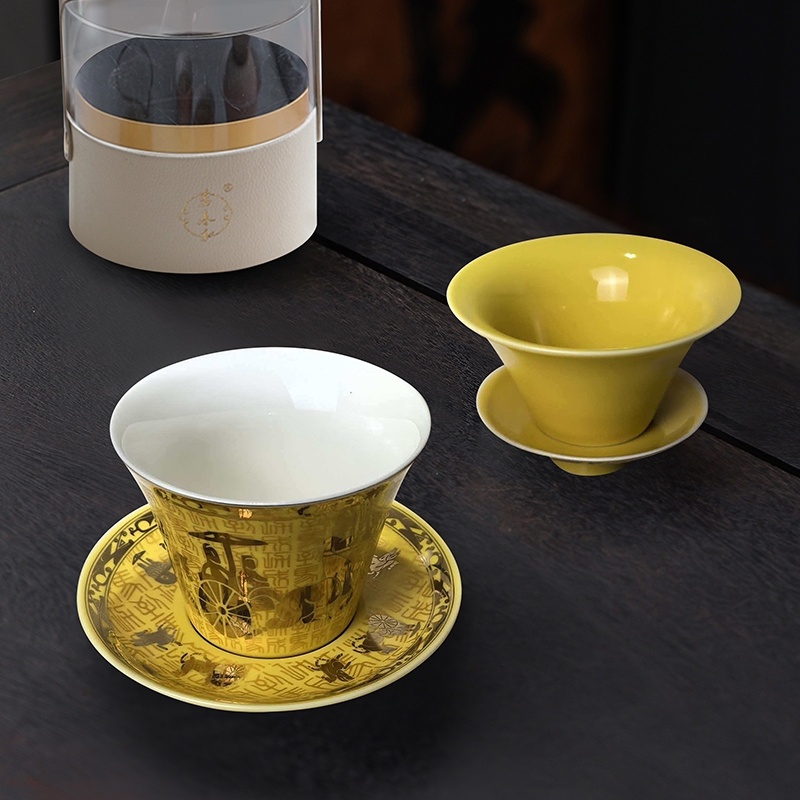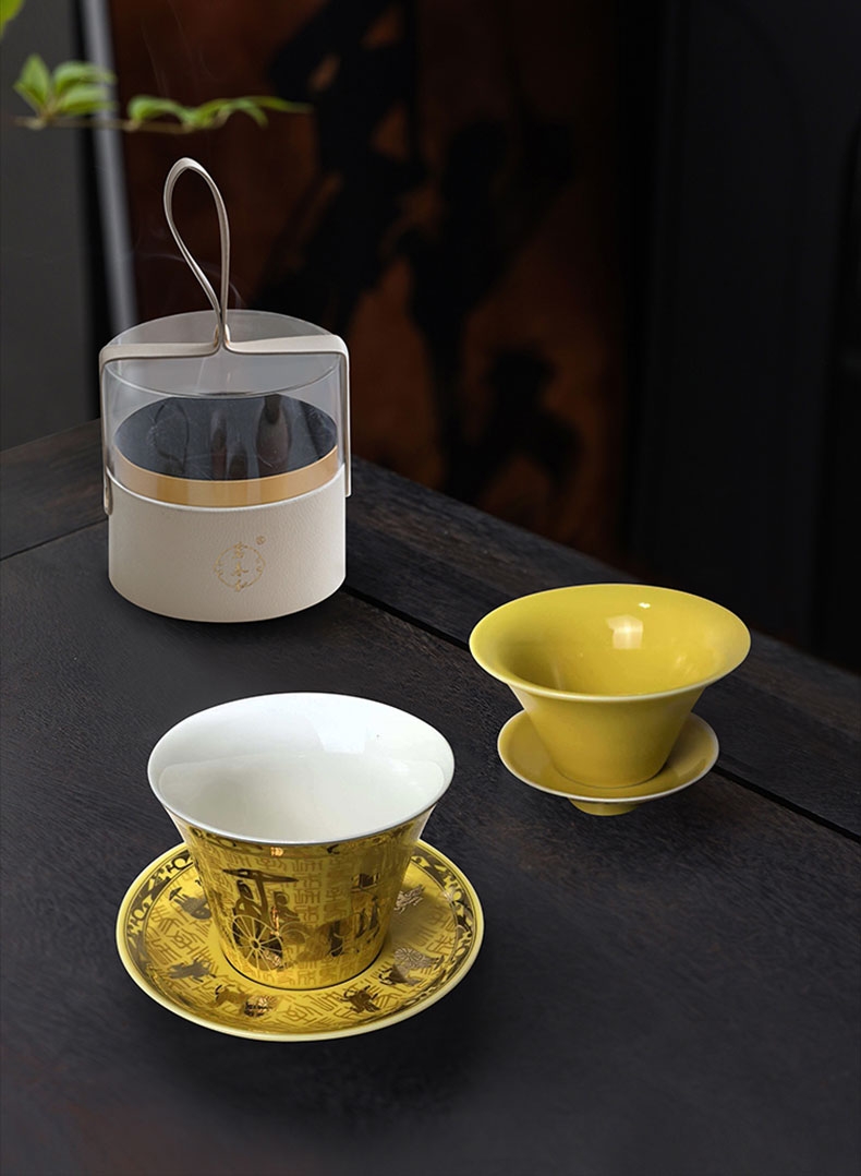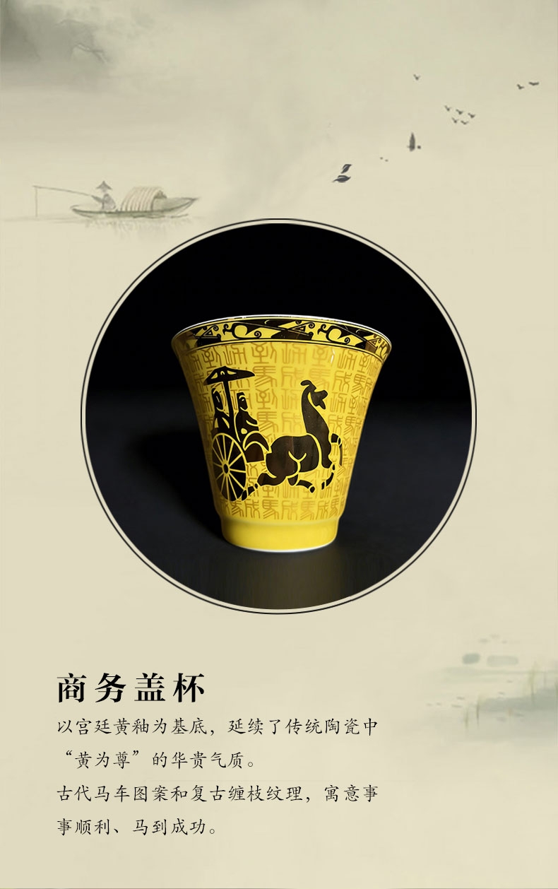 商务盖杯以宫廷黄釉为基底,古图纹饰,寓意顺遂成功;过滤式商务杯,使用方便,现泡现喝享闲适;亚克力礼盒:显茶器雅,可作水方,环保科学。
