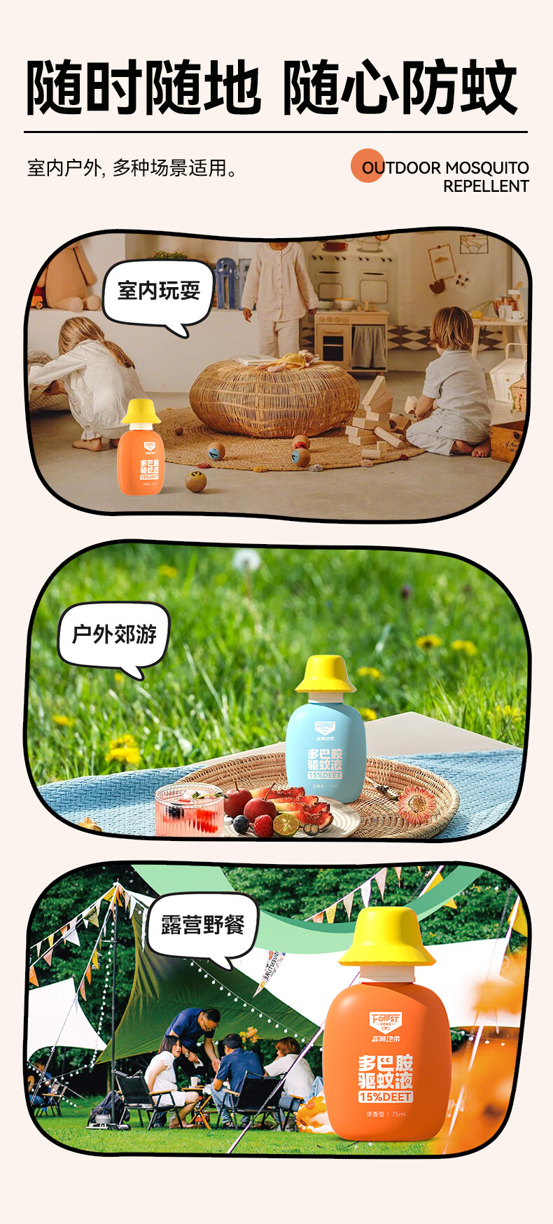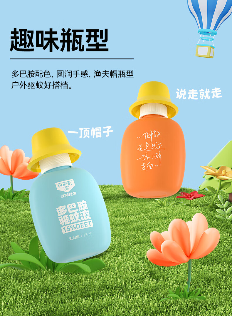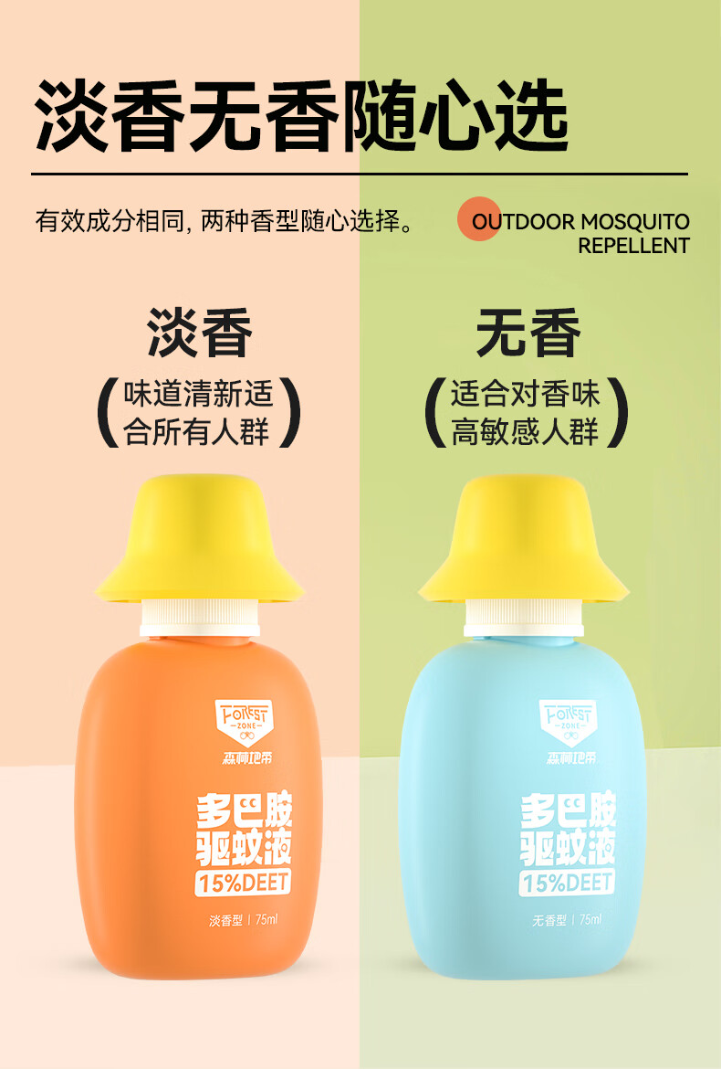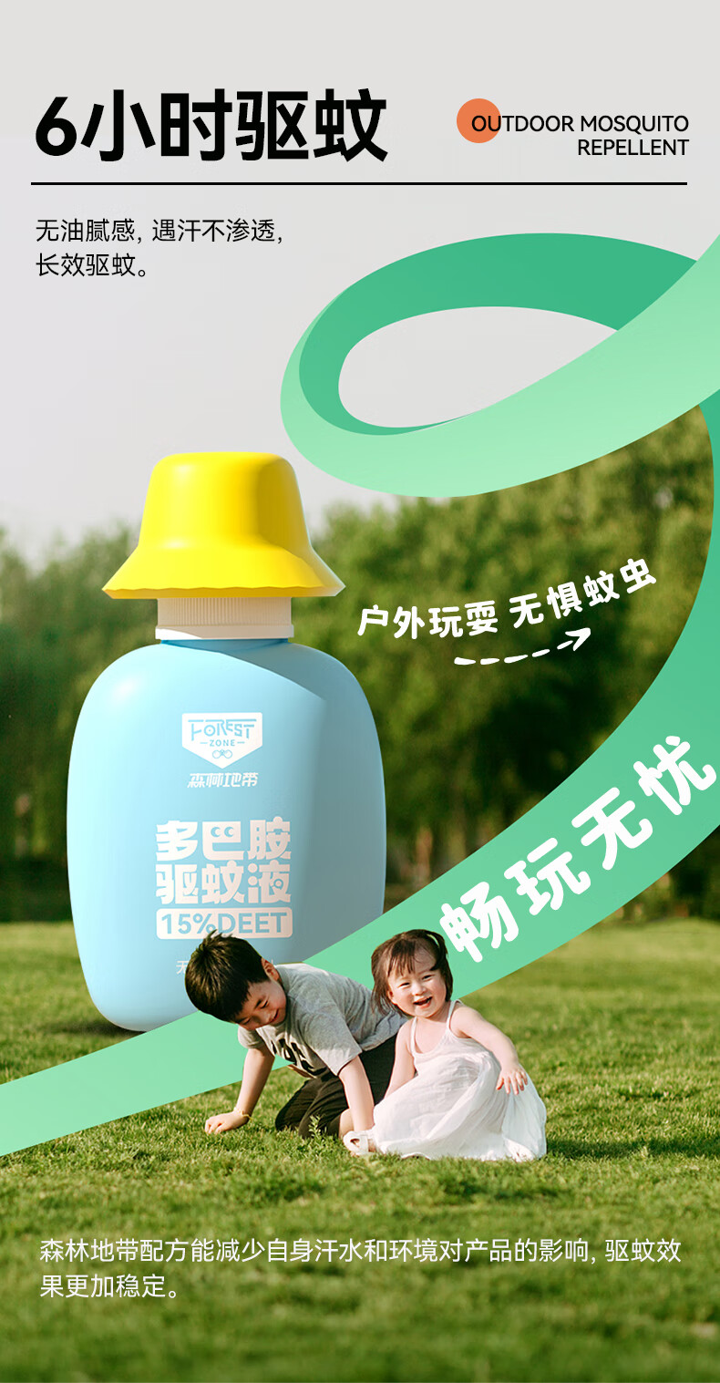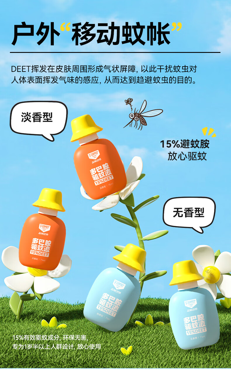 走完亚马逊河第一人-德爷代言品牌;产品全新升级-添加独有15%避蚊胺,国内最高浓度;花果型淡香,清新不刺鼻,清爽不黏腻