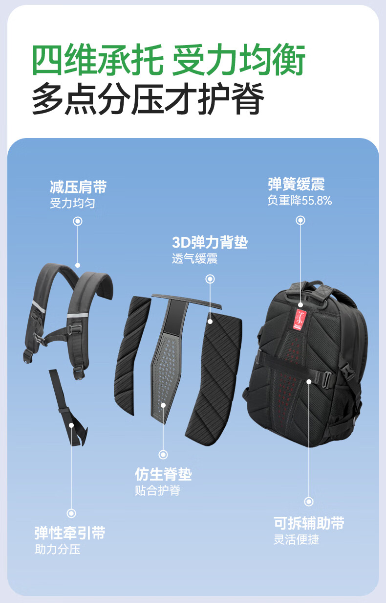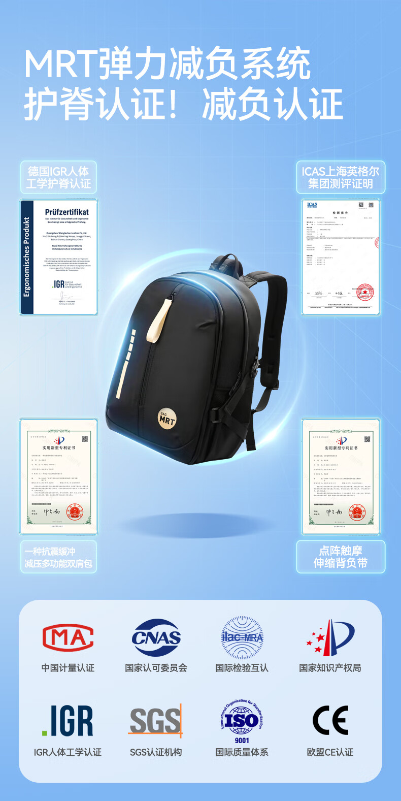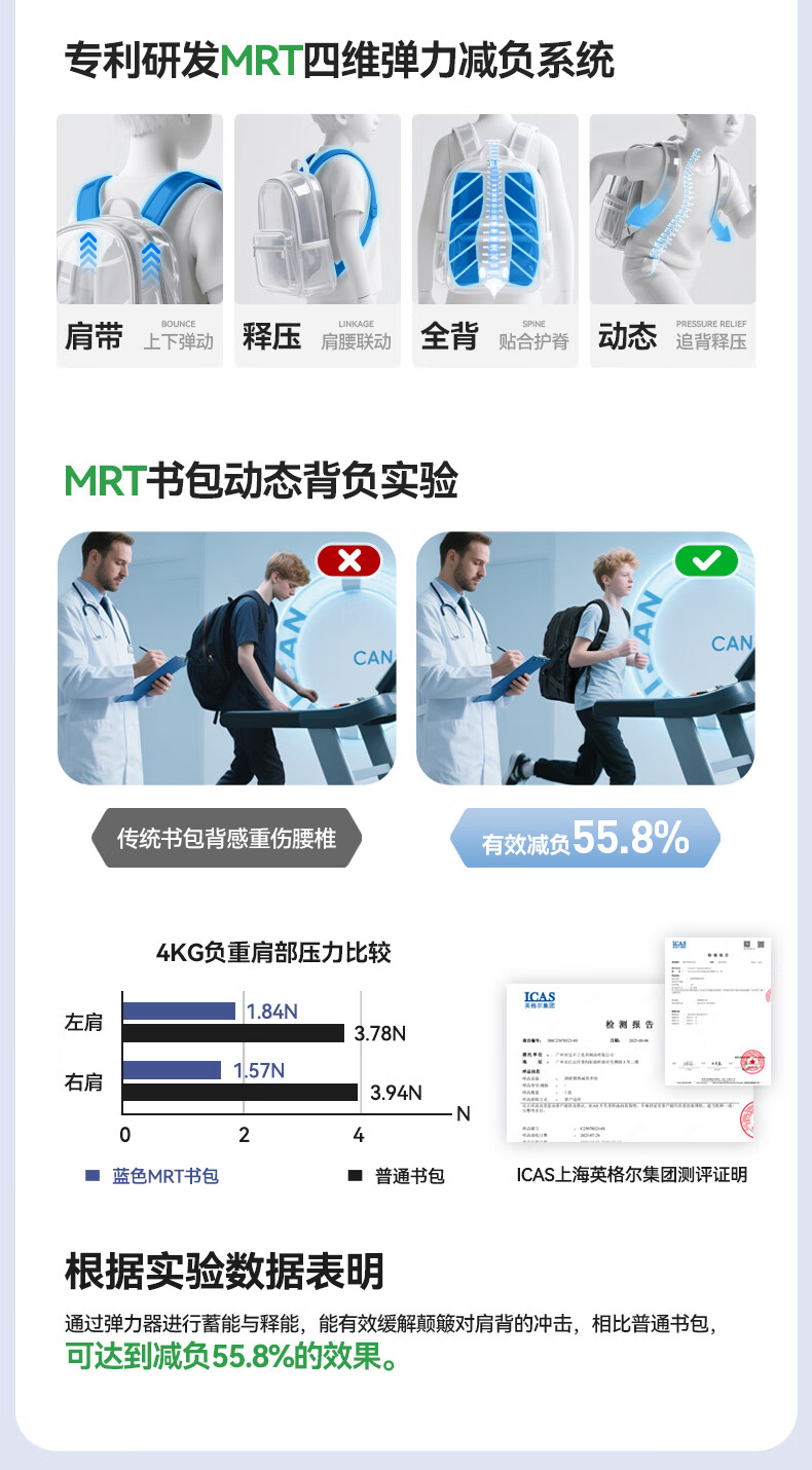 四维弹力系统减负55.8%;MRT弹力减负系统护脊认证!减负认证;四维承托受力均衡多点分压才护脊