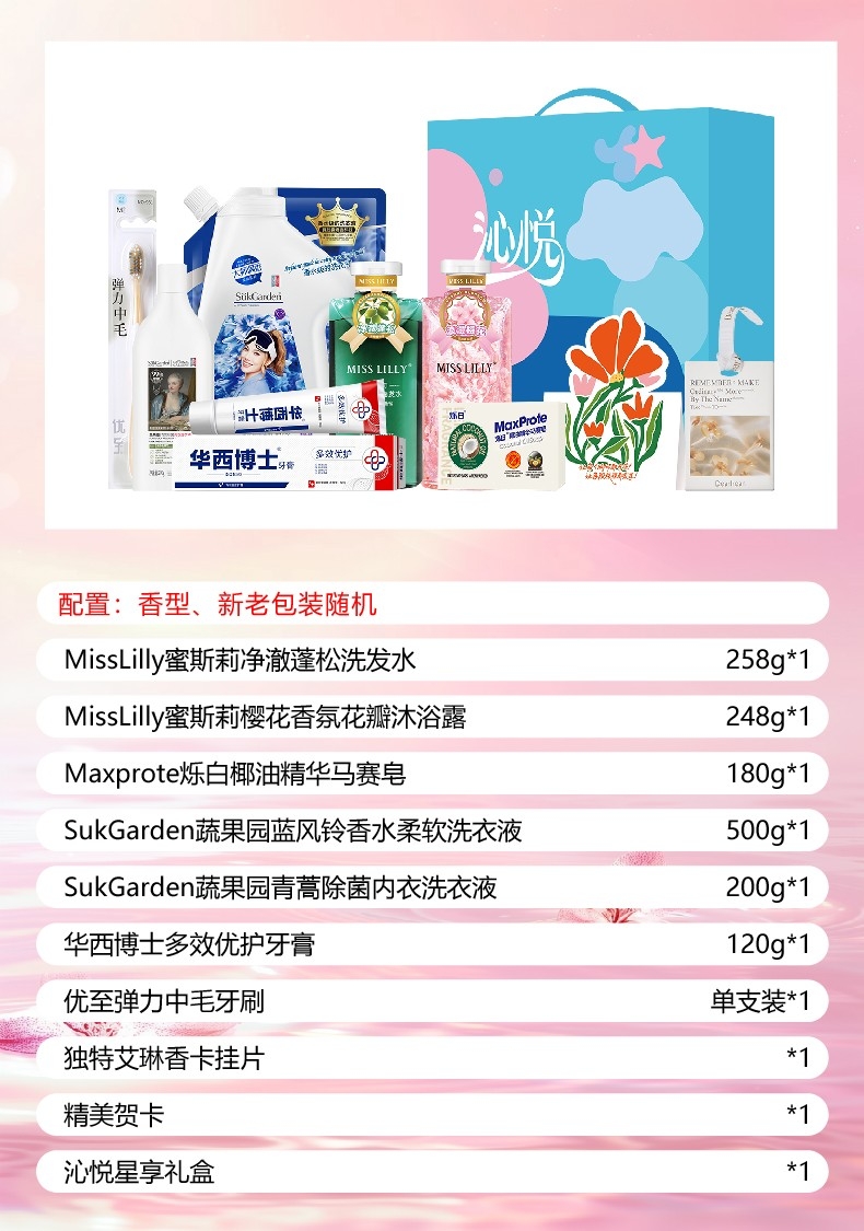 配置清单:MissLilly蜜斯莉净澈蓬松洗发水258g*1 MissLilly蜜斯莉樱花香氛花瓣沐浴露248g*1 Maxprote烁白椰油精华马赛皂180g*1 SukGarden蔬果园蓝风铃香水柔软洗衣液(持久留香)(带嘴) 500g*1 SukGarden蔬果园青蒿除菌内衣洗衣液-200g*1 华西博士多效优护牙膏120g*1 优至弹力中毛牙刷单支装*1 独特艾琳香卡挂片*1(赠品) 精美贺卡*1(量大可定制) 沁悦星享礼盒*1
