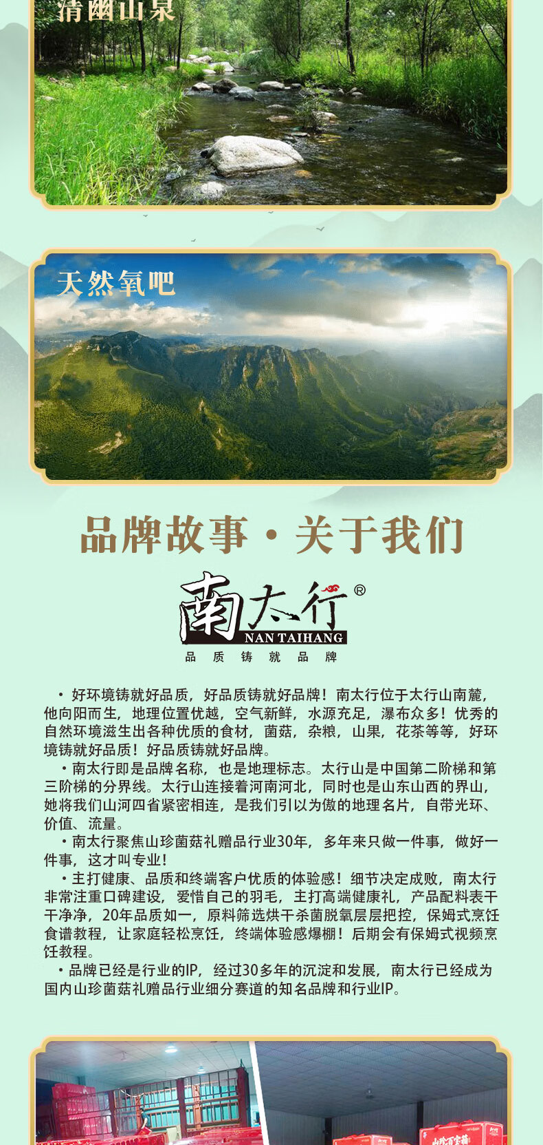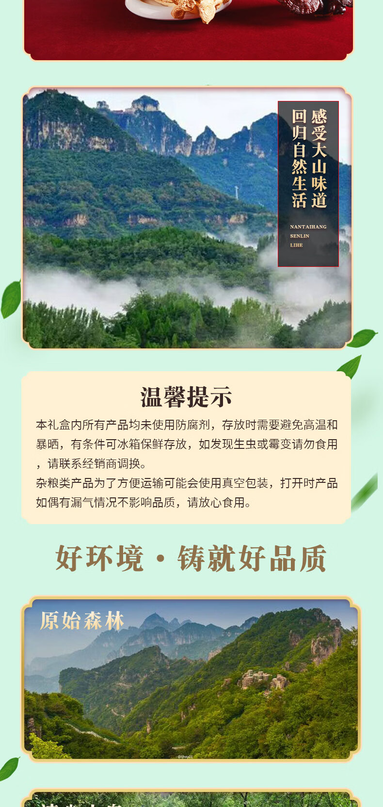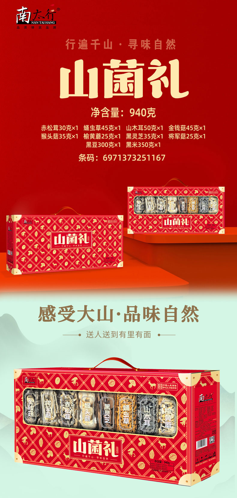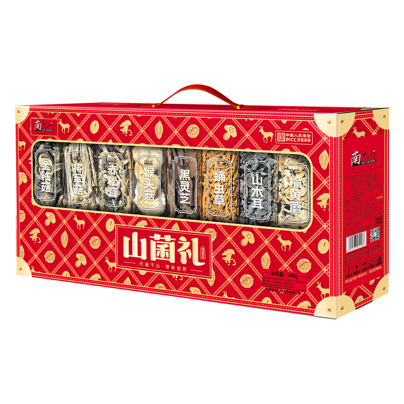 采用高档礼盒包装,长形大透窗设计;盒内精选8种山珍搭配两款甄选黑粮;严格筛选,品质上乘