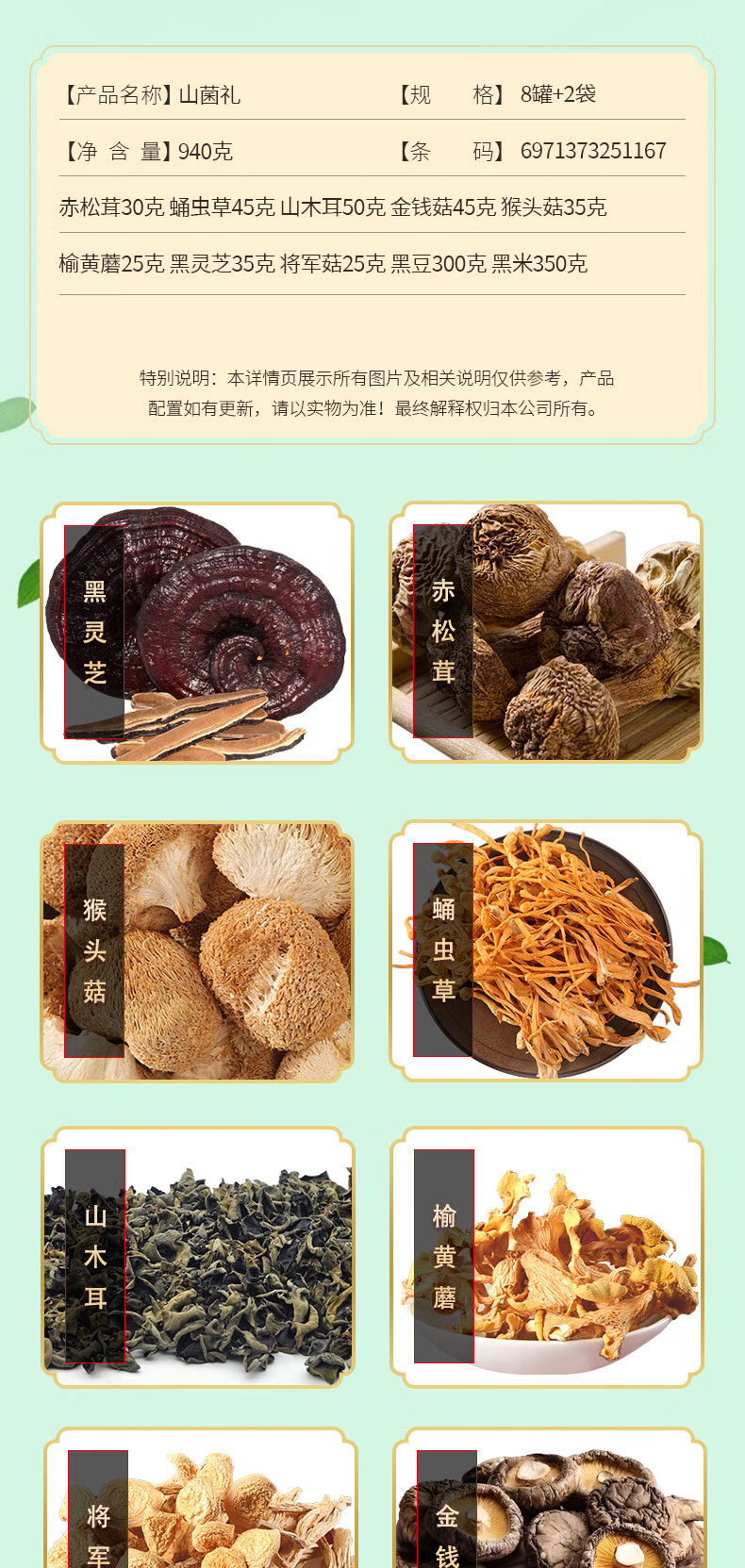 配置清单:赤松茸30克*1袋 蛹虫草45克*1袋 山木耳50克*1袋 金钱菇45克*1袋 猴头菇35克*1袋 榆黄蘑25克*1袋 黑灵芝35克*1袋 将军菇25克*1袋 黑豆300克*1袋 黑米350克*1袋