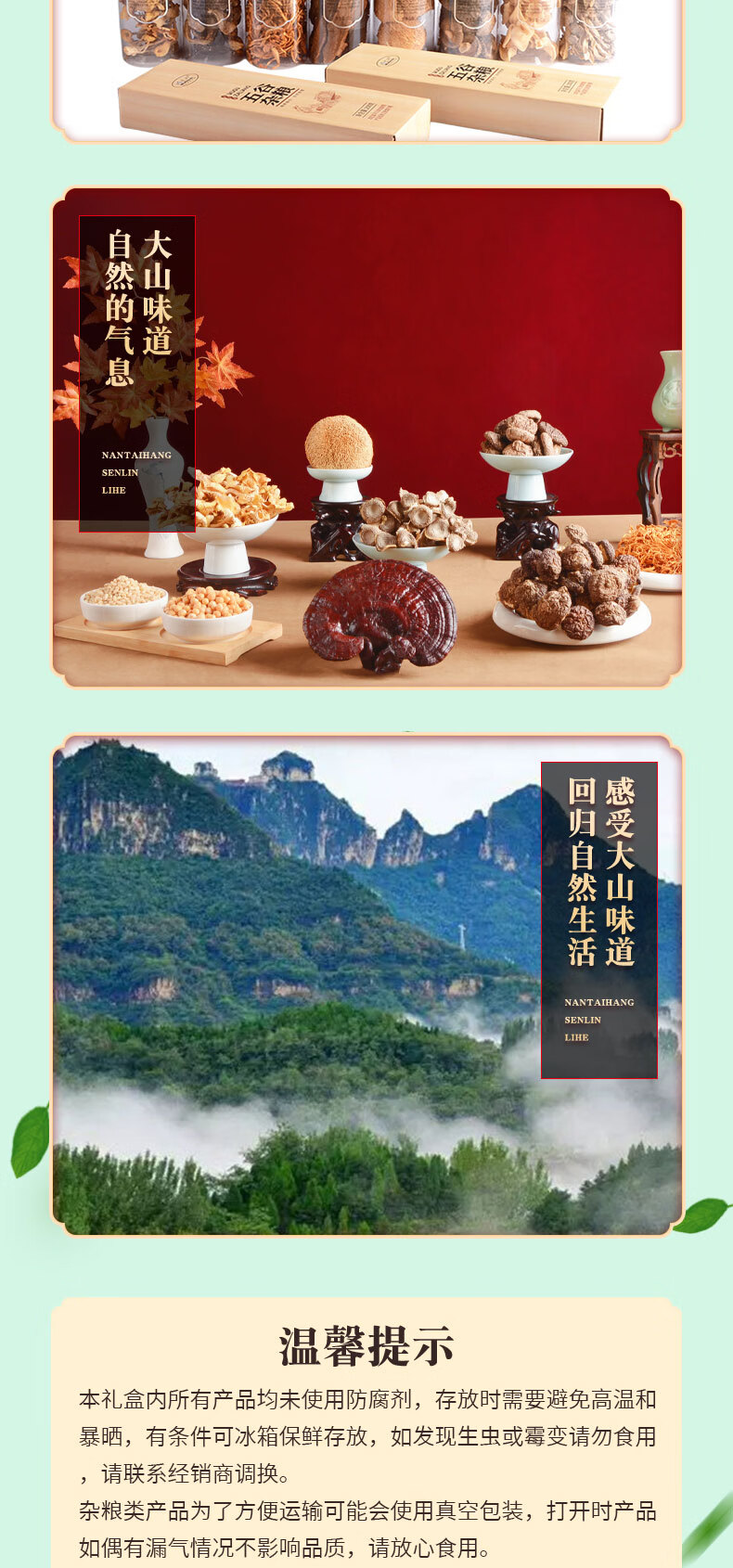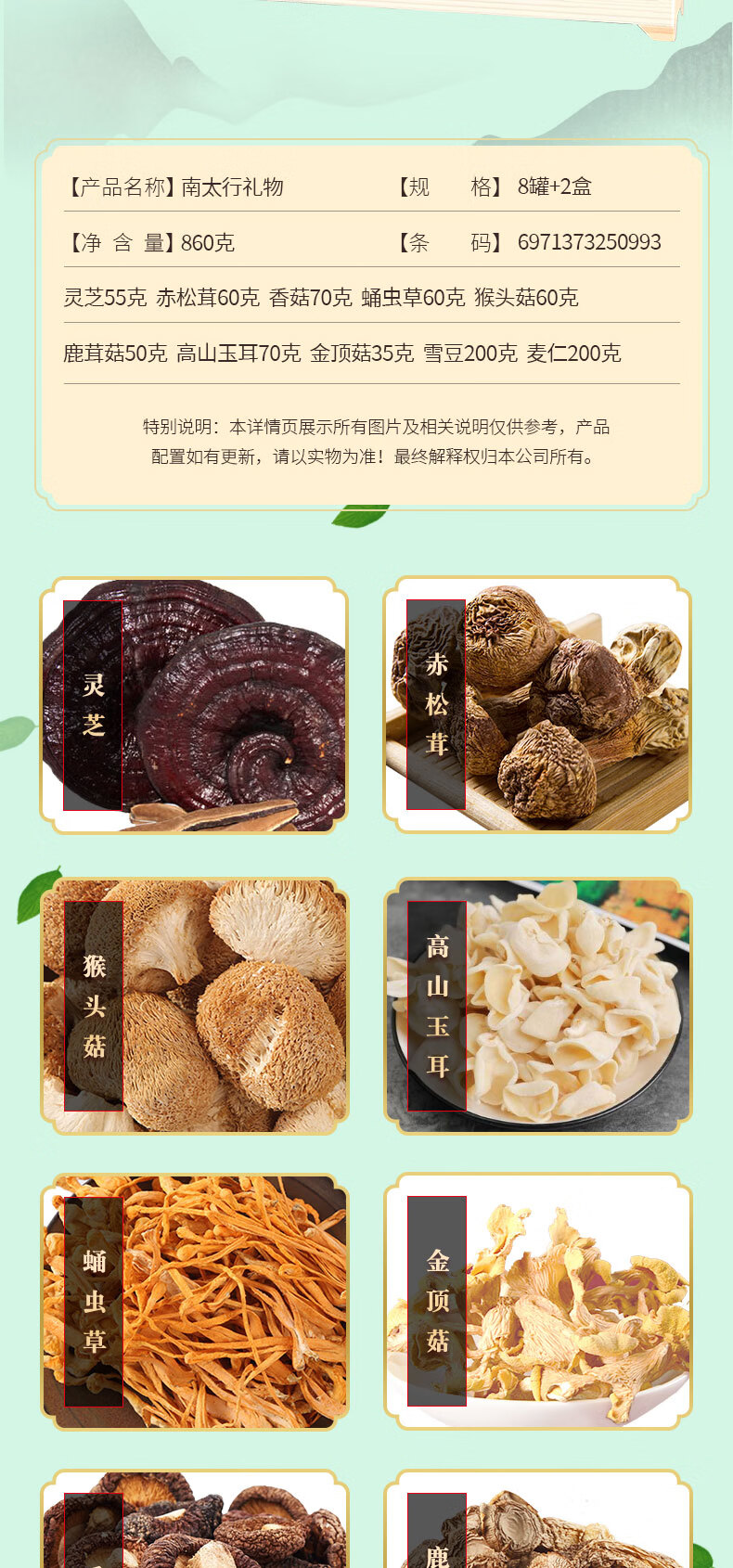 配置清单:灵芝55克*1袋 赤松茸60克*1袋 香菇70克*1袋 蛹虫草60克*1袋 猴头菇60克*1袋 高山玉耳70克*1袋 鹿茸菇50克*1袋 金顶菇35克*1袋 雪豆200克*1袋 麦仁200克*1袋 麦仁200克*1袋 麦仁200克*1袋 麦仁200克*1袋