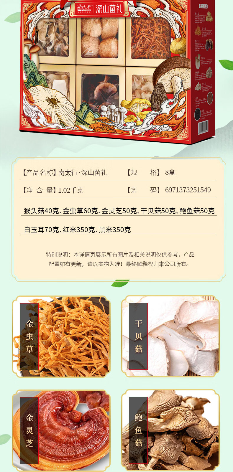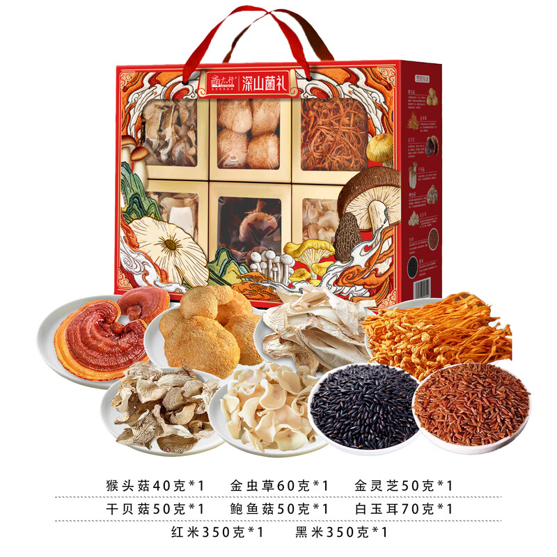 配置清单:猴头菇40克*1袋 金虫草60克*1袋 金灵芝50克*1袋 干贝菇50克*1袋 鲍鱼菇50克*1袋 白玉耳70克*1袋 红米350克*1袋 黑米350克*1袋