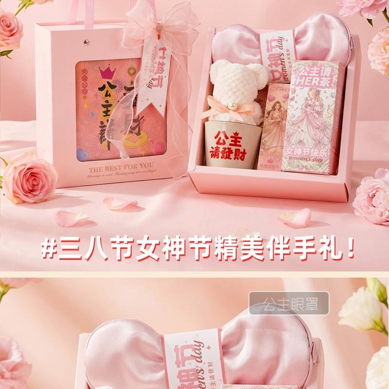 组合:女神节公主眼罩*1、公主请喝茶8g*2袋、公主请发财陶瓷主人杯*1、韩方莉护手霜35g*1、菠萝格纹理创意小熊毛巾30*30CM*1