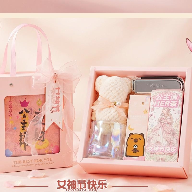 组合:扭扭玻璃杯*1、镜子气囊头梳*1、公主请喝茶8g*2袋、韩方莉水润护手霜60g*1、菠萝格纹理创意小熊毛巾30*30CM*1