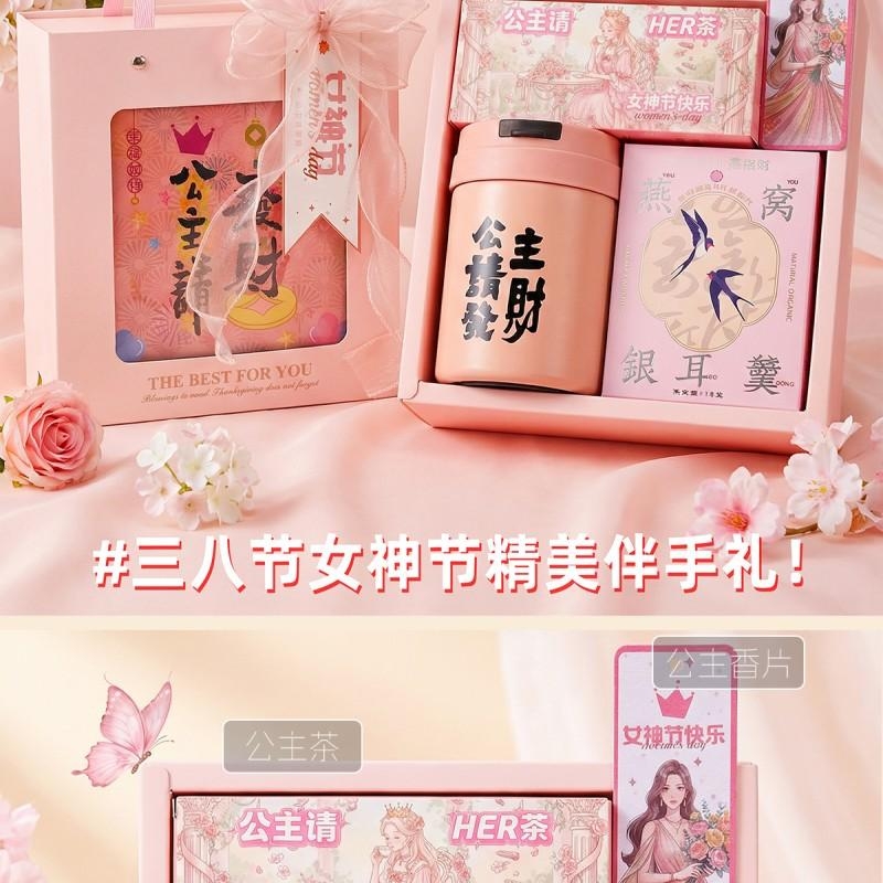 组合:公主请喝茶8g*2袋、公主请发财保温杯300ML*1、燕窝银耳羹15g、女神节香片香挂*1