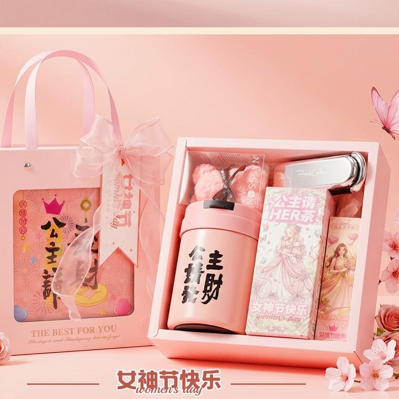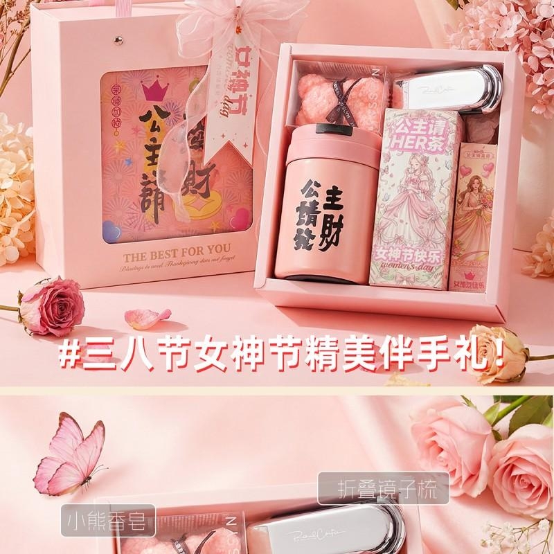 组合:镜子气囊头梳*1、公主请喝茶8g*2袋、公主请发财保温杯300ML*1、韩方莉护手霜35g*1、小熊玫瑰香氛皂100g*1