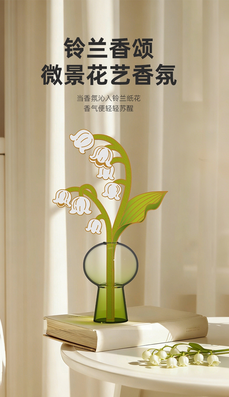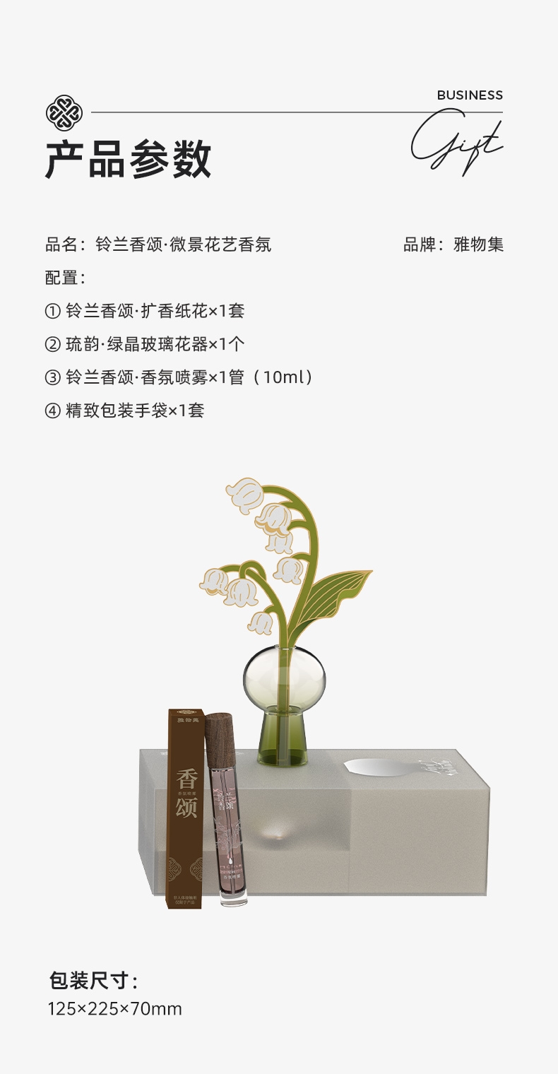 配置:① 铃兰香颂-扩香纸花×1套 ② 铃兰香颂-香氛喷雾×1管(10ml) ③ 琉韵-绿晶玻璃花器×1个 ④ 文创PVC包装×1套 (本品出售不配手袋)