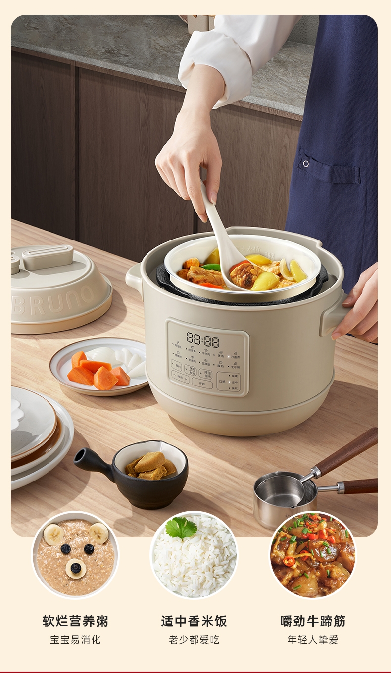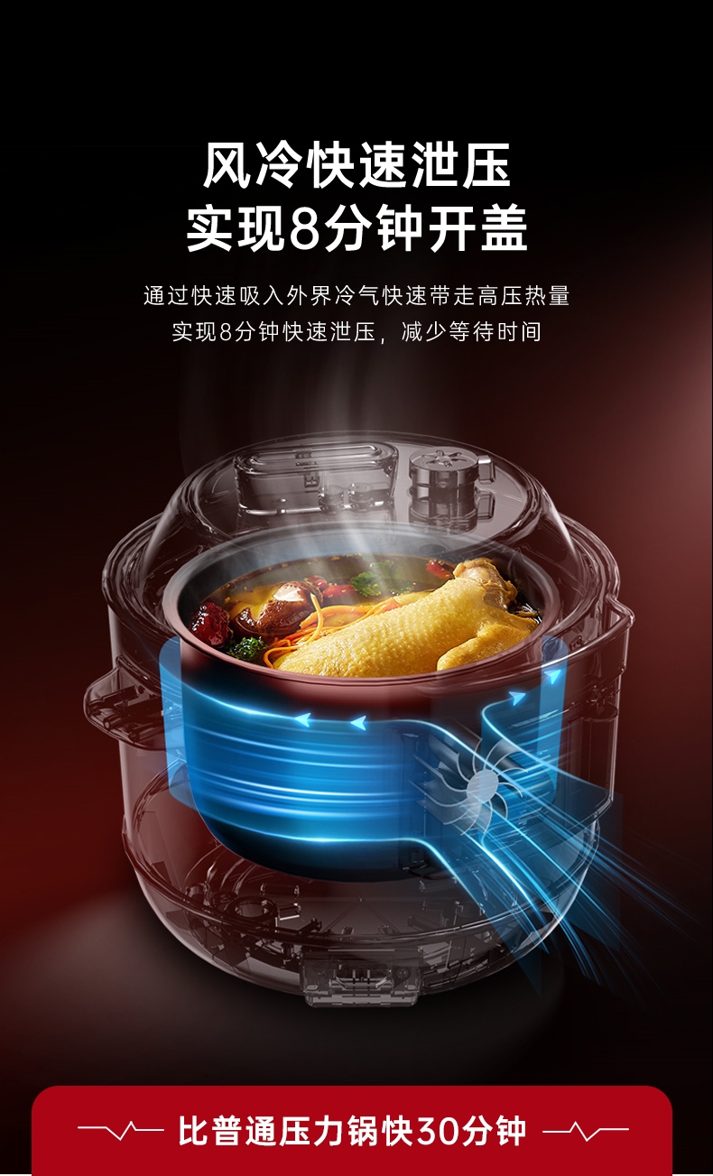 营养精煮 × 快速泄压-焖煮炖煲全面提速;风冷黑科技 更快速、更安全、易清洗;专胆专用 健康焖炖,煮饭不粘