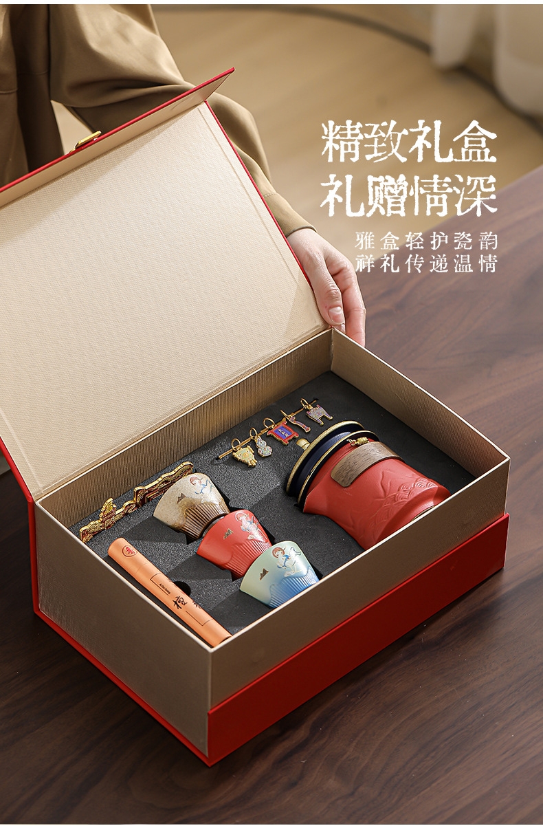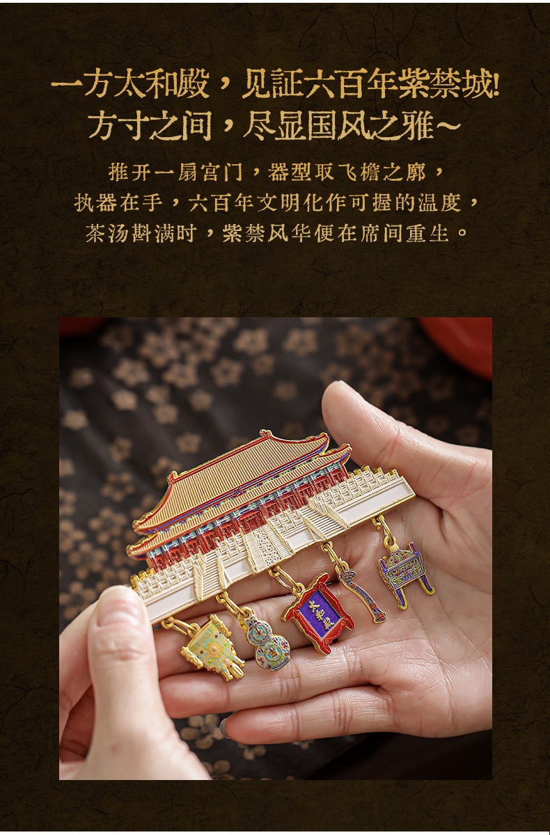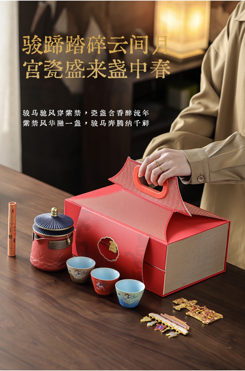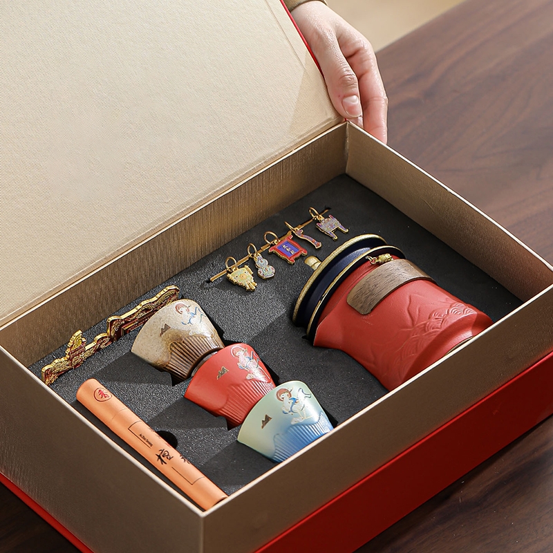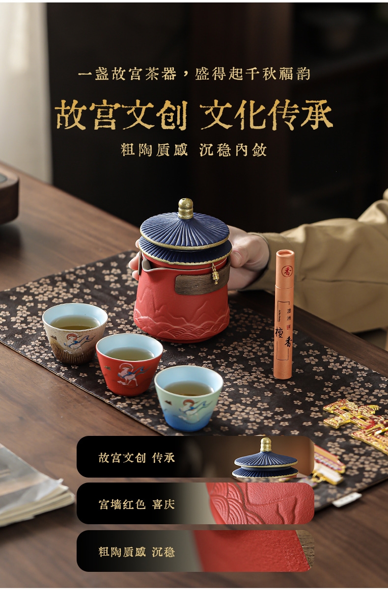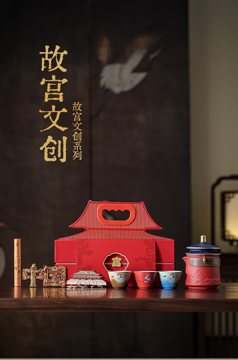取故宫飞檐为柄,化琉璃彩画为釉;粗陶材质,沉稳内敛。茶壶壶嘴出水顺畅有力,断水利落;敦煌元素茶杯,国风十足。文创冰箱贴,精美实用。