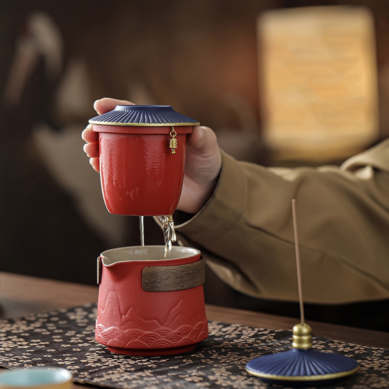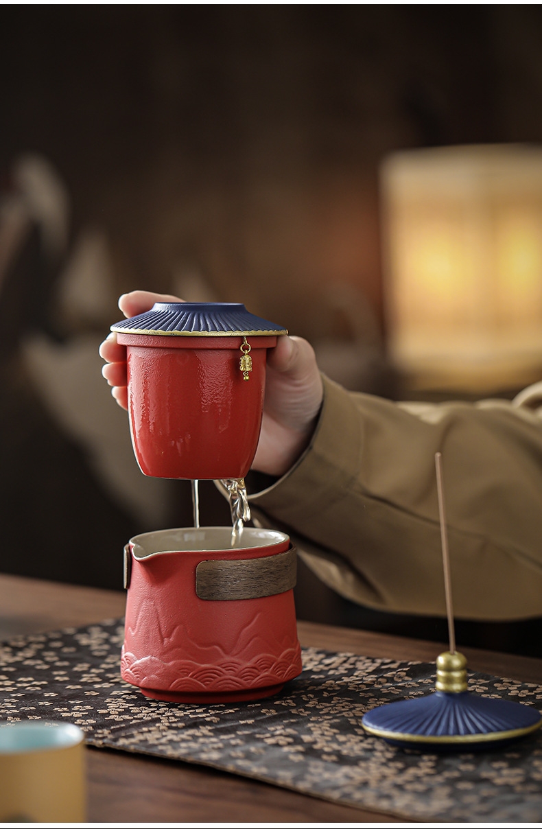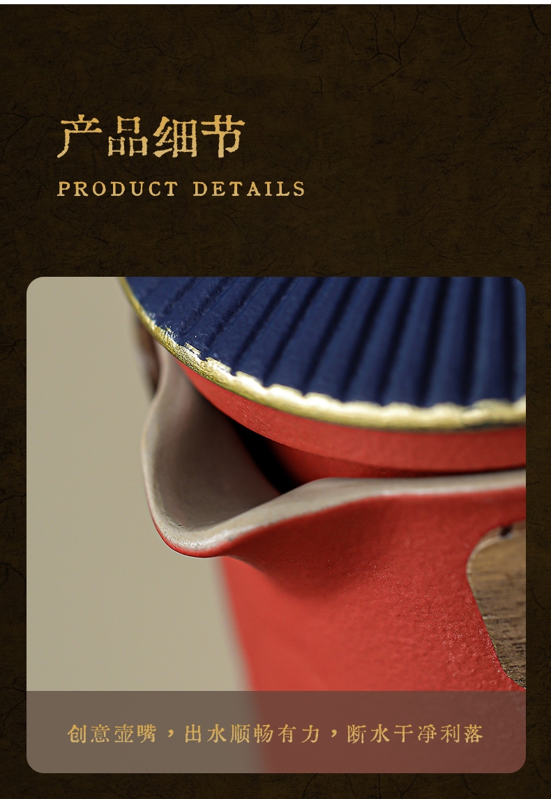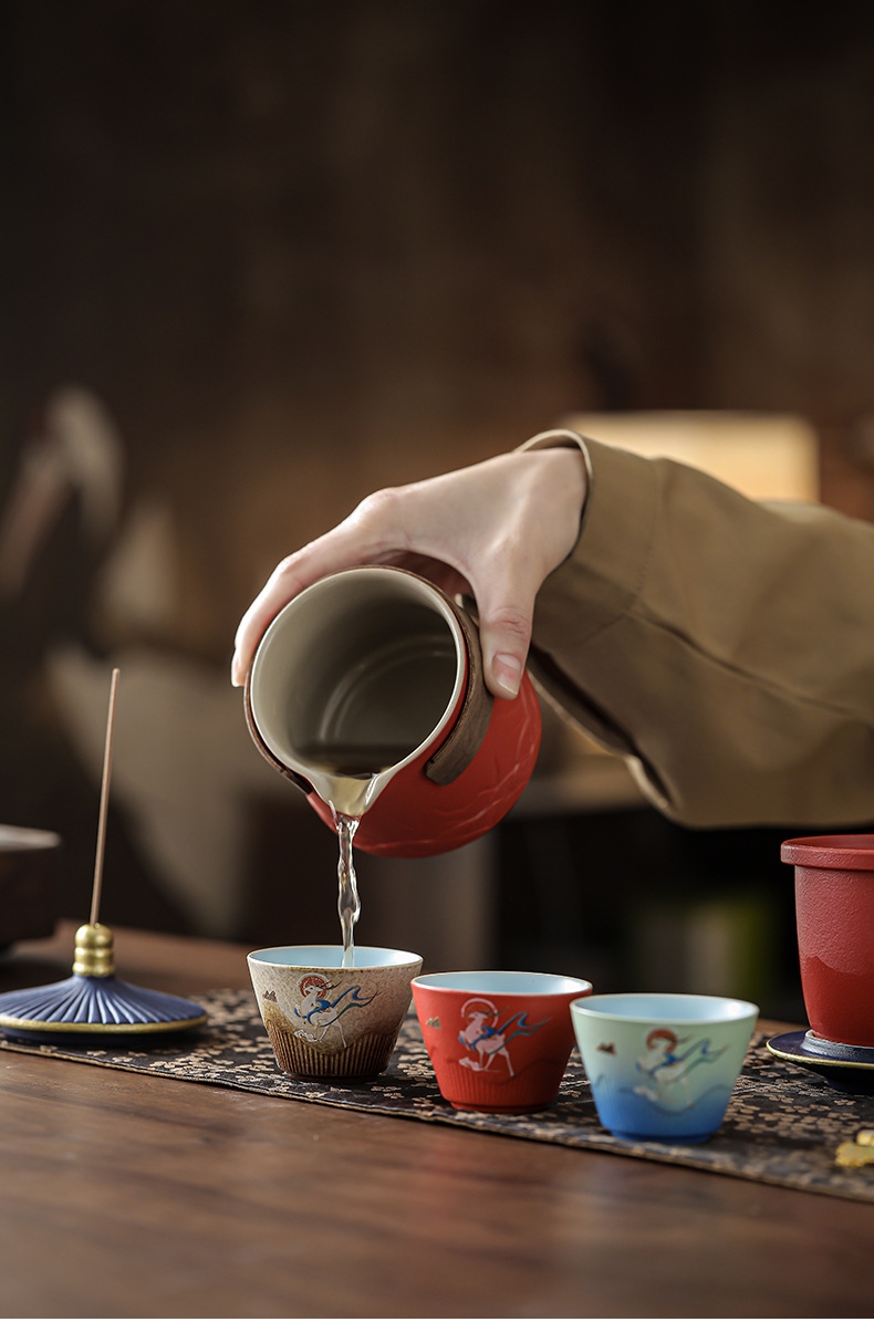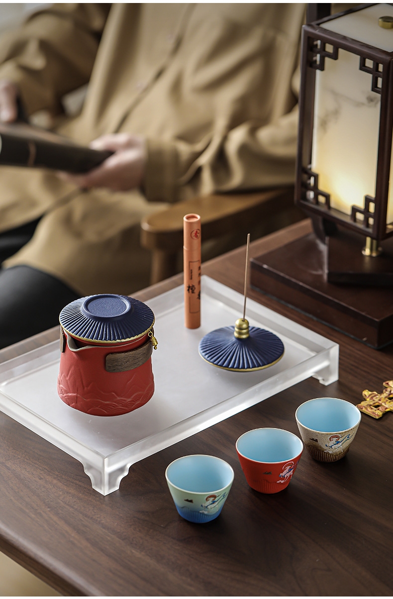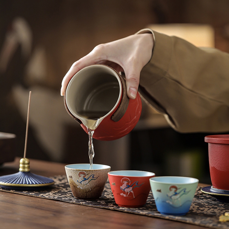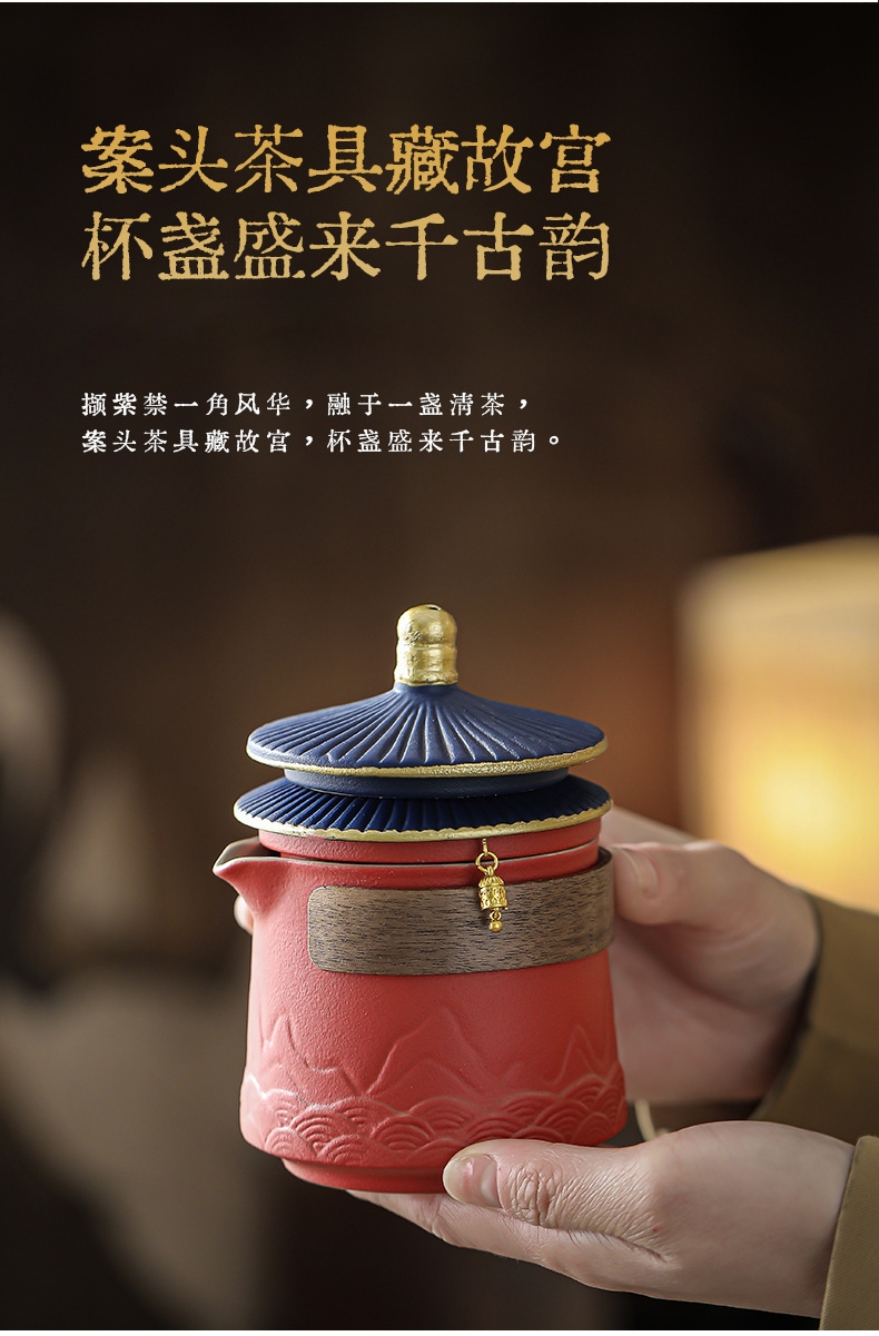 取故宫飞檐为柄,化琉璃彩画为釉;粗陶材质,沉稳内敛。茶壶壶嘴出水顺畅有力,断水利落;敦煌元素茶杯,国风十足。文创冰箱贴,精美实用。