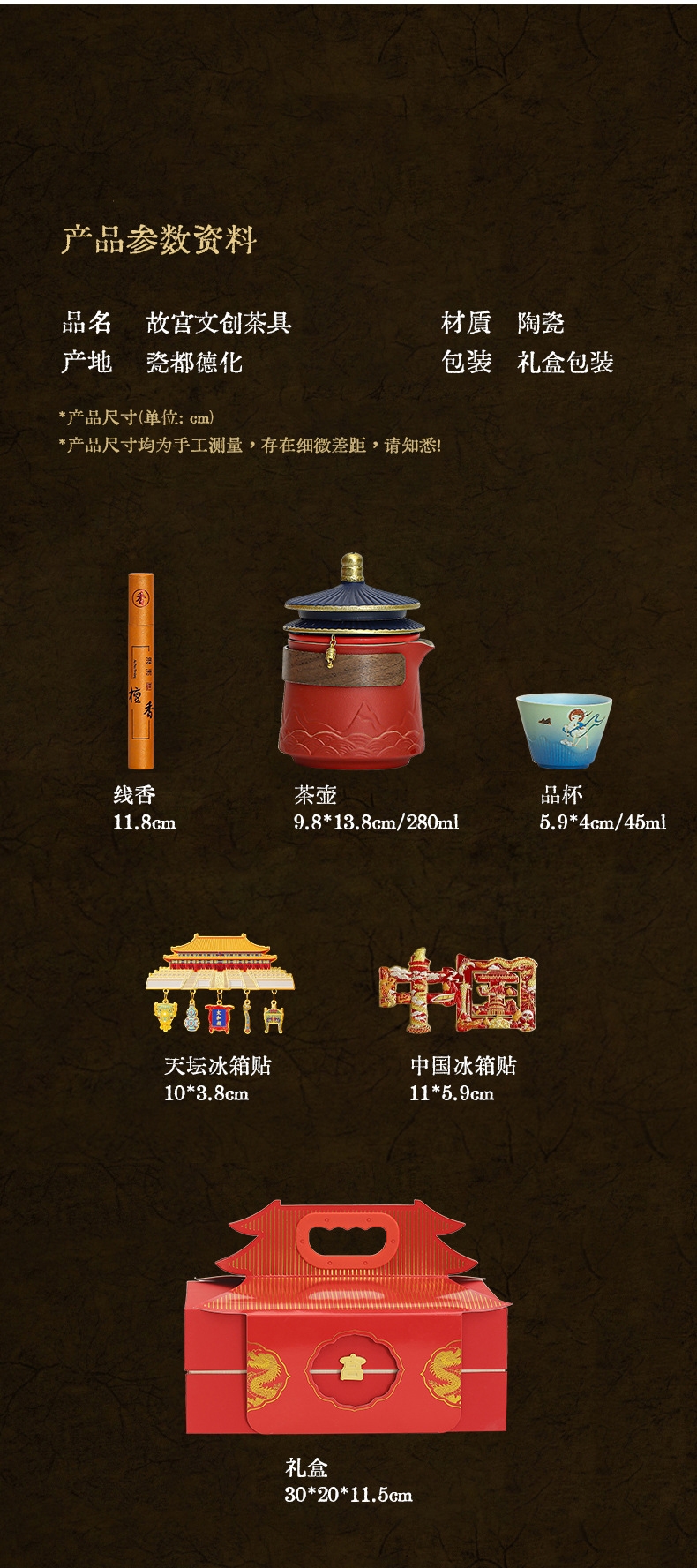 配置清单:手抓壶*1+品茗杯*3+冰箱贴*2+线香*1+礼盒*1