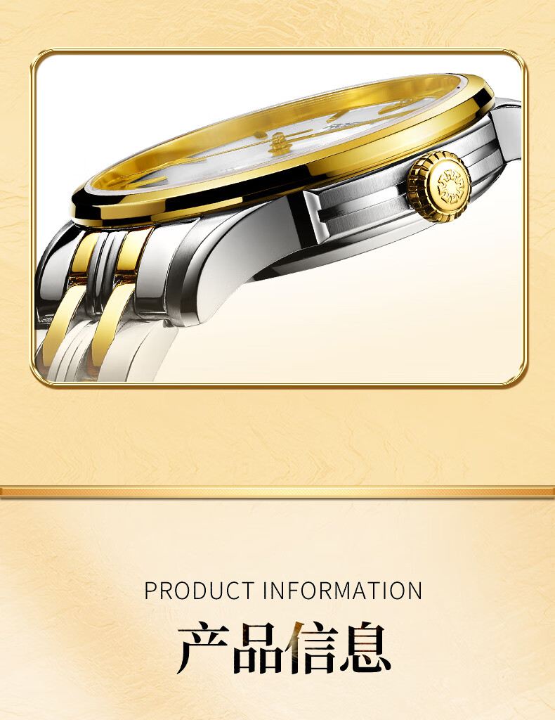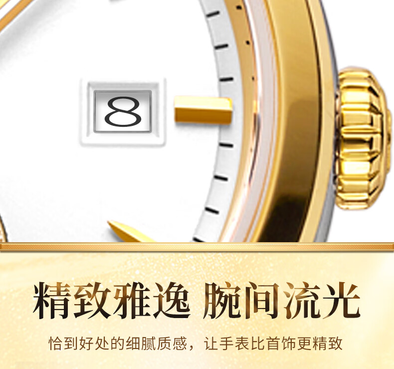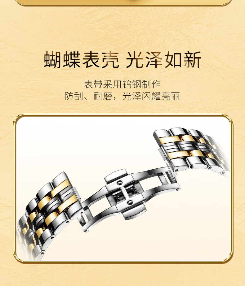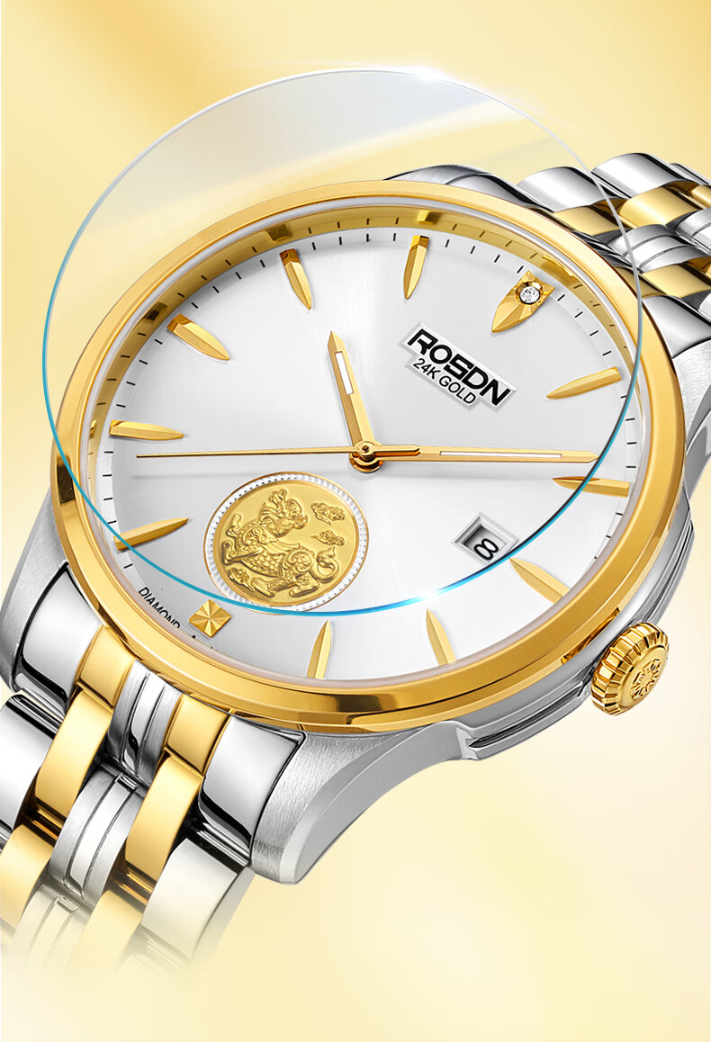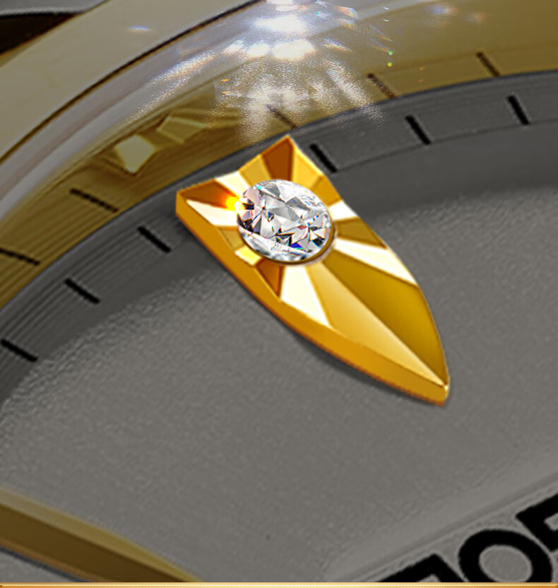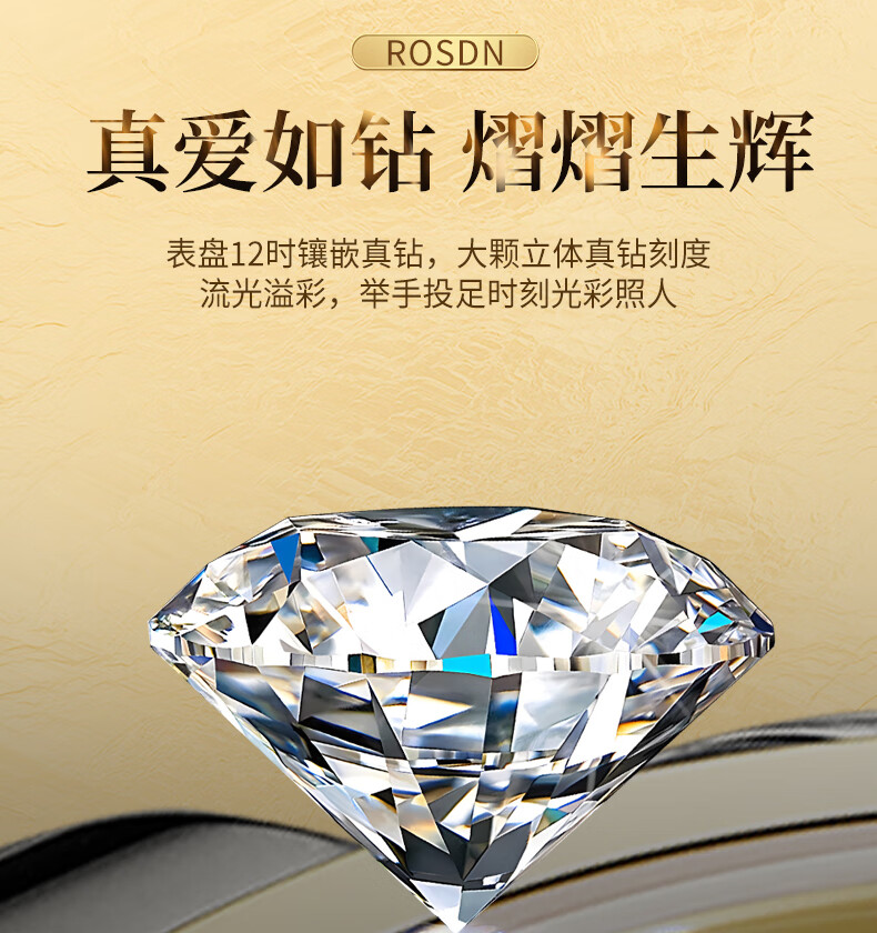 表盘12时镶嵌真钻,大颗立体真钻刻度;流光溢彩,举手投足时刻光彩照人;人工蓝宝石表镜, 清澈透光,耐磨防刮 ,读时无忧