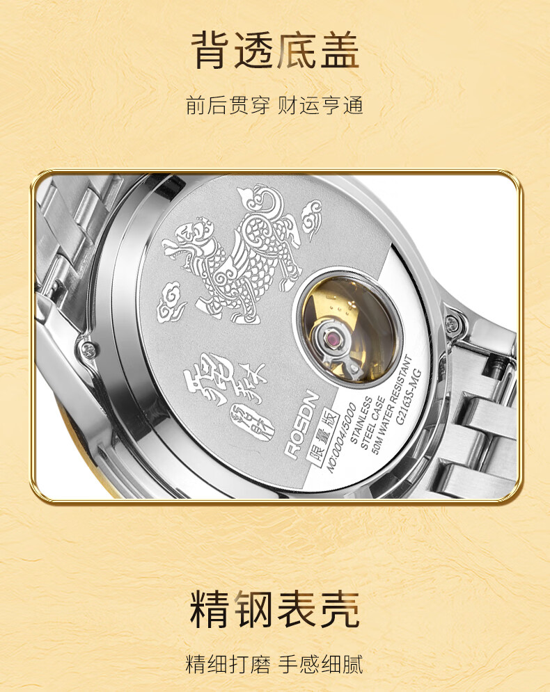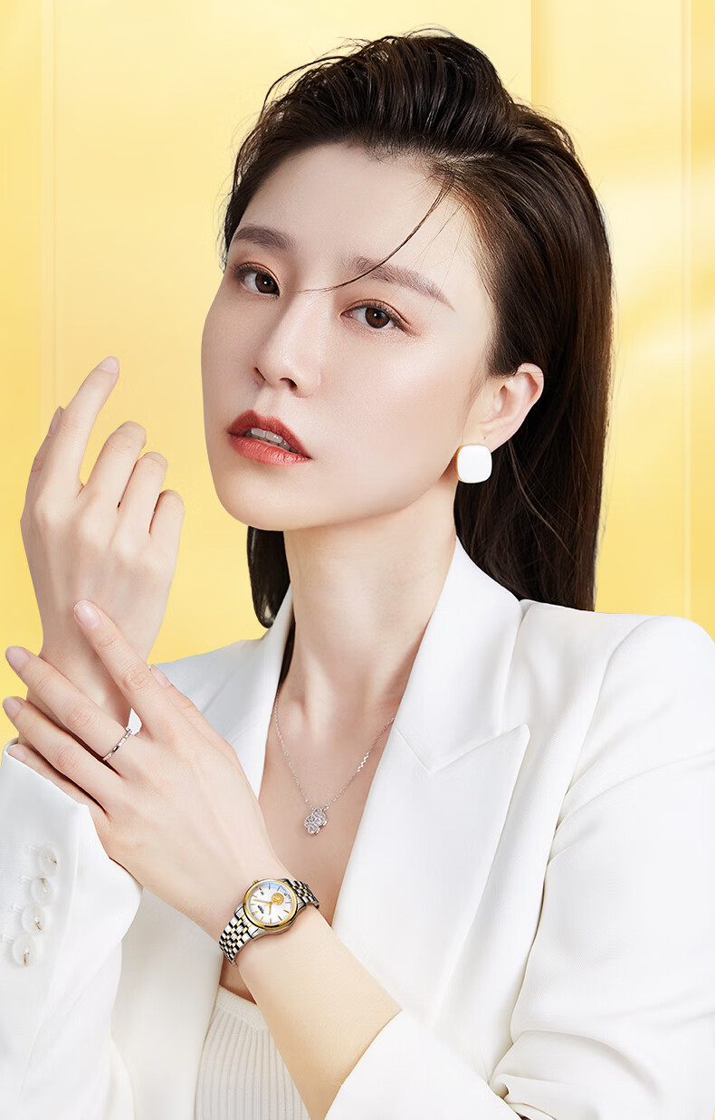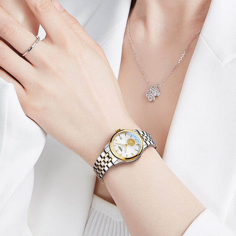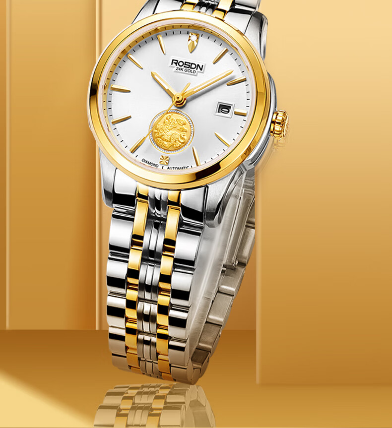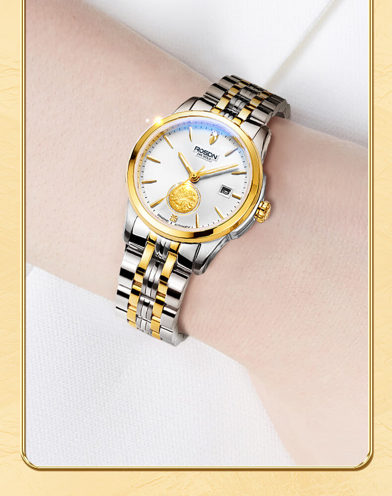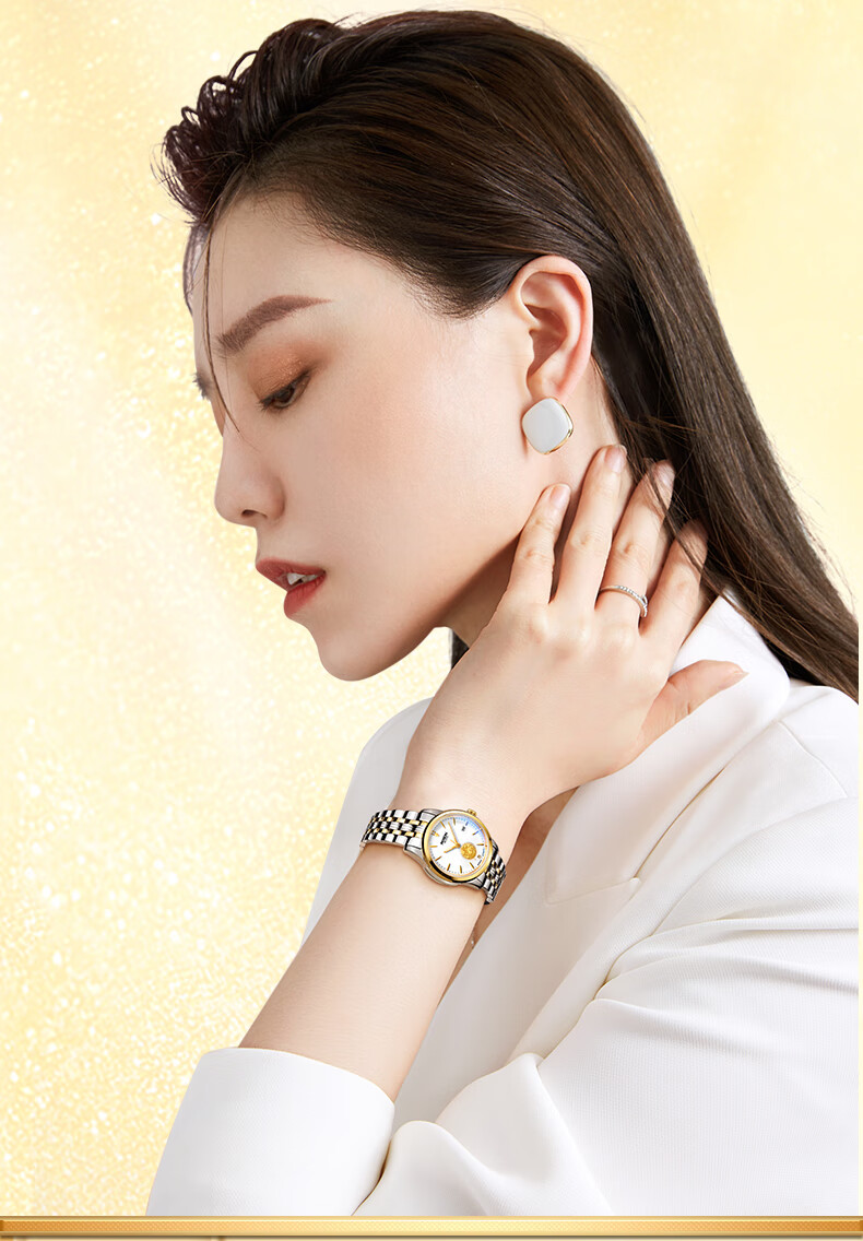 表盘12时镶嵌真钻,大颗立体真钻刻度;流光溢彩,举手投足时刻光彩照人;人工蓝宝石表镜, 清澈透光,耐磨防刮 ,读时无忧