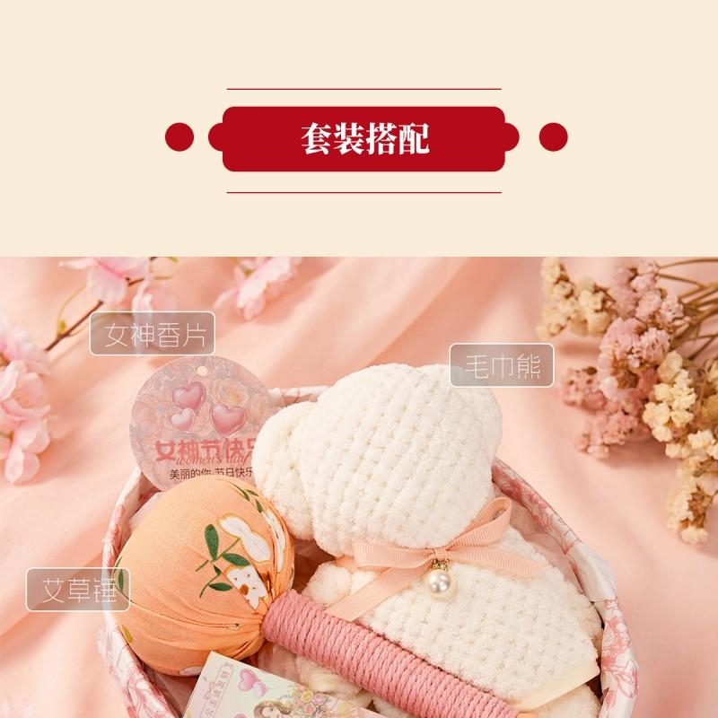 组合:艾草养生锤*1、女神节香片香挂*1、韩方莉护手霜35g*1、菠萝格纹理创意小熊毛巾75*34CM*1