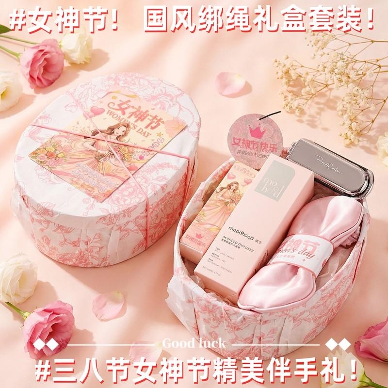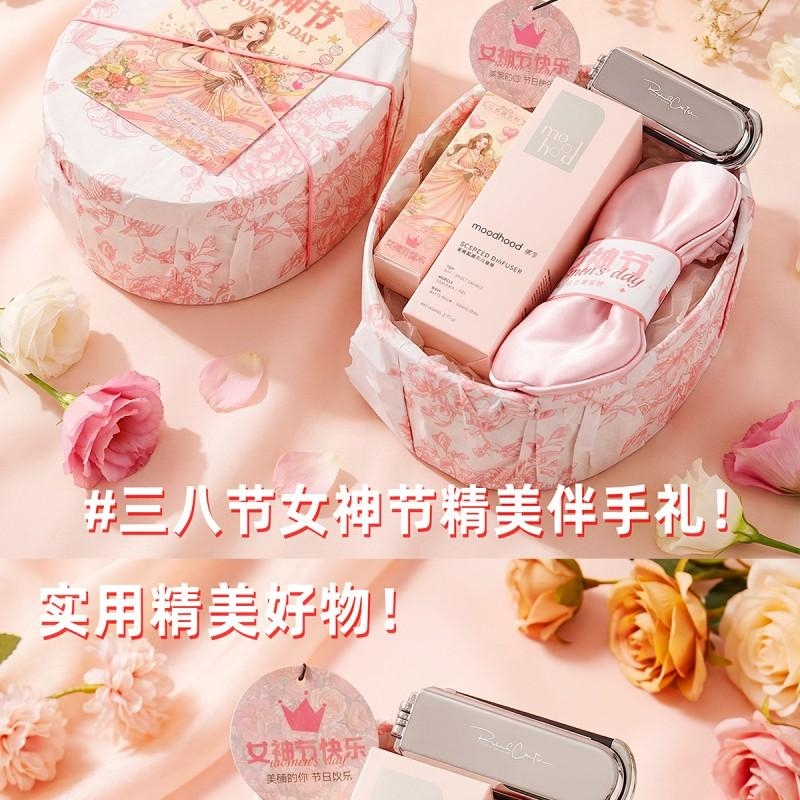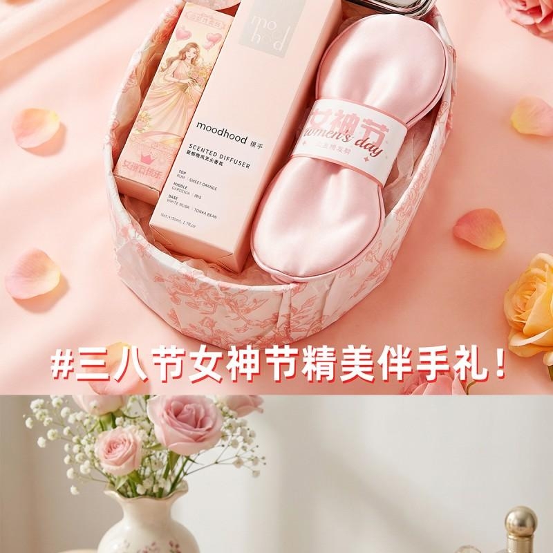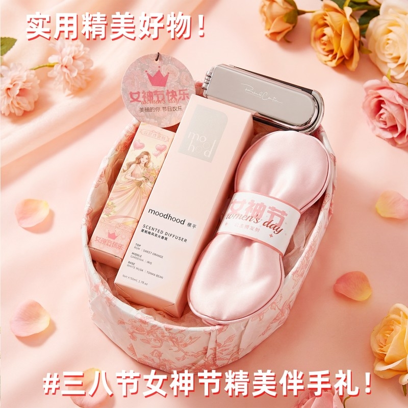 组合:镜子气囊头梳*1、女神节公主眼罩*1、韩方莉护手霜35g*1、moodhood无火香氛液50ML*1