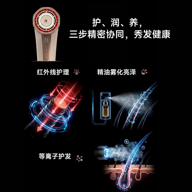 高速快干:11万转无刷电机,强风快干;智能控温:NTC温控系统,精准调节温度气流;精油雾化+远红外:精油分子直达发
