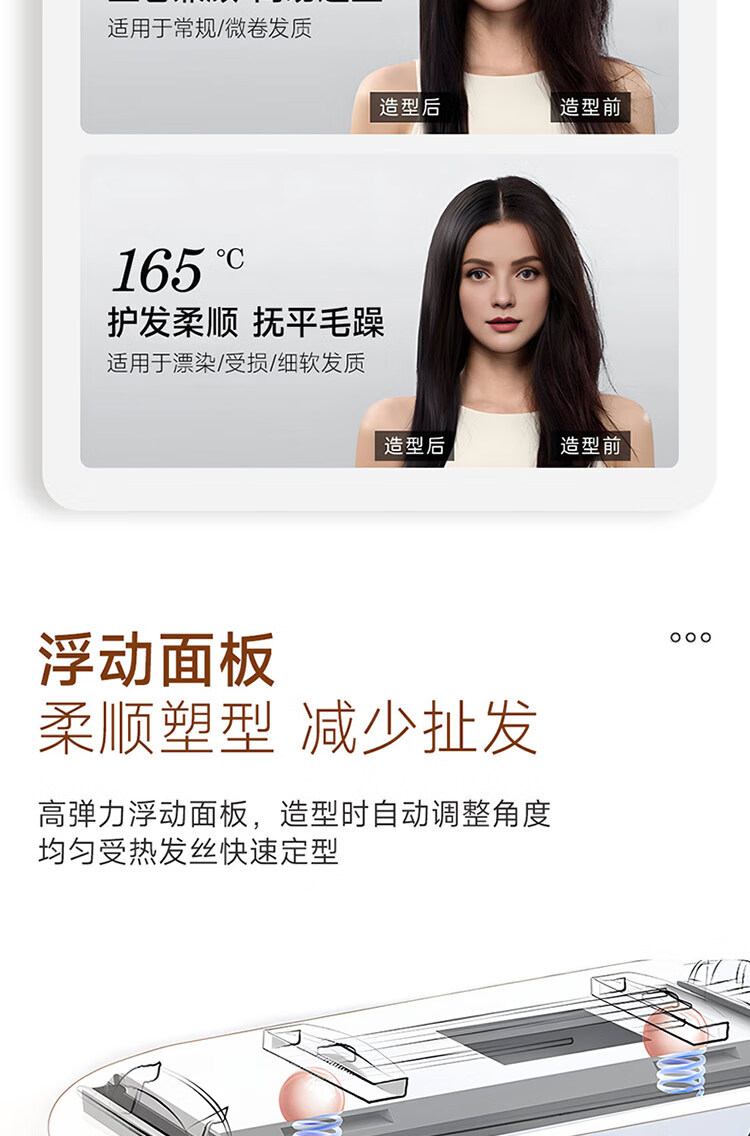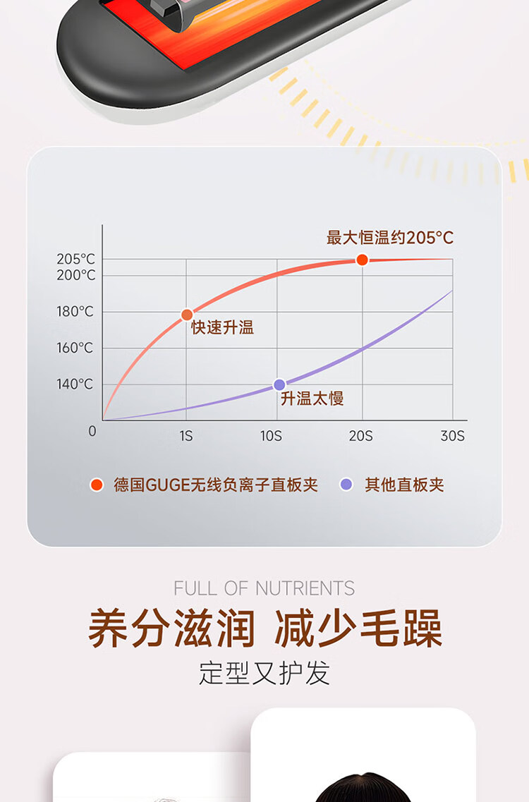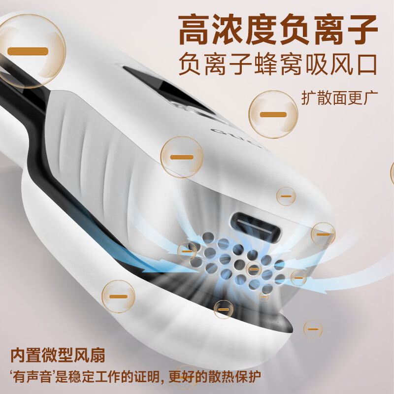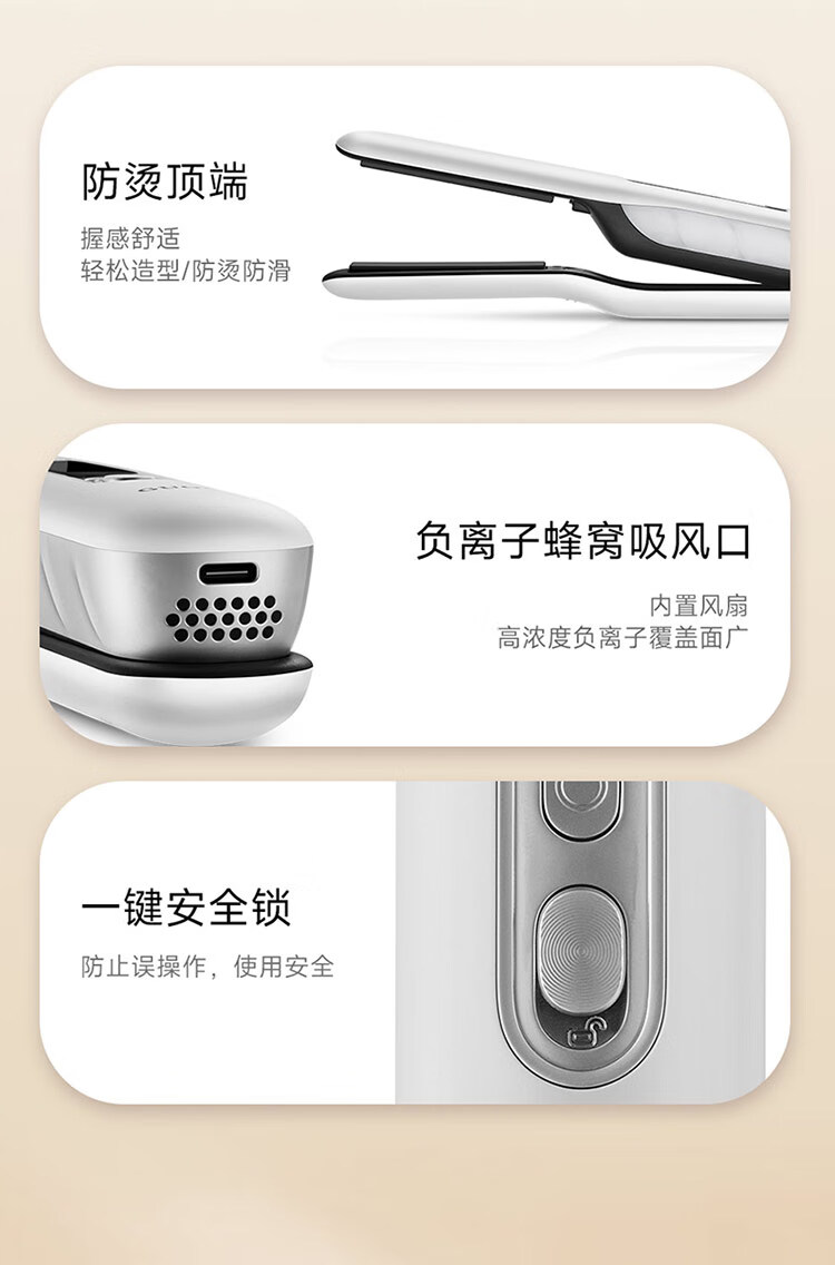 2亿负离子,无线护发直板夹;一拉定型,直卷两用。;亿级负离子深层修复,改善秀发毛躁减少静电。;定型不伤发,造型更持久;减少过热损伤 锁住水分 修
