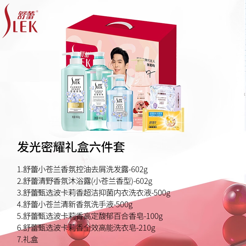 配置:1、舒蕾小苍兰香氛控油去屑洗发露-602g 2、舒蕾清野香氛沐浴露(小苍兰香型)-602g 3、舒蕾甄选波卡莉香超洁抑菌内衣洗衣液-500g 4、舒蕾小苍兰清新香氛洗手液-500g 5、舒蕾甄选波卡莉香高定馥郁百合香皂-100g 6、舒蕾甄选波卡莉香全效高能洗衣皂-210g 7、礼盒