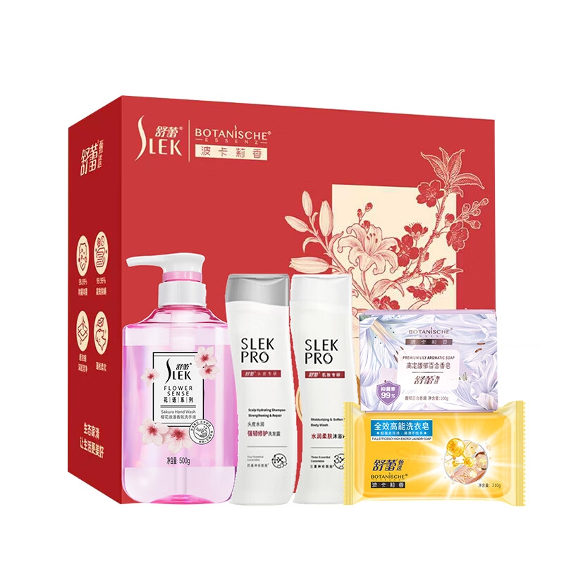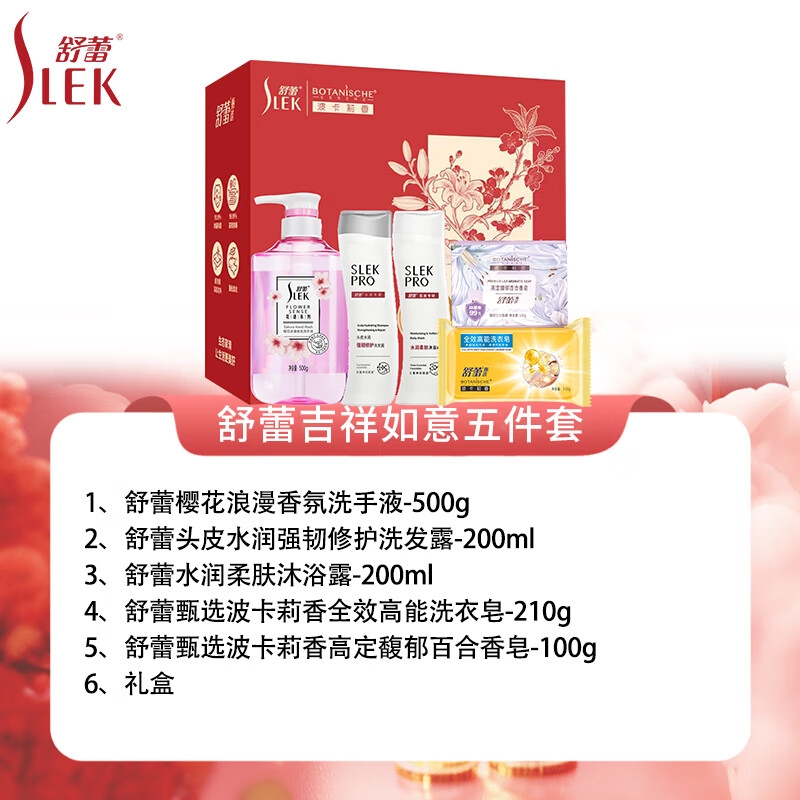 配置:1、舒蕾樱花浪漫香氛洗手液-500g*1 2、舒蕾头皮水润强韧修护洗发露-200ml*1 3、舒蕾水润柔肤沐浴露-200ml*1 4、舒蕾甄选波卡莉香全效高能洗衣皂-210g*1 5、舒蕾甄选波卡莉香高定馥郁百合香皂-100g*1 6、礼盒*1