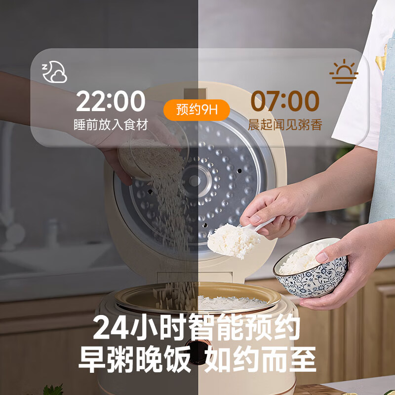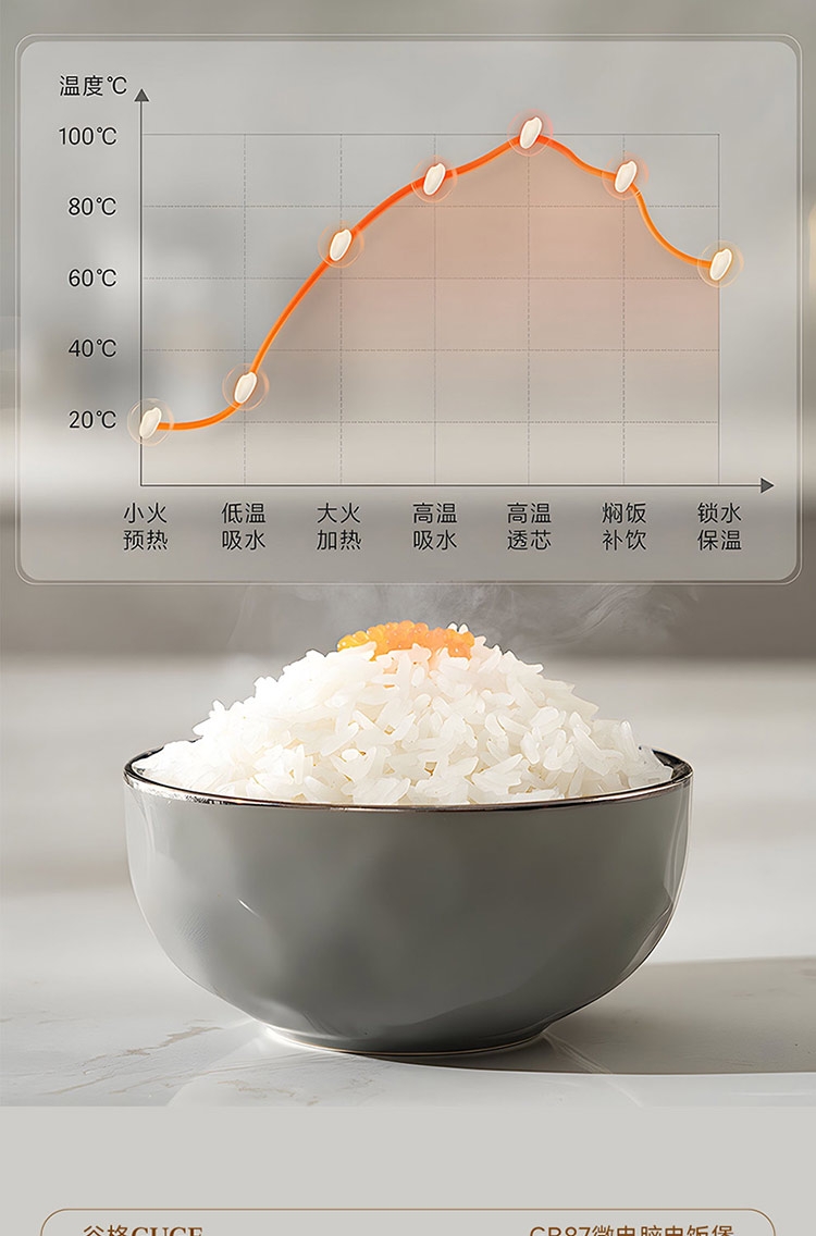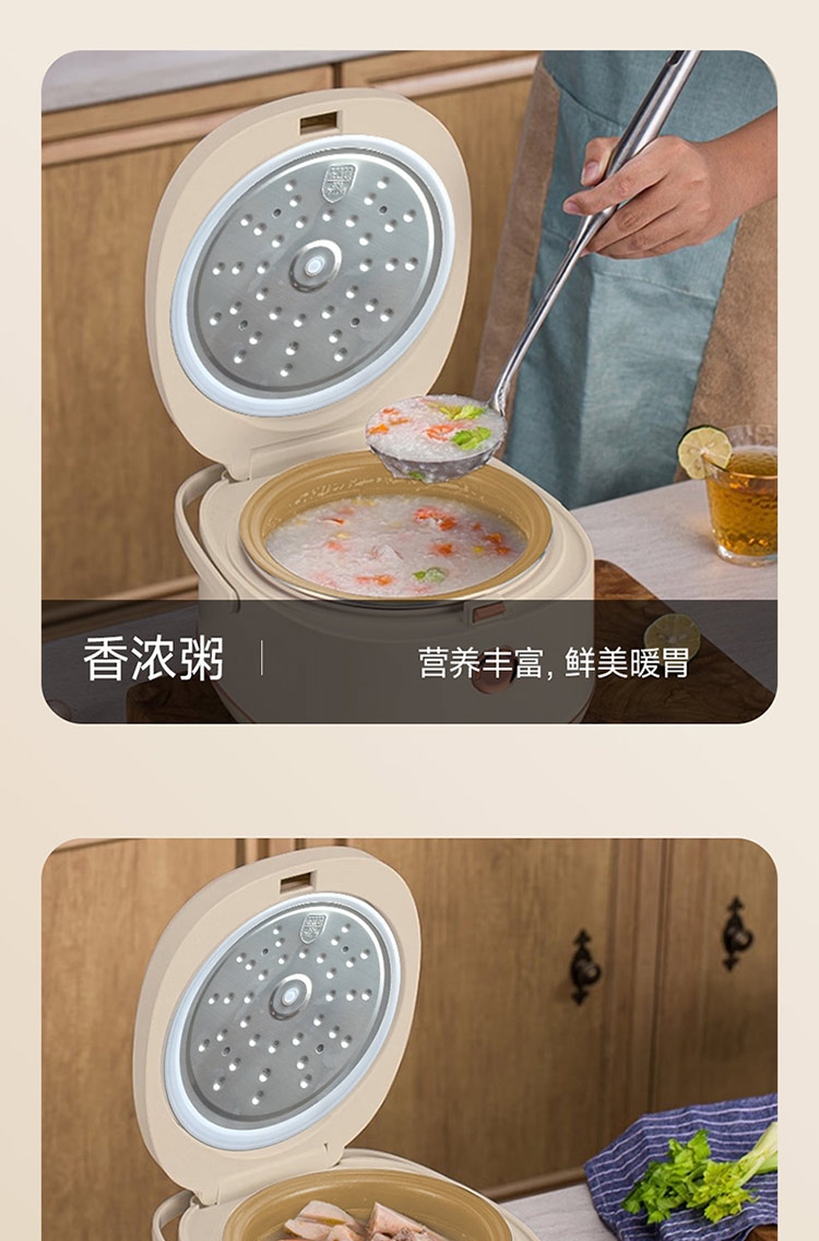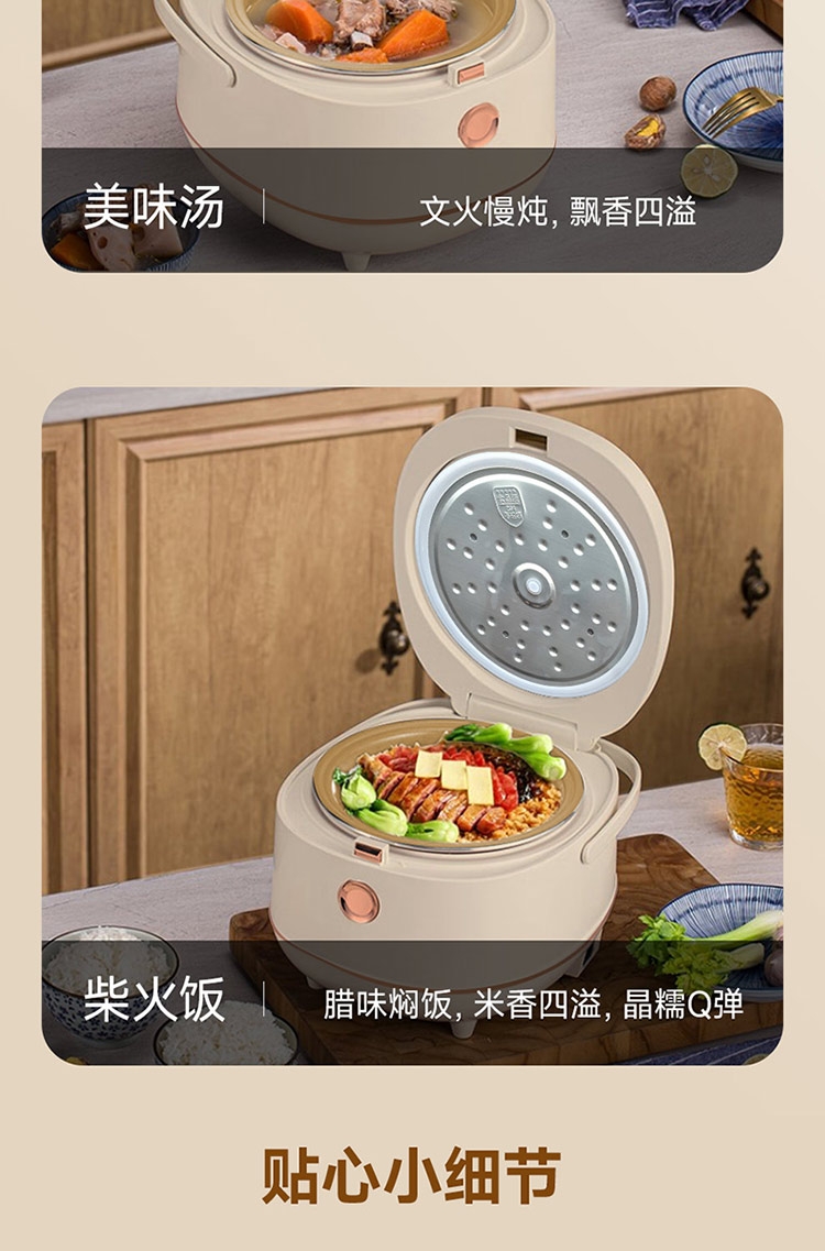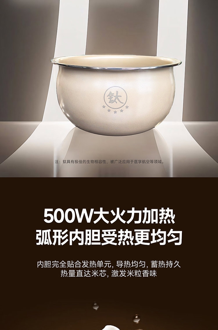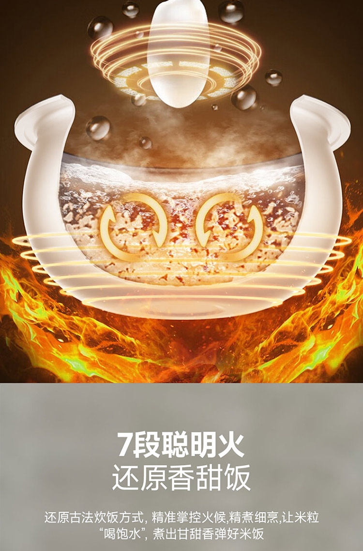 高奢含钛珐琅精铁内胆厨房中的实力派;7段聪明火还原香甜饭;500W大火力加热弧形内胆受热更均匀