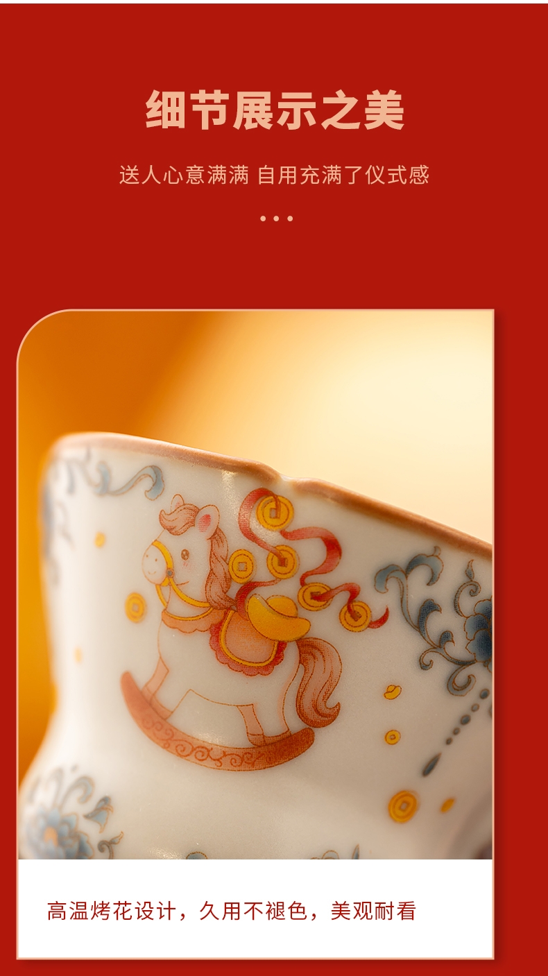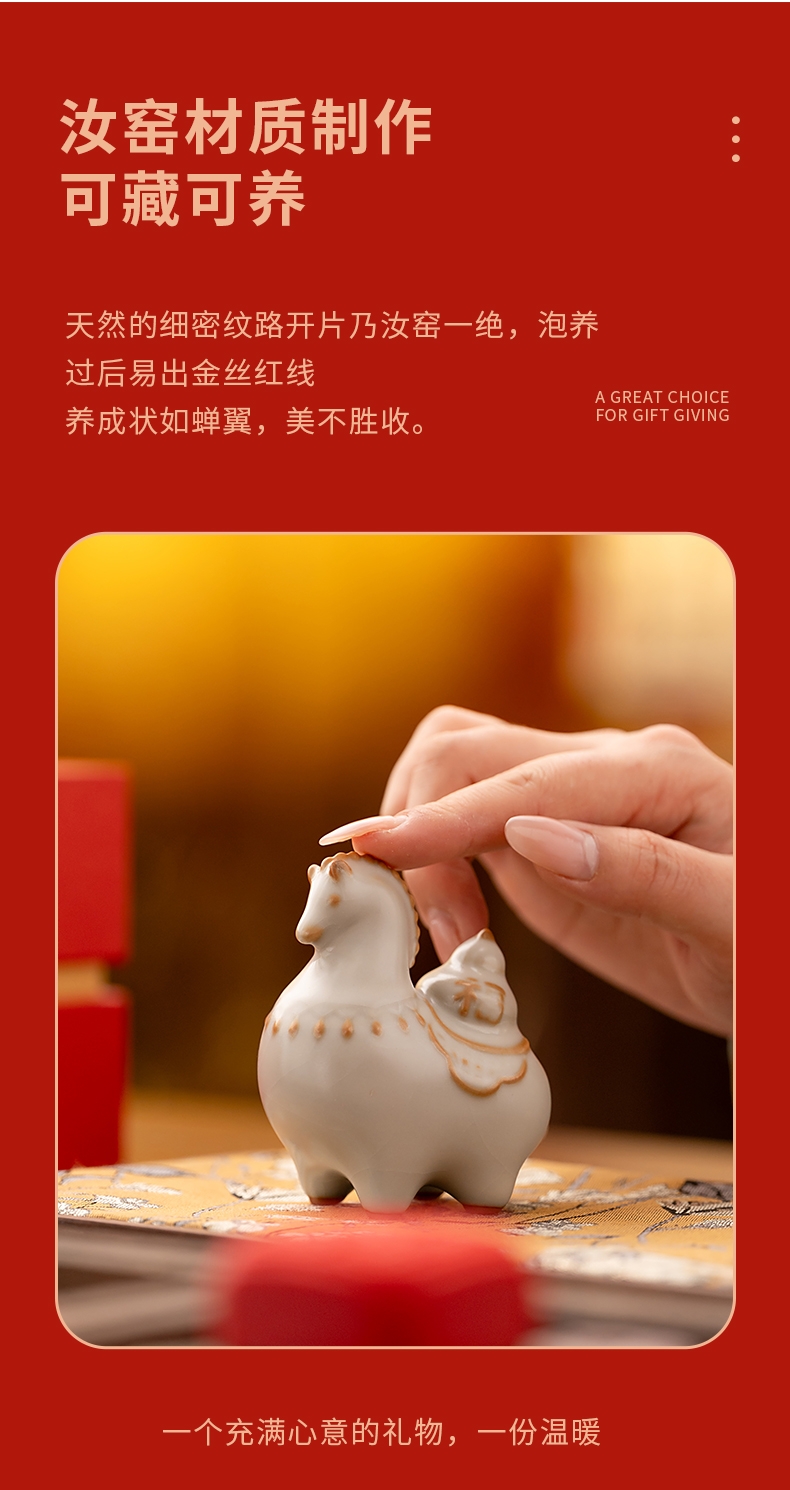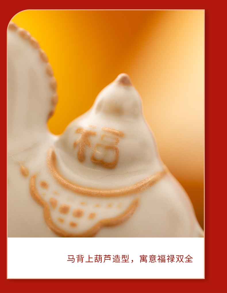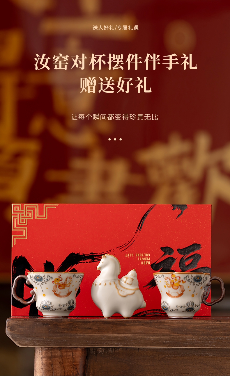 马年开门红礼品,马上有钱杯子摆件套装;马背上葫芦造型,寓意福禄。亚黄汝瓷,玛瑙入釉,蝉翼;内外皆有花面,家有千财万贯,不如汝窑一片。独家专利