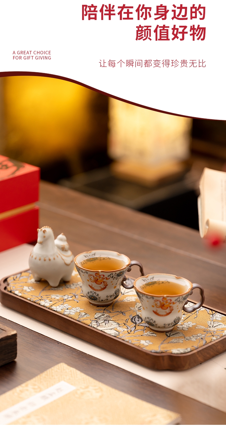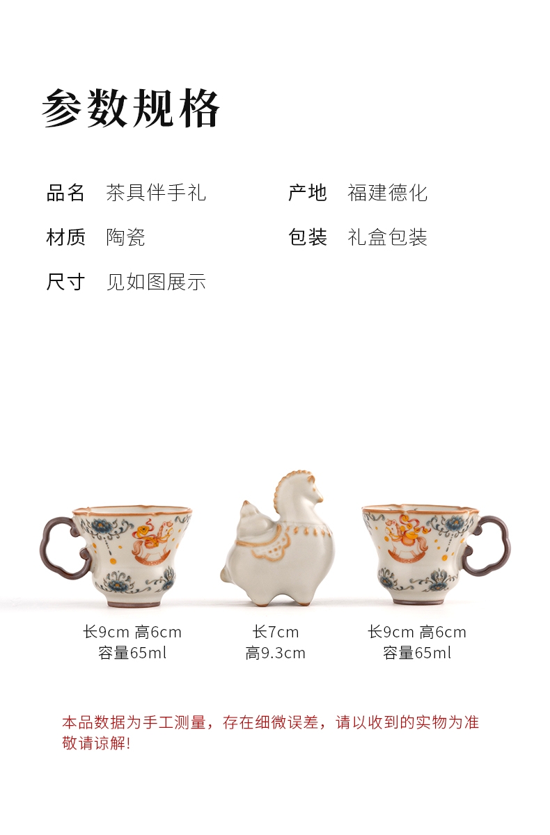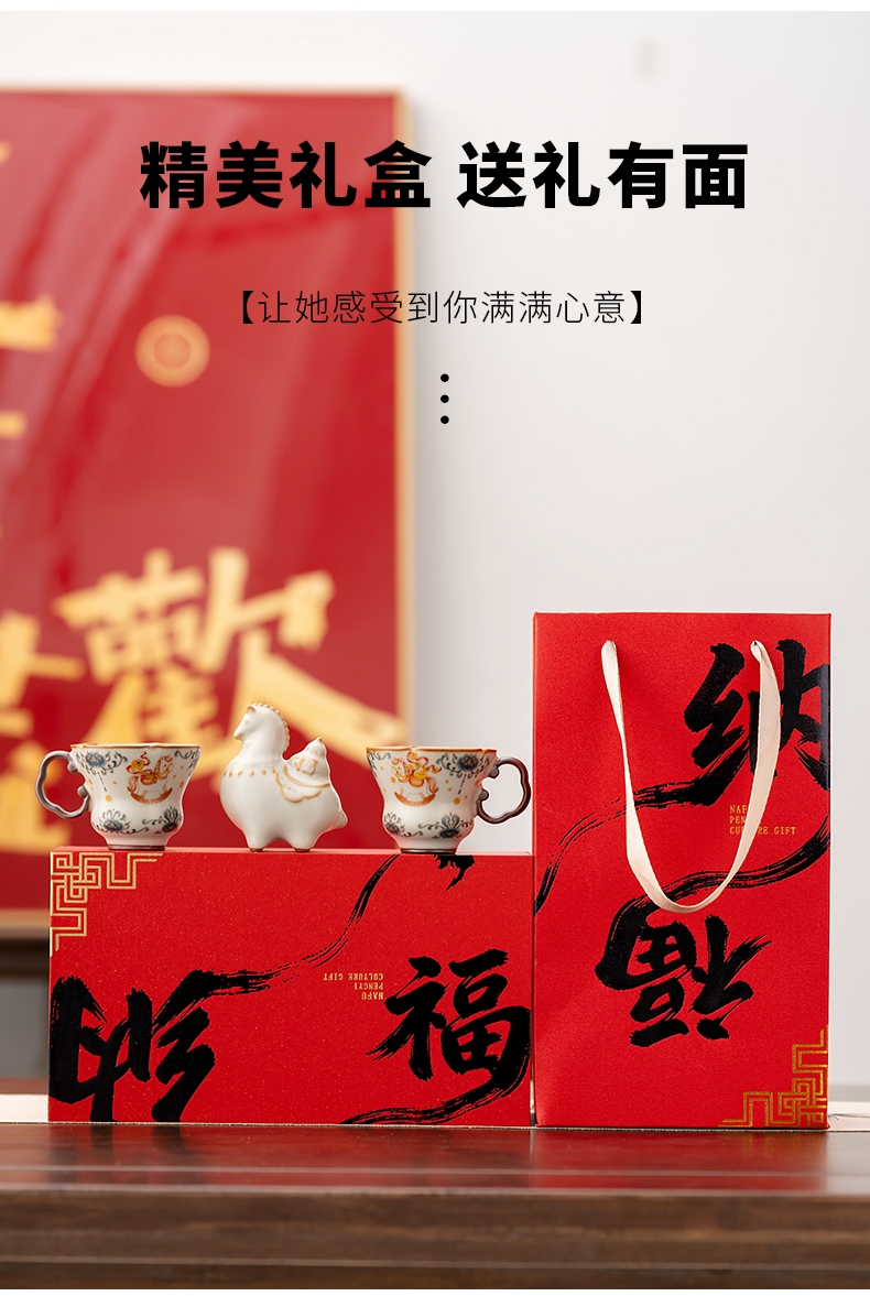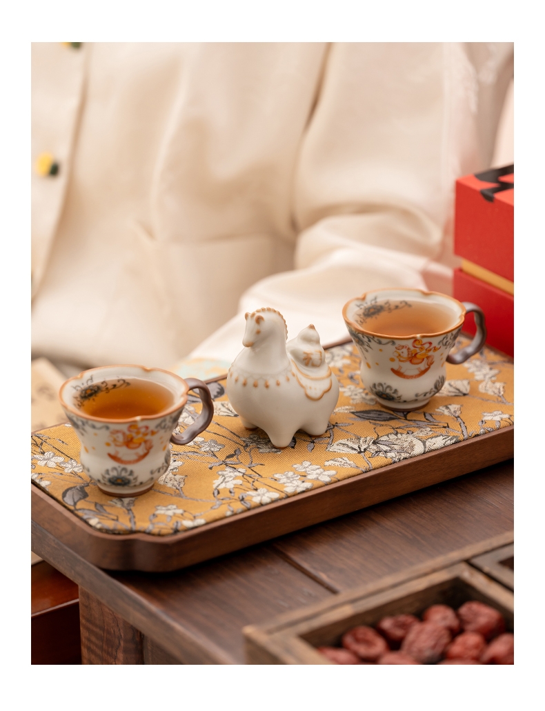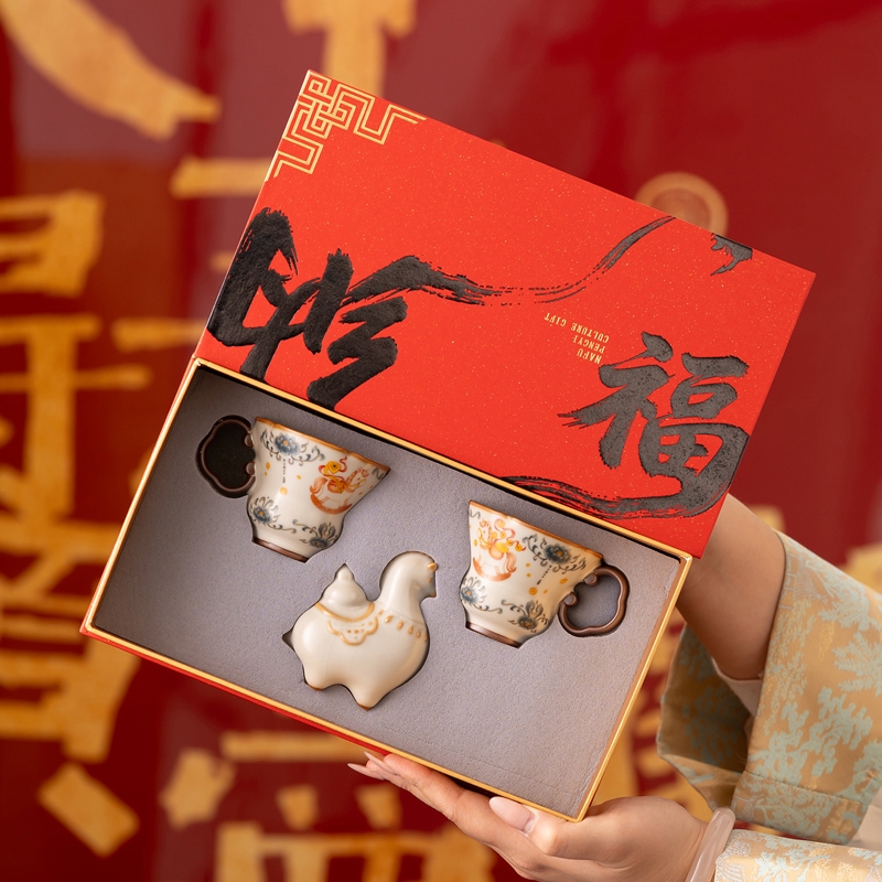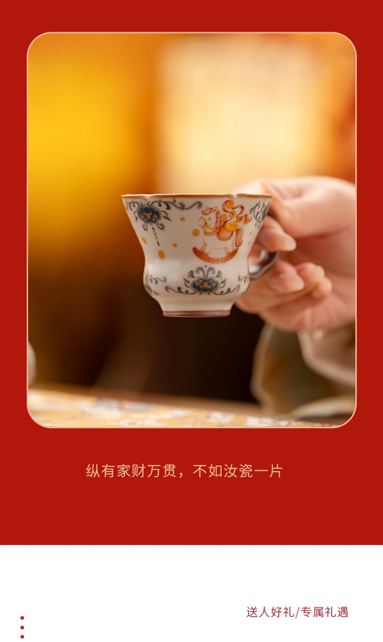 马年开门红礼品,马上有钱杯子摆件套装;马背上葫芦造型,寓意福禄。亚黄汝瓷,玛瑙入釉,蝉翼;内外皆有花面,家有千财万贯,不如汝窑一片。独家专利