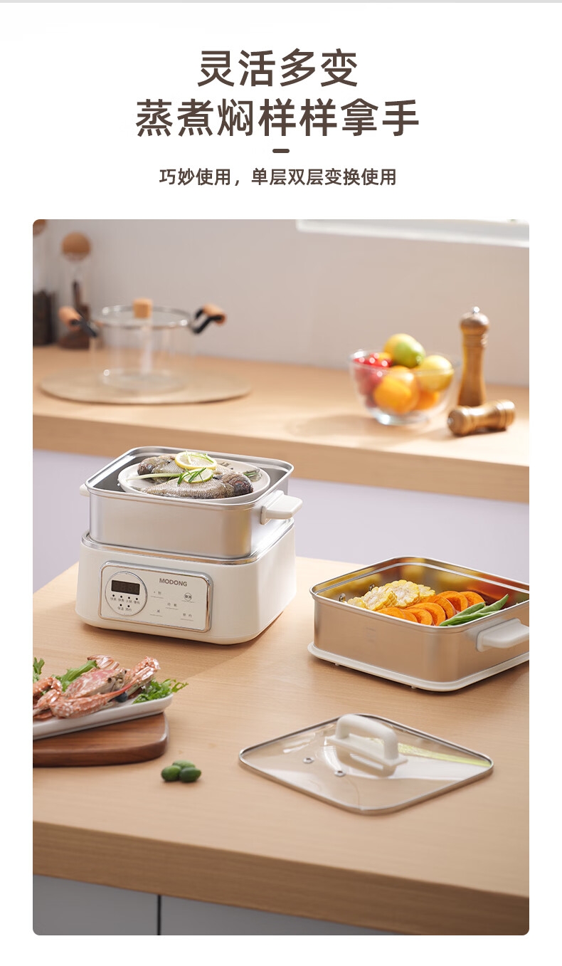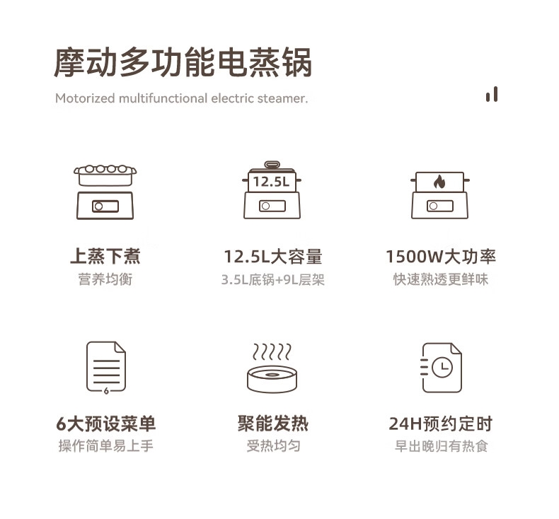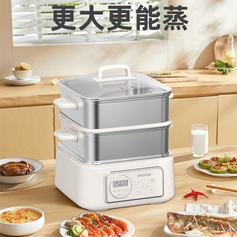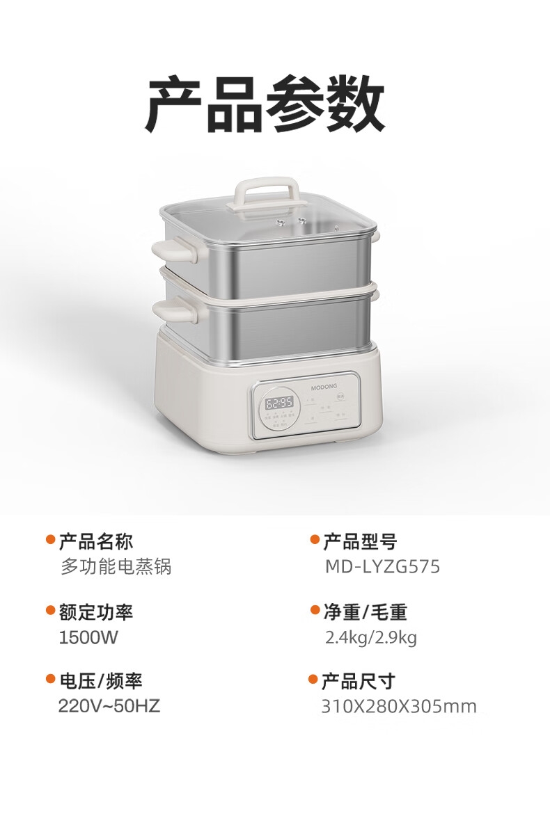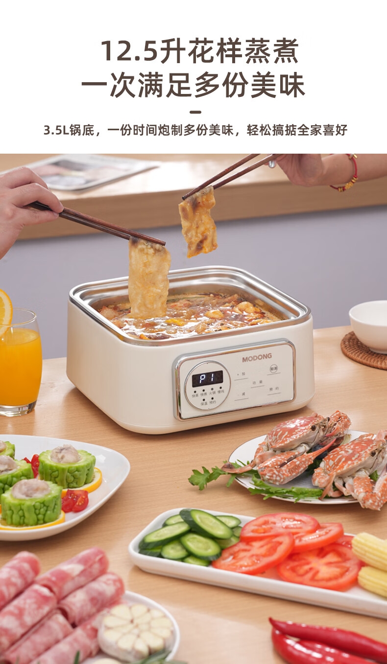 【上蒸下煮】蒸、煮、焖、炖、火锅,一锅多用;【1500W】大功率高效加热,功率可调。;12.5L,大容量蒸鱼蒸饭蒸菜四菜一汤连主食一锅出