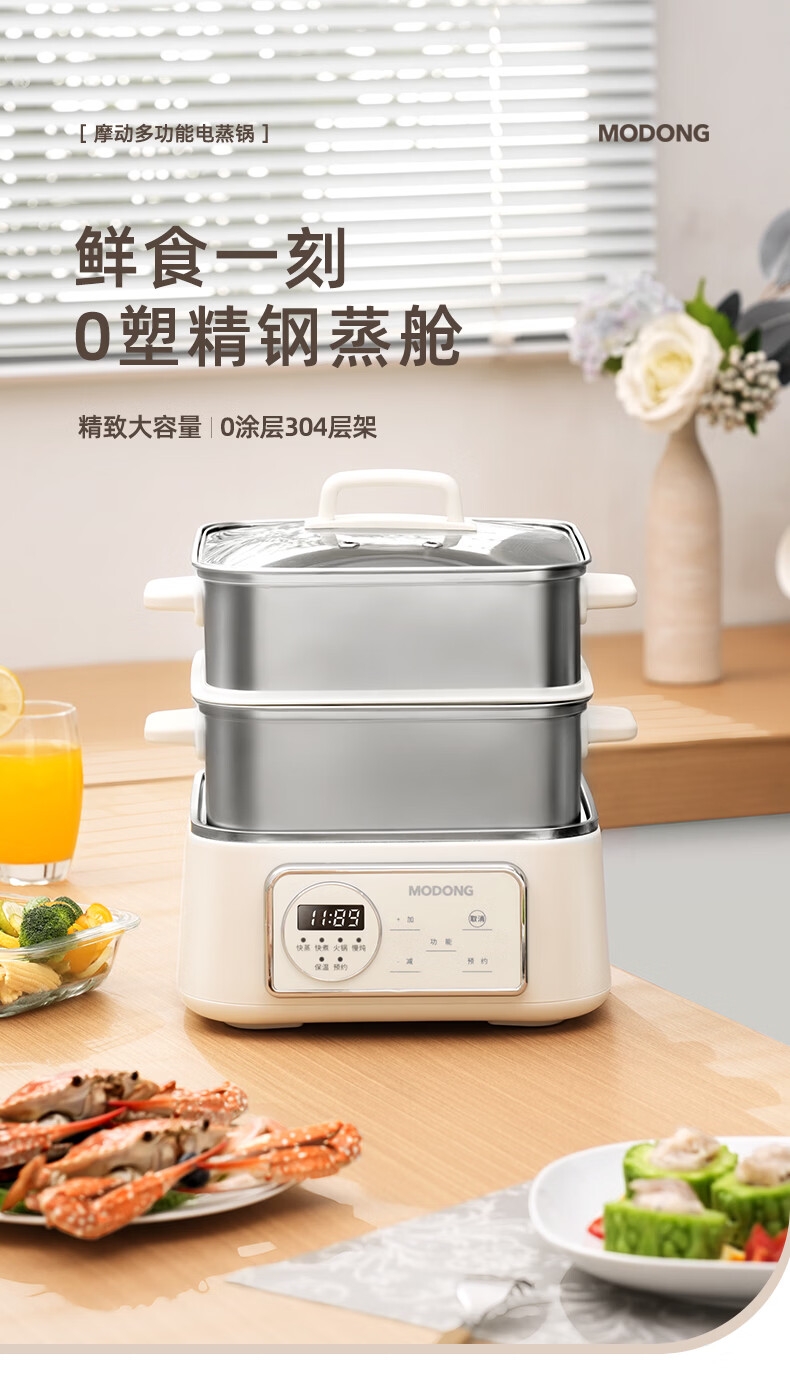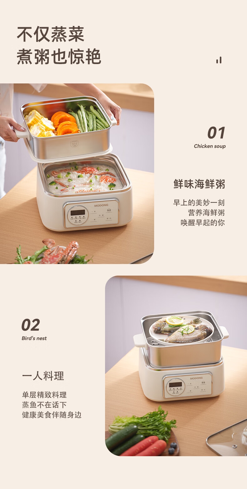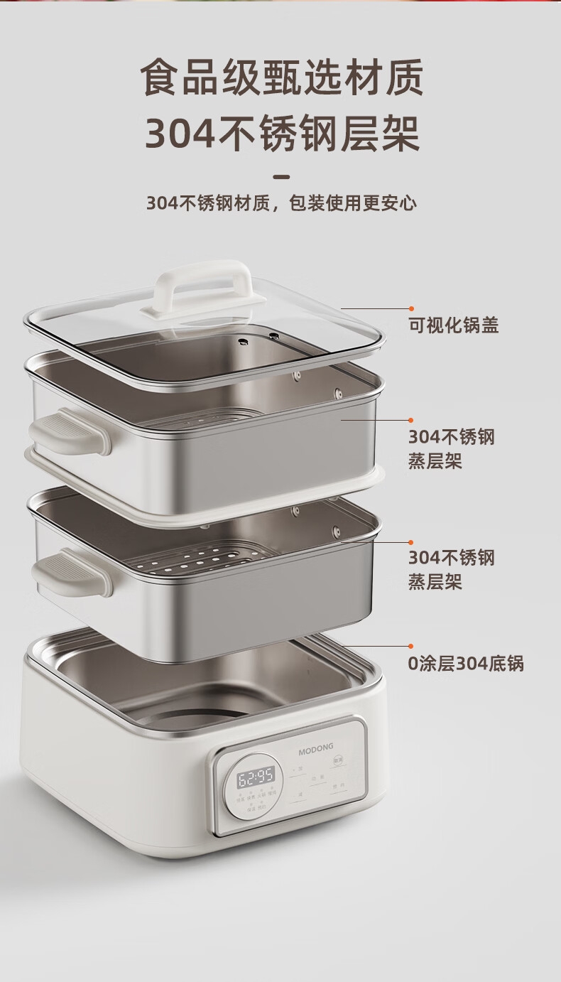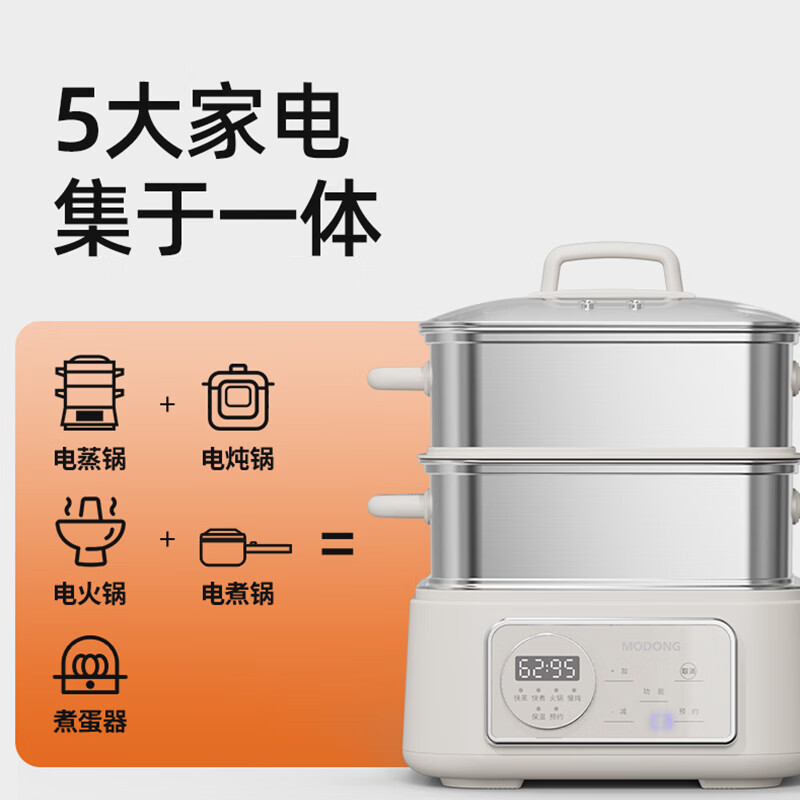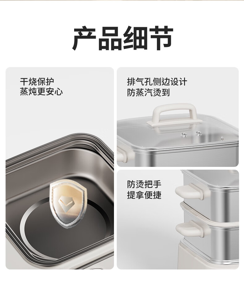 【上蒸下煮】蒸、煮、焖、炖、火锅,一锅多用;【1500W】大功率高效加热,功率可调。;12.5L,大容量蒸鱼蒸饭蒸菜四菜一汤连主食一锅出