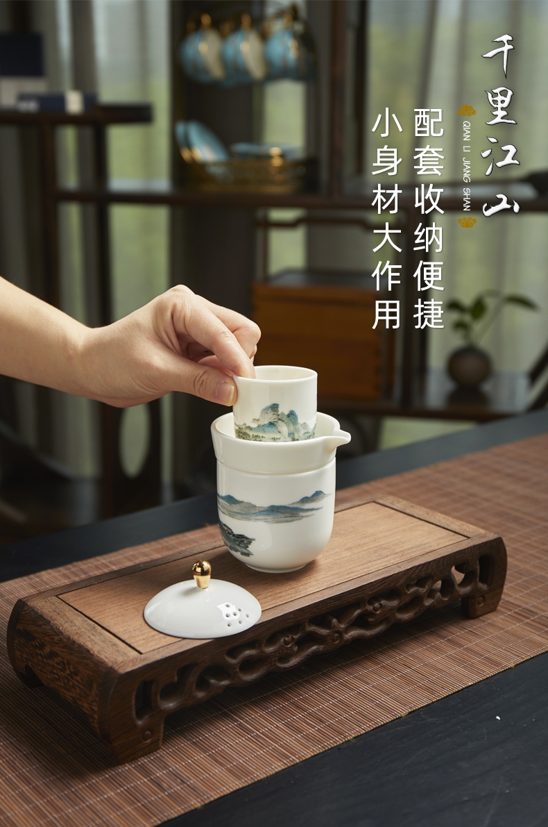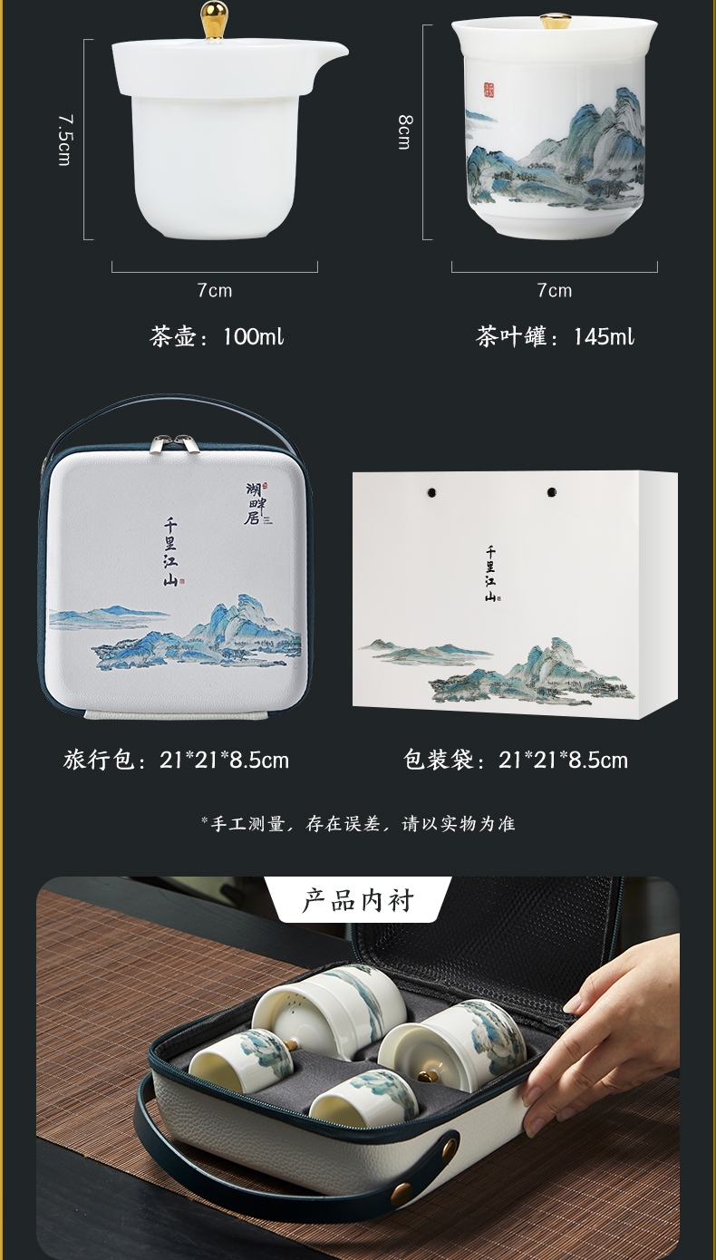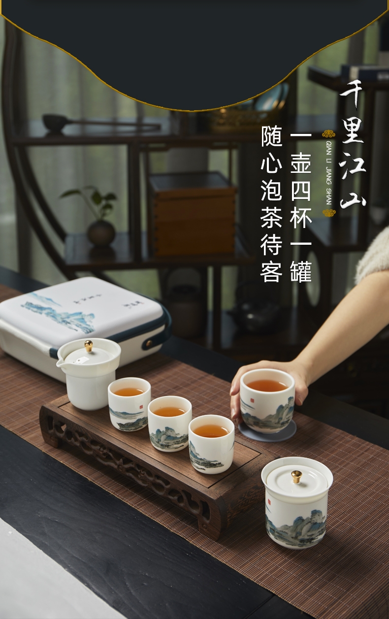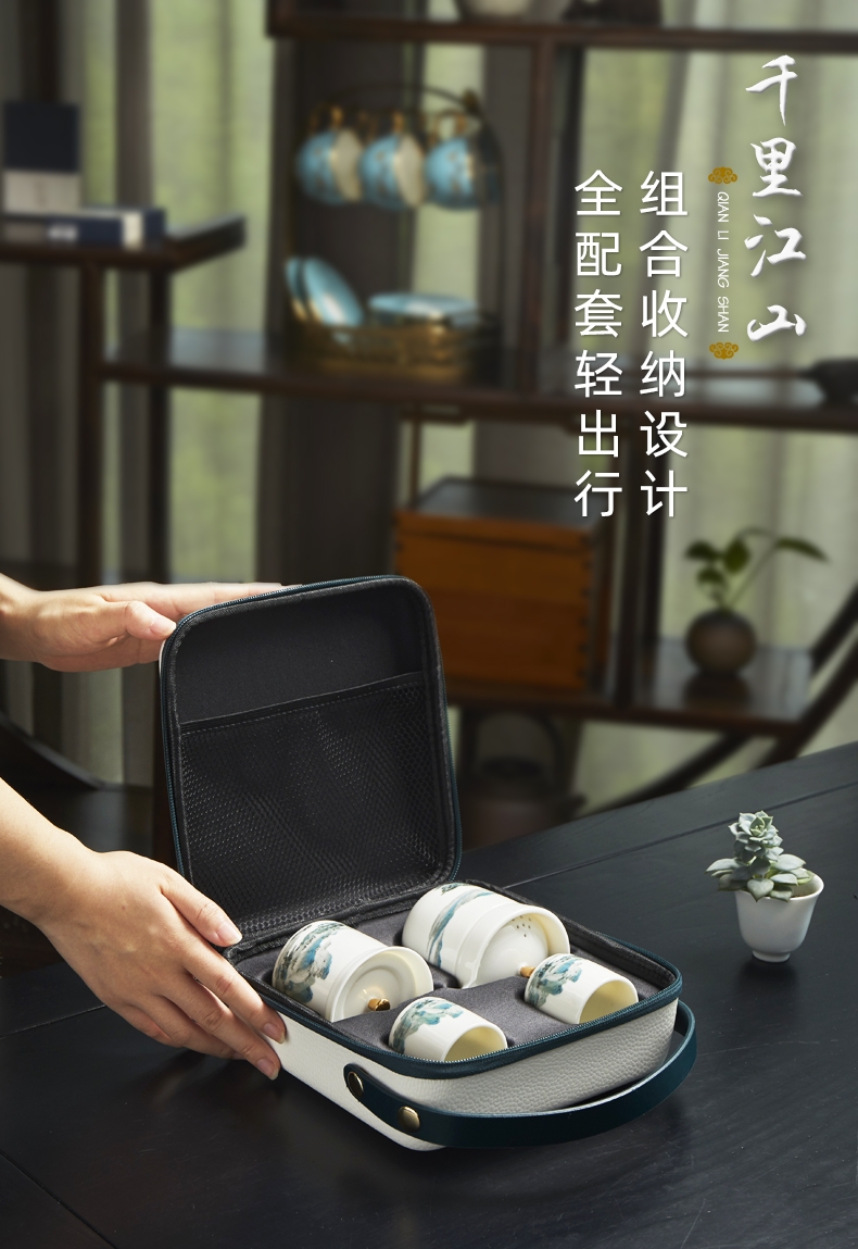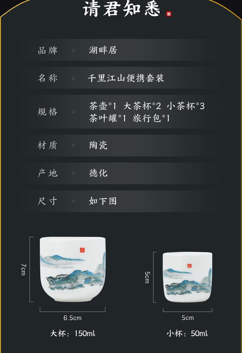 茶艺小套装,一套多件;茶具采用德化白瓷,纯净温润、致密度高,白皙如玉;茶器搭配小收纳包,即提即走悠然成席,尽享茶趣