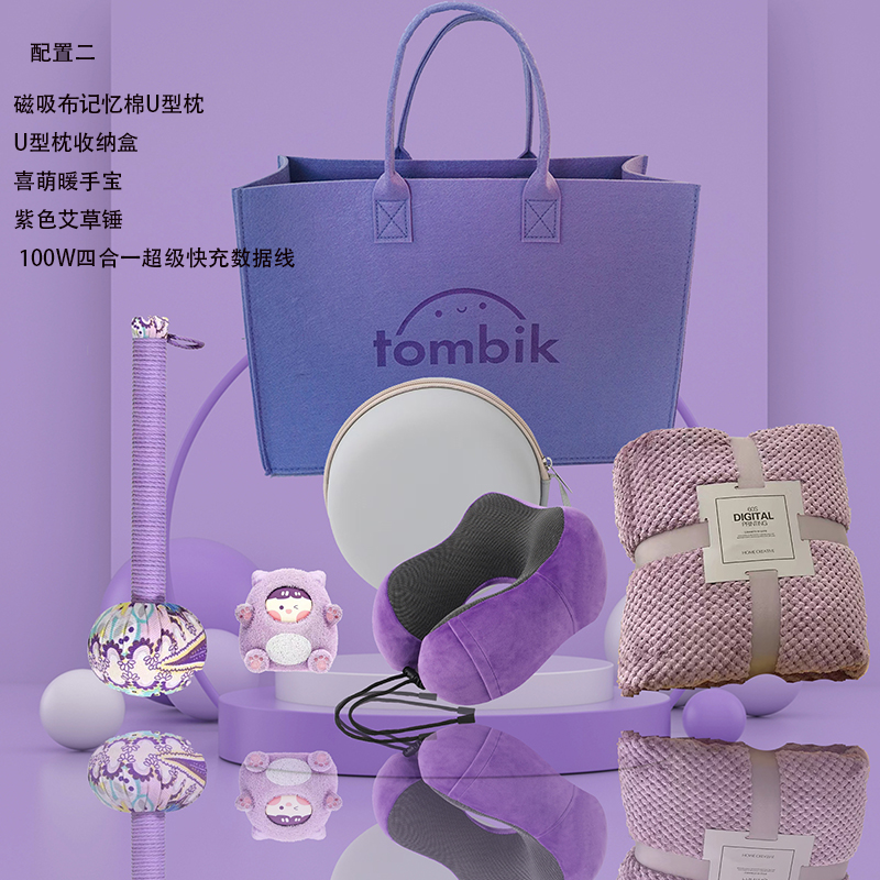 配置二:磁吸布记忆棉U型枕 U型枕收纳盒 喜萌暖手宝 紫色艾草锤 100W四合一超级快充数据线
