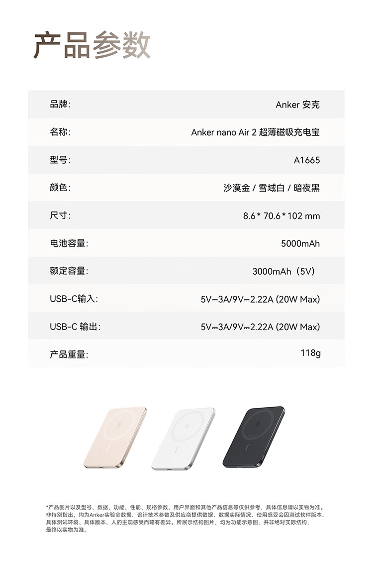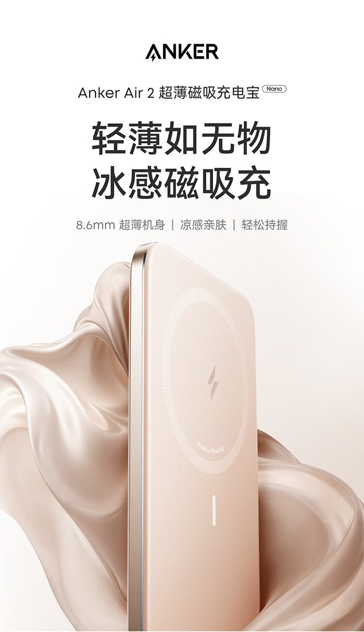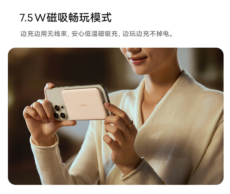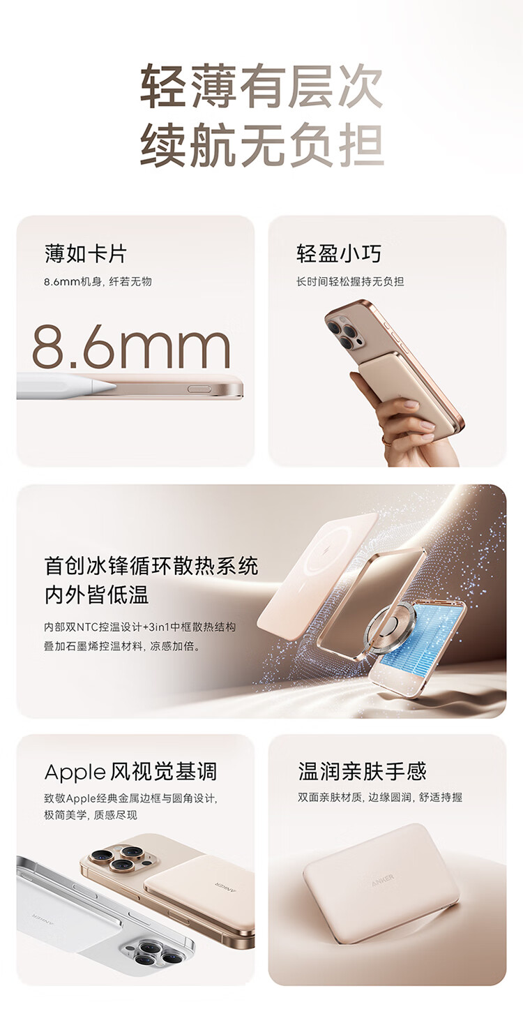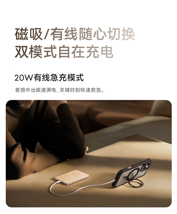 磁吸/有线随心切换,双模式自在充电;20W有线急充模式;一贴即充,无缝贴合,磁吸不滑脱;苹果同款电芯,绝配你的iPhone;薄如卡片,8.6mm机身,纤若无物