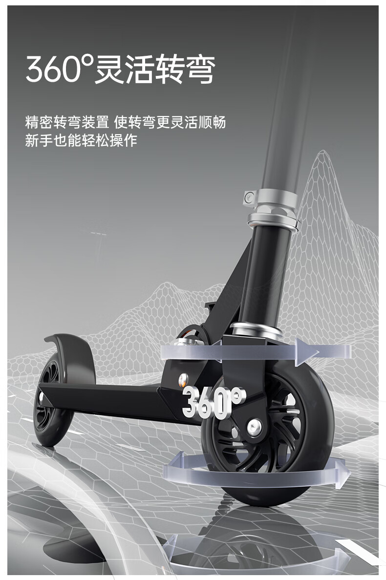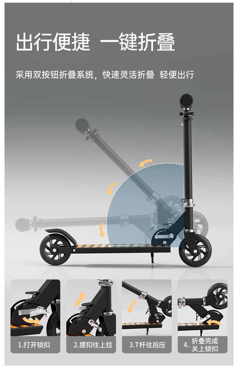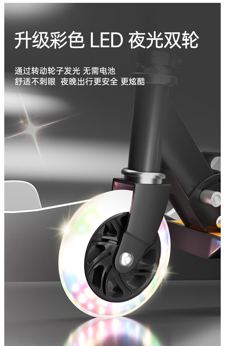 采用双按钮折叠,快速灵活,出行便捷;后轮刹车装置,灵敏稳固,想停就停;升级彩色LED发光双轮,转动发光,无需电池